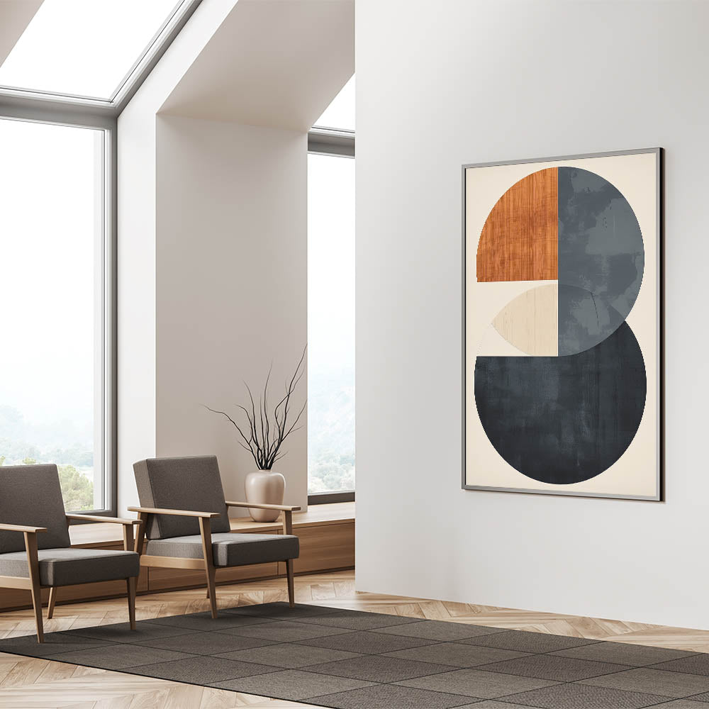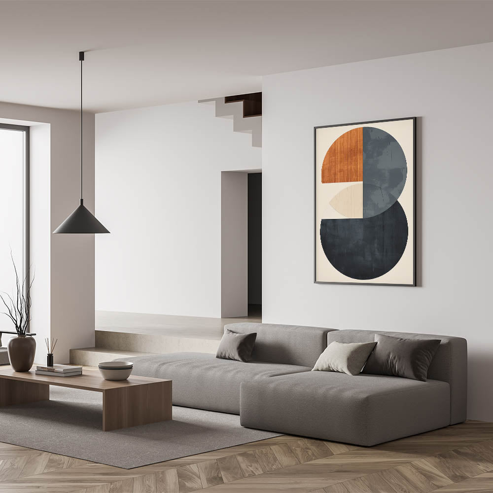 Elevate your decor with this modern geometric circle art, featuring a dynamic arrangement of semicircles in black, gray, beige, and vibrant orange. This minimalist design brings a balanced composition of colors and textures, creating a striking yet refined focal point for any contemporary interior. Its clean lines and warm tones make it ideal for adding a touch of modern sophistication to your space.