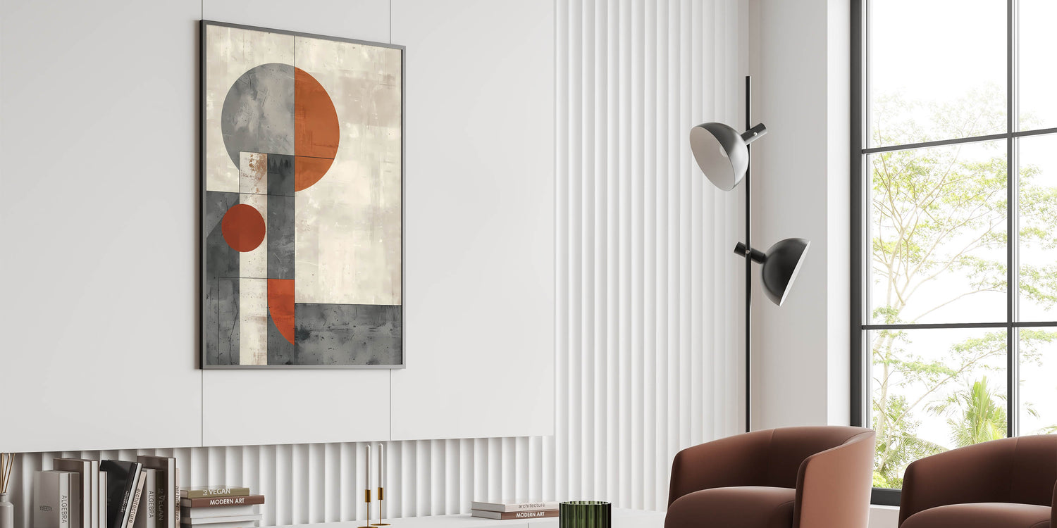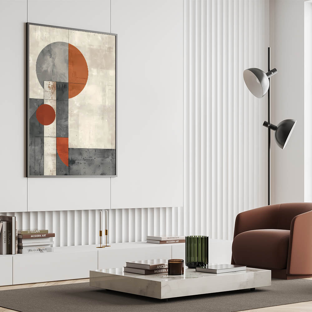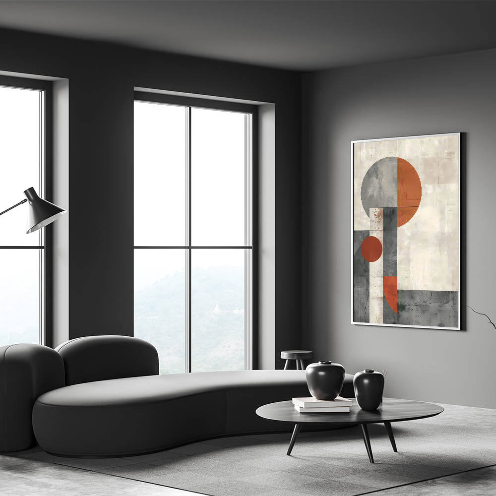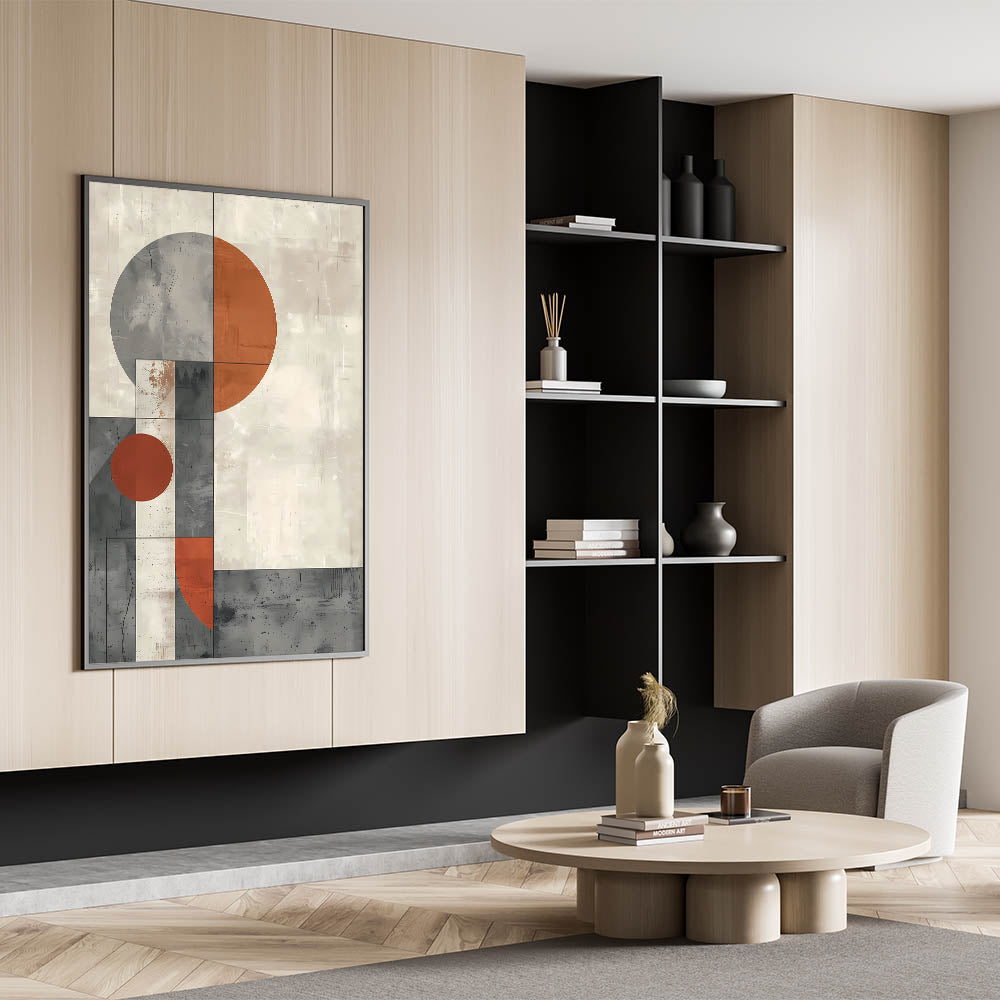 Introduce a bold statement to your decor with this modern geometric abstract art, featuring striking burnt orange and gray tones. The piece’s structured shapes and layered textures create a sense of depth, adding a contemporary edge to any room. Available in a variety of formats, including stretched canvas, acrylic glass, and framed prints, this artwork is ideal for those who appreciate unique and modern decor.