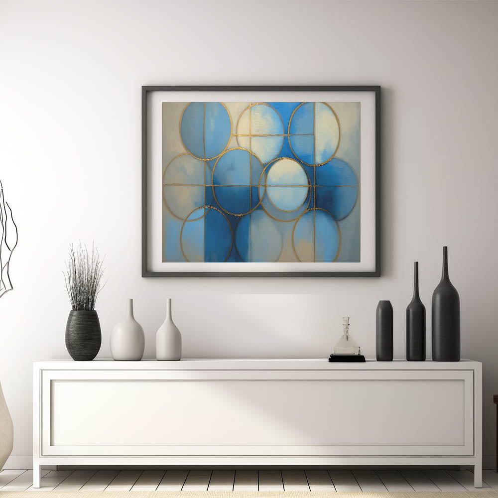 Transform your walls with this captivating Geometric Abstract Wall Art, featuring an elegant interplay of circular shapes outlined in gold against a vibrant blue background. This contemporary piece combines the richness of gold with soothing shades of blue and white, creating a visually striking design perfect for modern interiors.