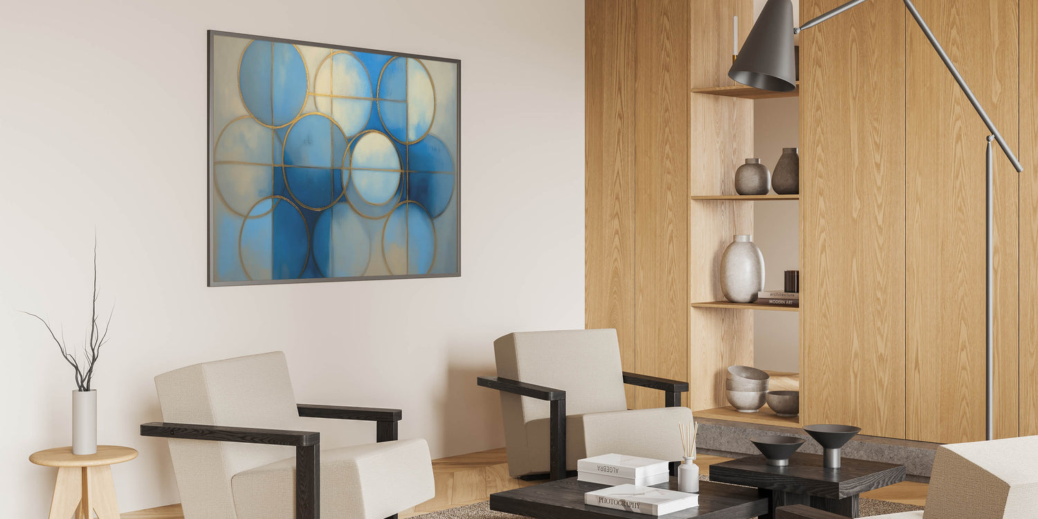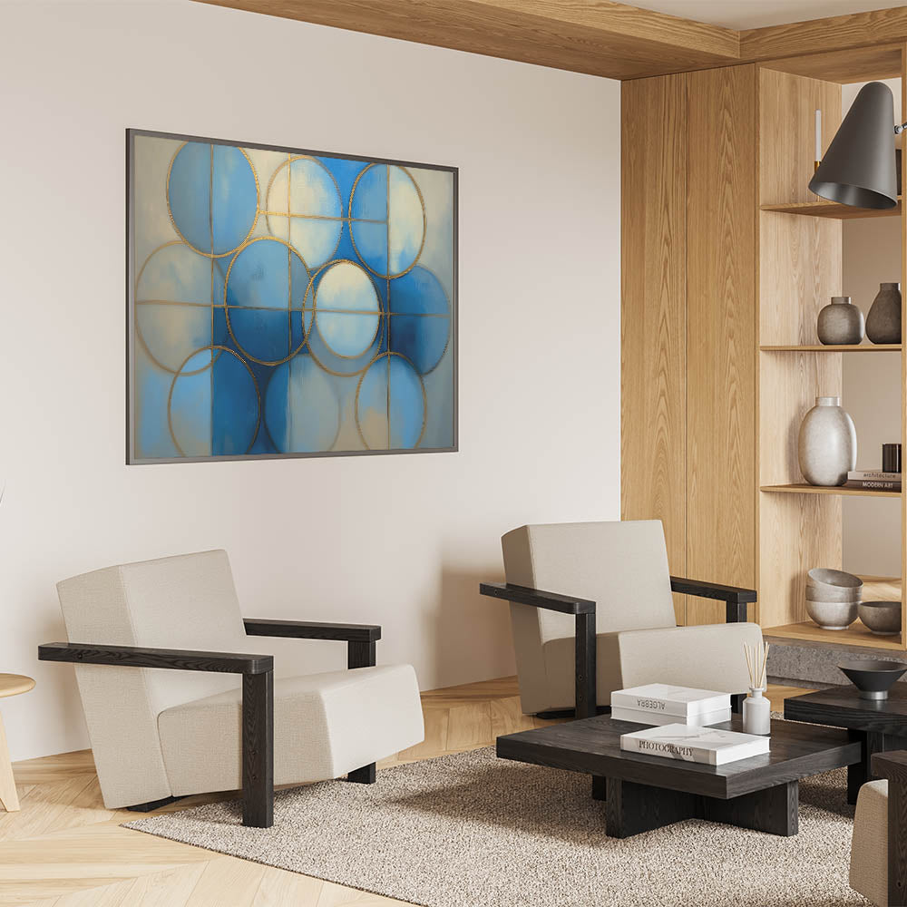This abstract art for living rooms highlights the beauty of clean geometry and vibrant colors. Its luxurious gold accents and soothing blue tones make it a perfect addition for anyone seeking to elevate their decor with a touch of elegance and modernity.