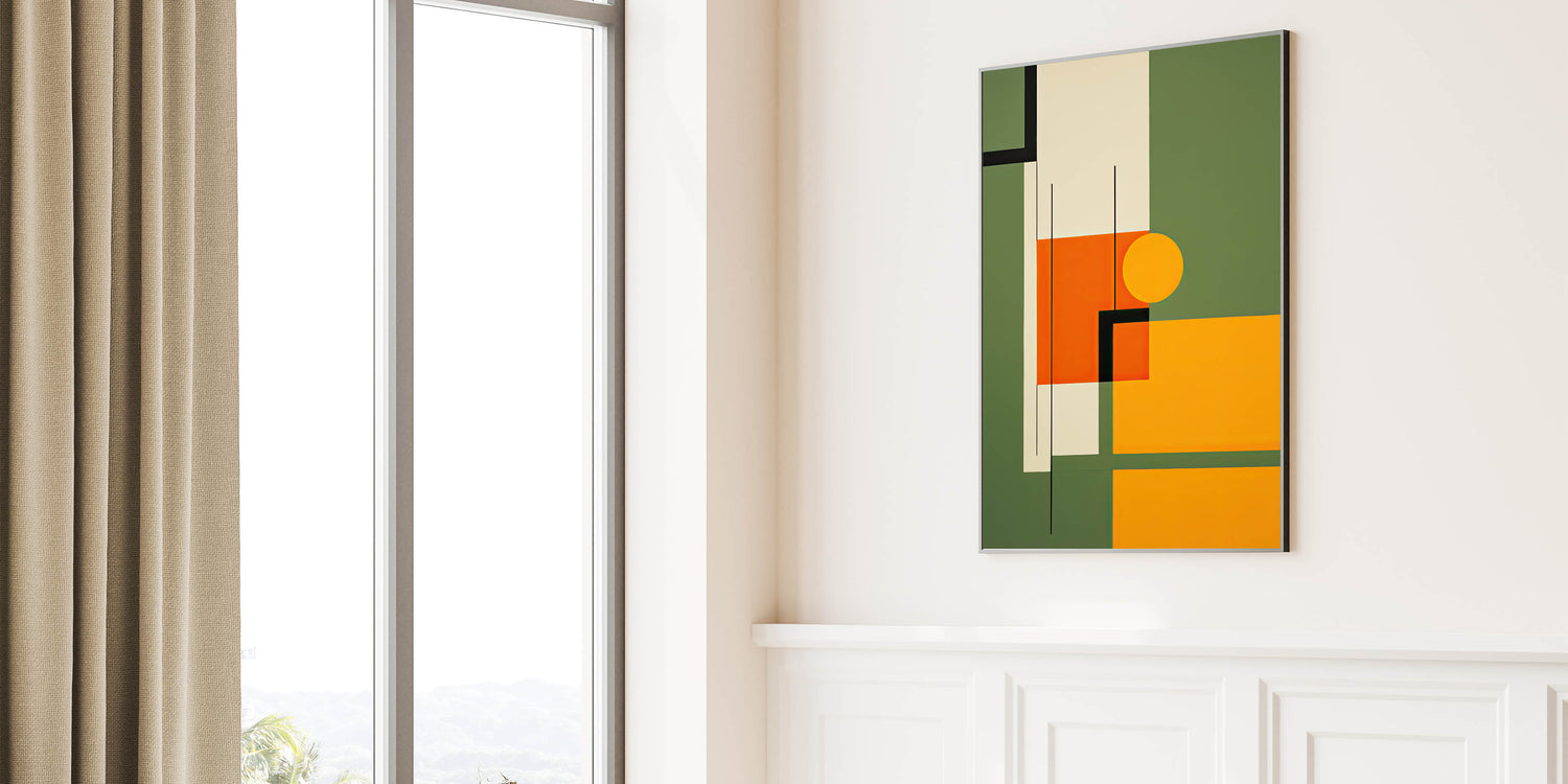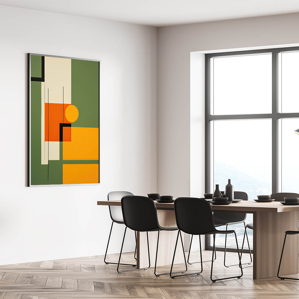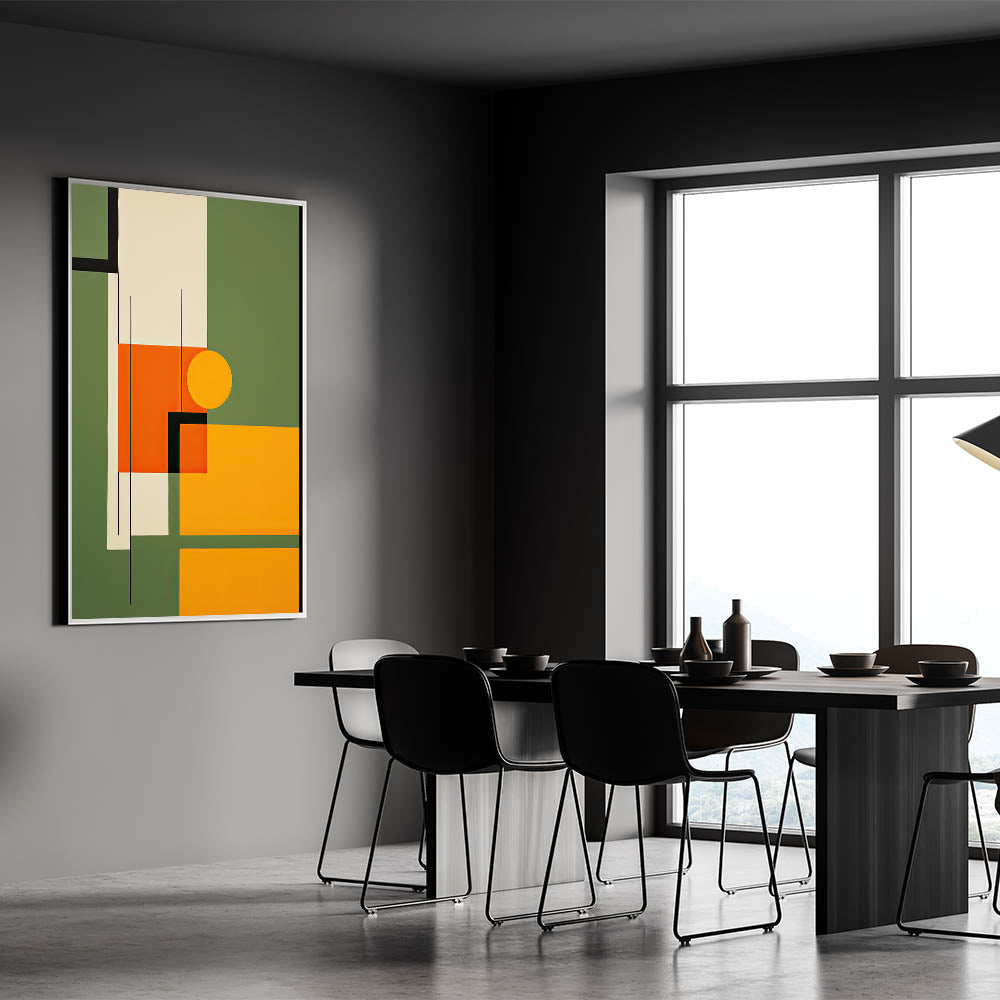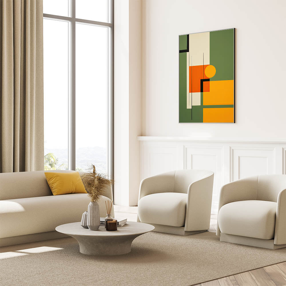Add a bold and modern touch to your space with this minimalist wall art that combines geometric shapes and vibrant colors. The clean lines and balanced composition make this piece stand out while maintaining a minimal art style. Featuring striking orange, green, and yellow elements, this abstract minimalist painting is perfect for those seeking to enhance their space with a contemporary design.