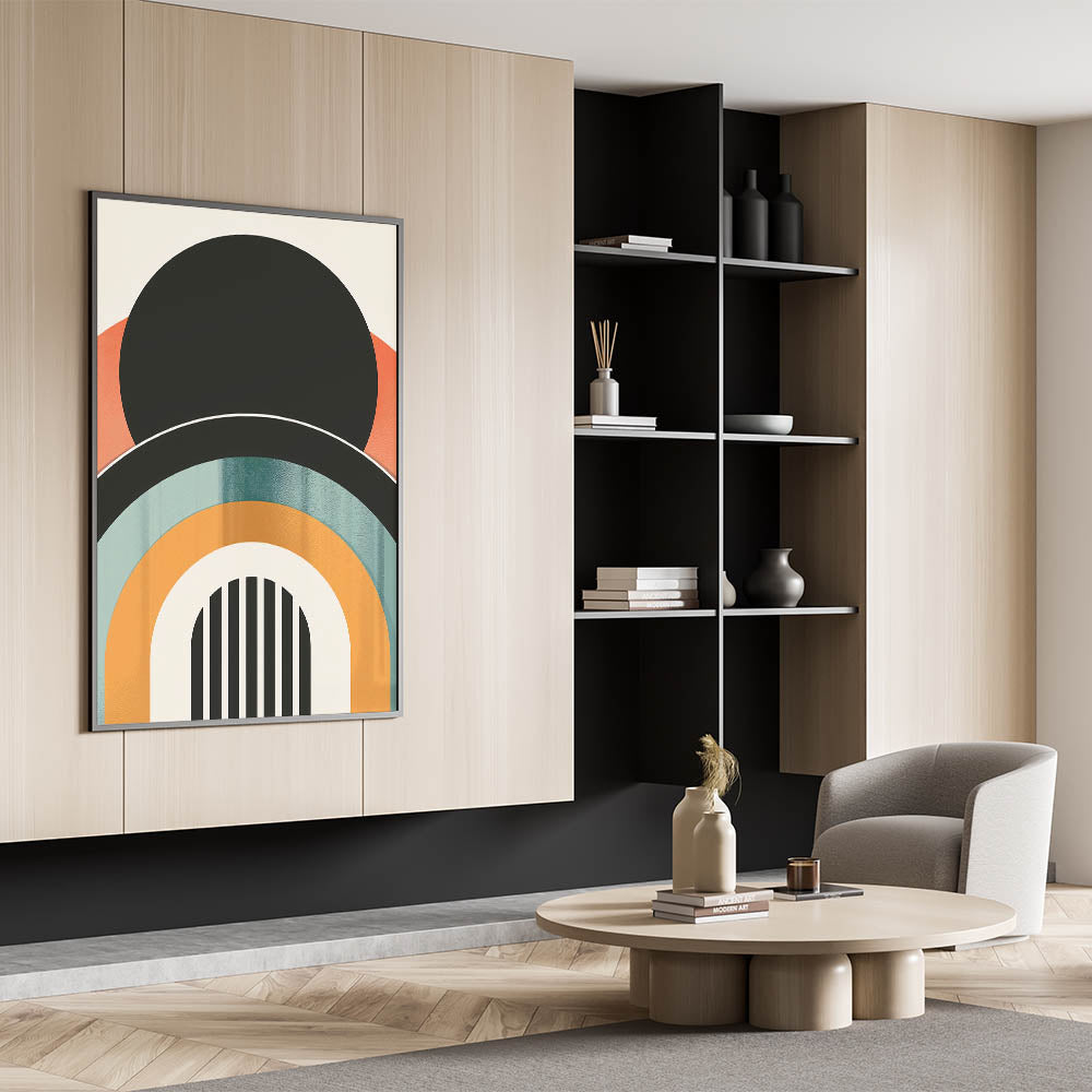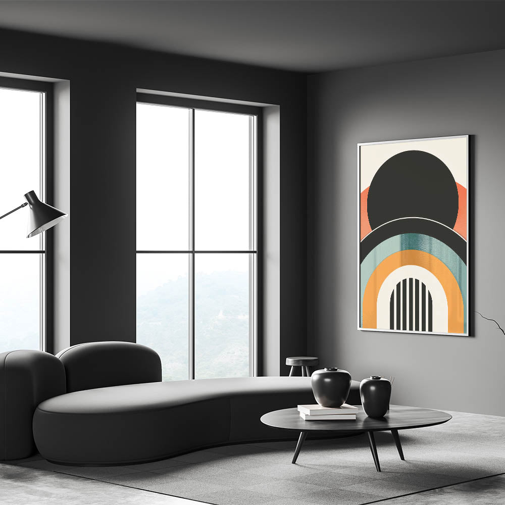 Bring a touch of modern elegance to your space with this captivating piece of Minimalist Abstract Art. This design features a striking combination of bold geometric shapes in black, orange, and teal, arranged in a visually appealing composition. The subtle yet dynamic interplay of colors and shapes creates a sense of balance and harmony, making it a perfect addition to contemporary interiors.