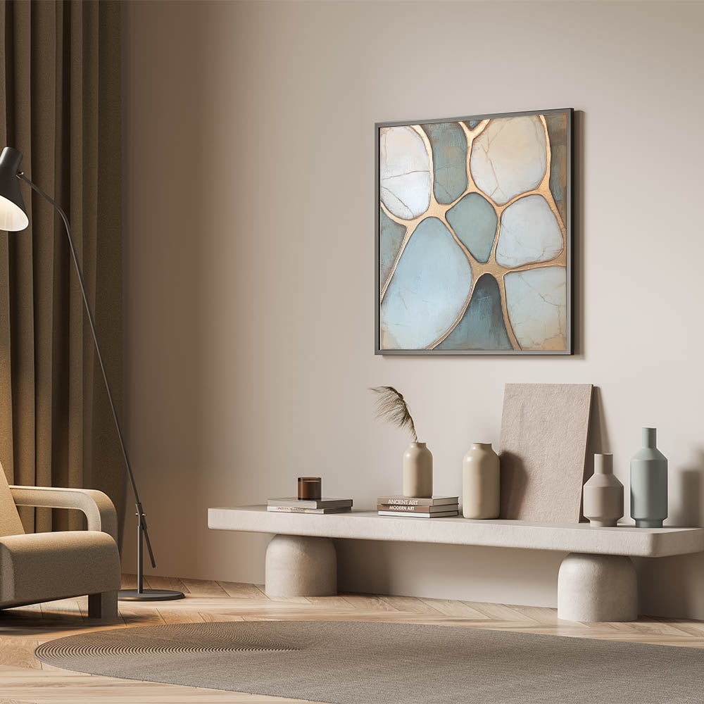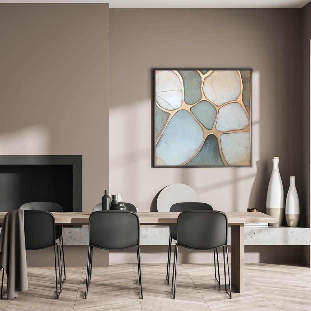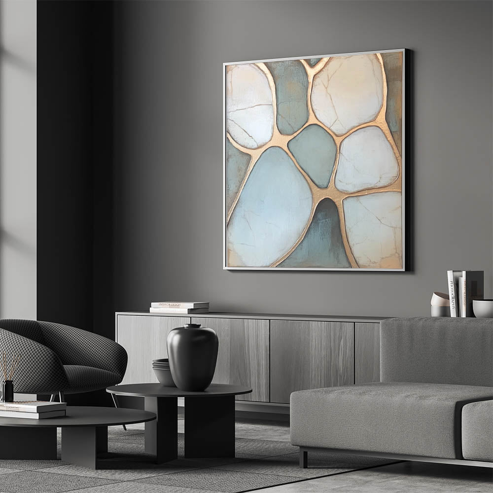 Elevate your space with this sophisticated Geometric Abstract Wall Art inspired by natural pebble formations. Featuring soothing tones of light blue and white, enhanced by shimmering gold outlines, this artwork strikes the perfect balance between organic elegance and modern design. The intricate geometric patterns create a calming visual flow, making it ideal for contemporary or minimalist interiors. Perfect for living rooms, bedrooms, or offices, this piece seamlessly complements any decor.