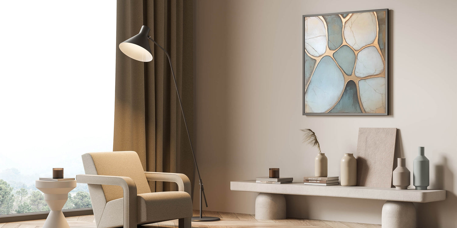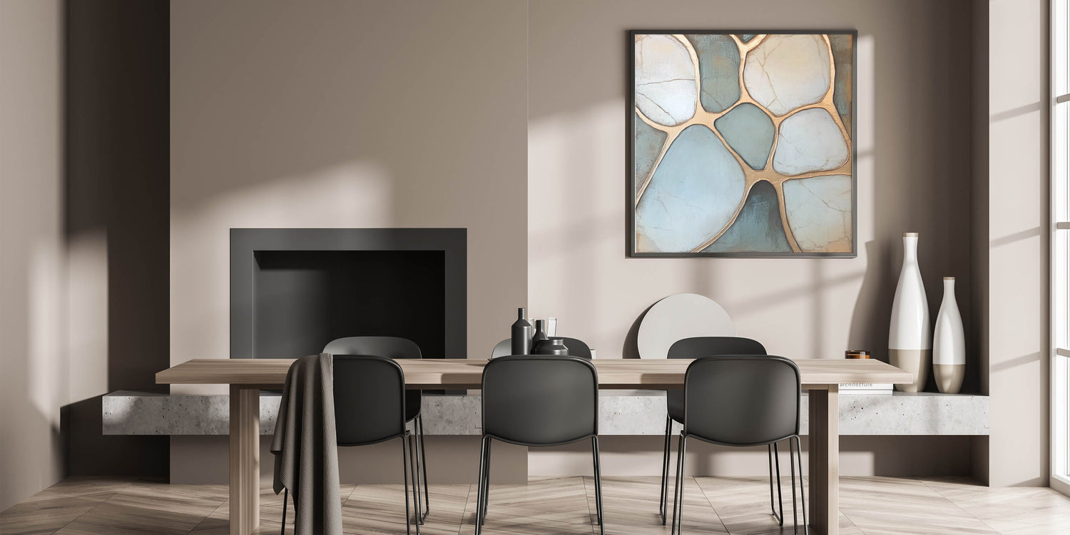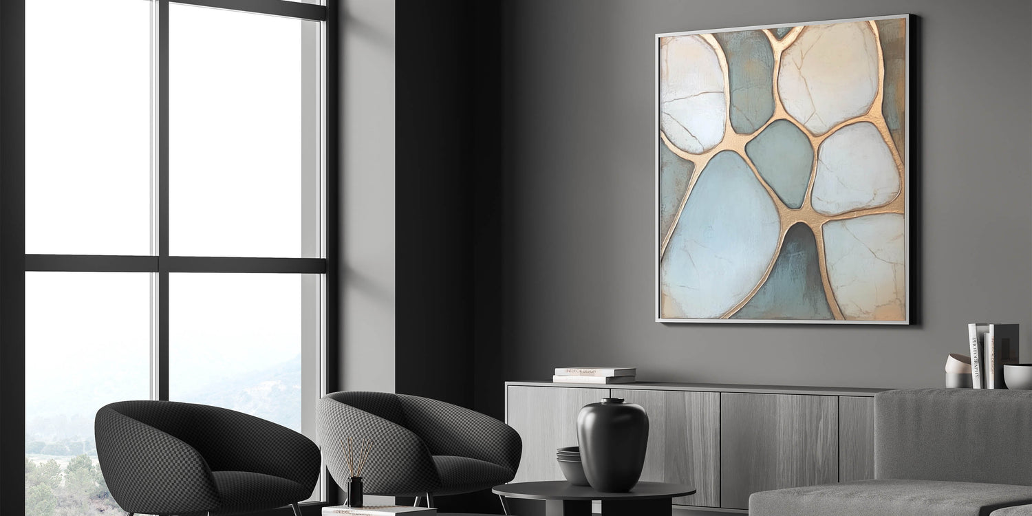Elevate your space with this sophisticated Geometric Abstract Wall Art inspired by natural pebble formations. Featuring soothing tones of light blue and white, enhanced by shimmering gold outlines, this artwork strikes the perfect balance between organic elegance and modern design. The intricate geometric patterns create a calming visual flow, making it ideal for contemporary or minimalist interiors. Perfect for living rooms, bedrooms, or offices, this piece seamlessly complements any decor.