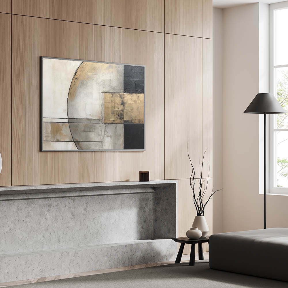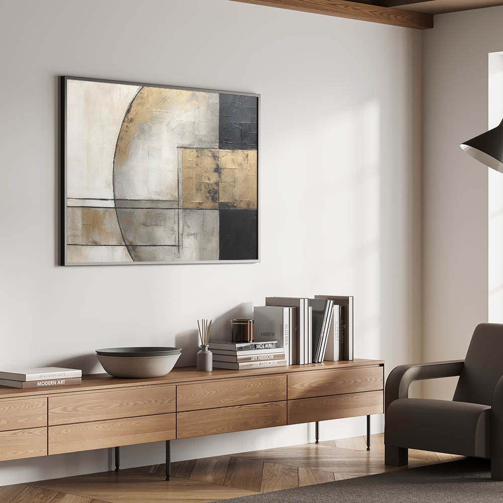 Enhance your space with this stunning Modern Strokes and Lines Abstract Art on Canvas, a captivating piece that seamlessly blends geometric line designs with contemporary brush strokes. This artwork features a dynamic interplay of black, white, and gold tones, creating a sophisticated and modern aesthetic. The bold lines and geometric shapes bring depth and movement to the piece, making it a perfect focal point for any room.
