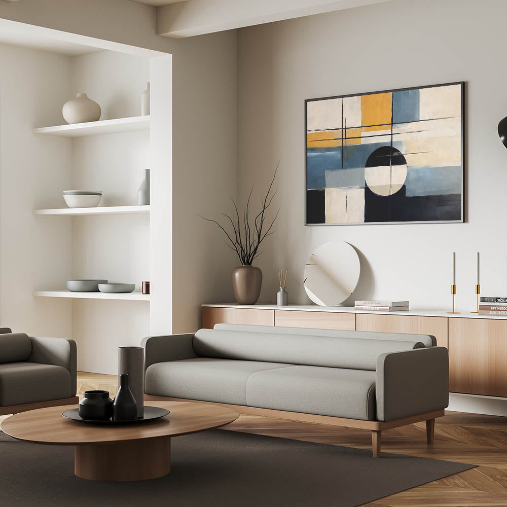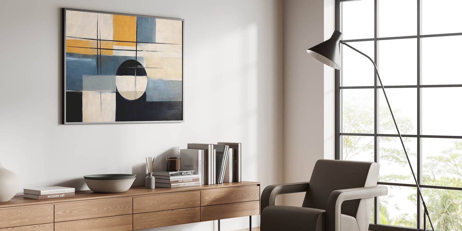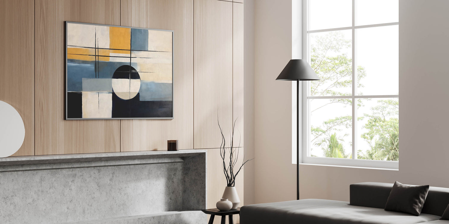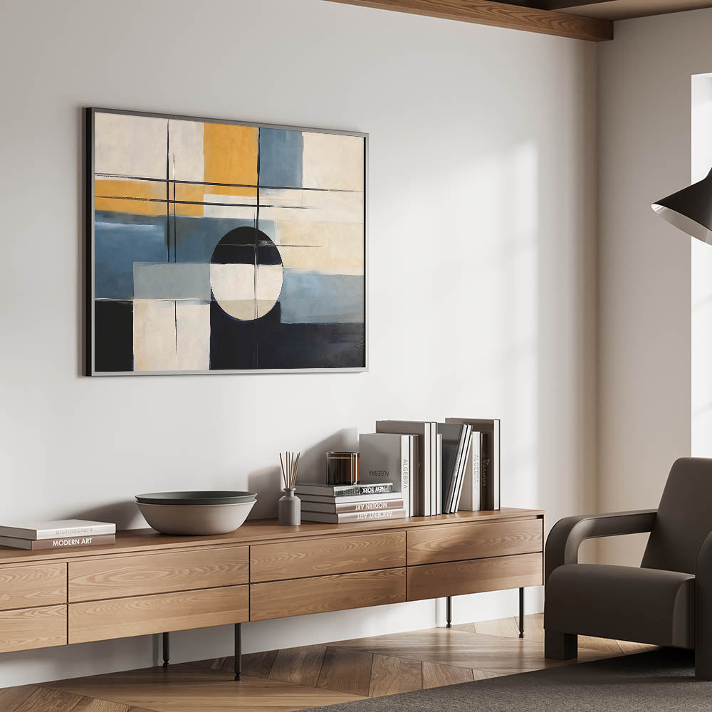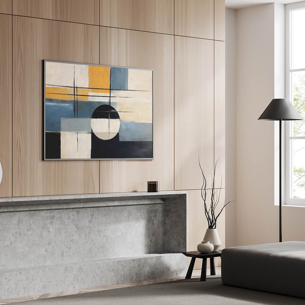 Elevate your space with this dynamic strokes and lines abstract art piece that blends modern design with geometric elements. The composition features bold brush strokes and clean lines, creating a balanced yet striking visual impact. The palette combines rich blue and black tones with warm mustard and neutral shades, making it a versatile addition to any room.