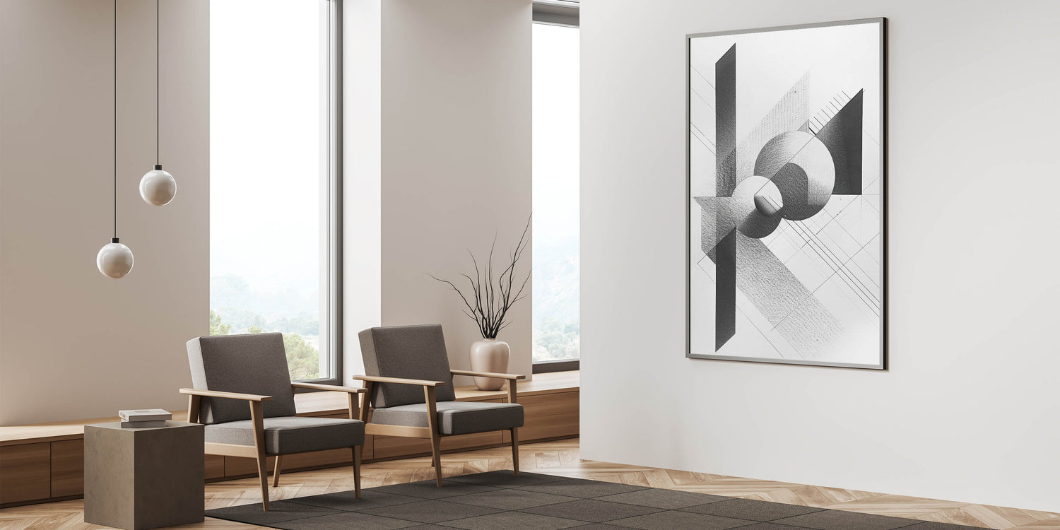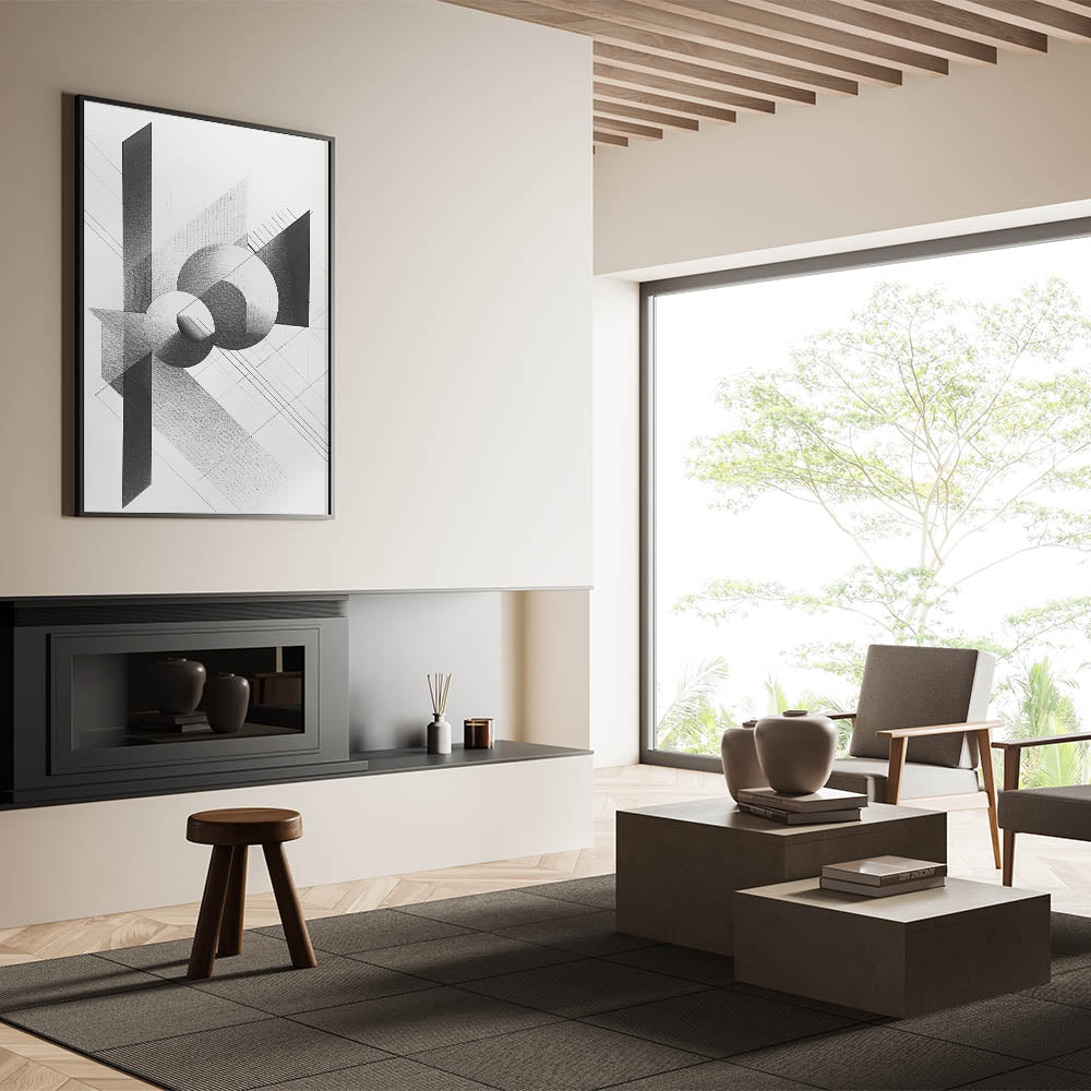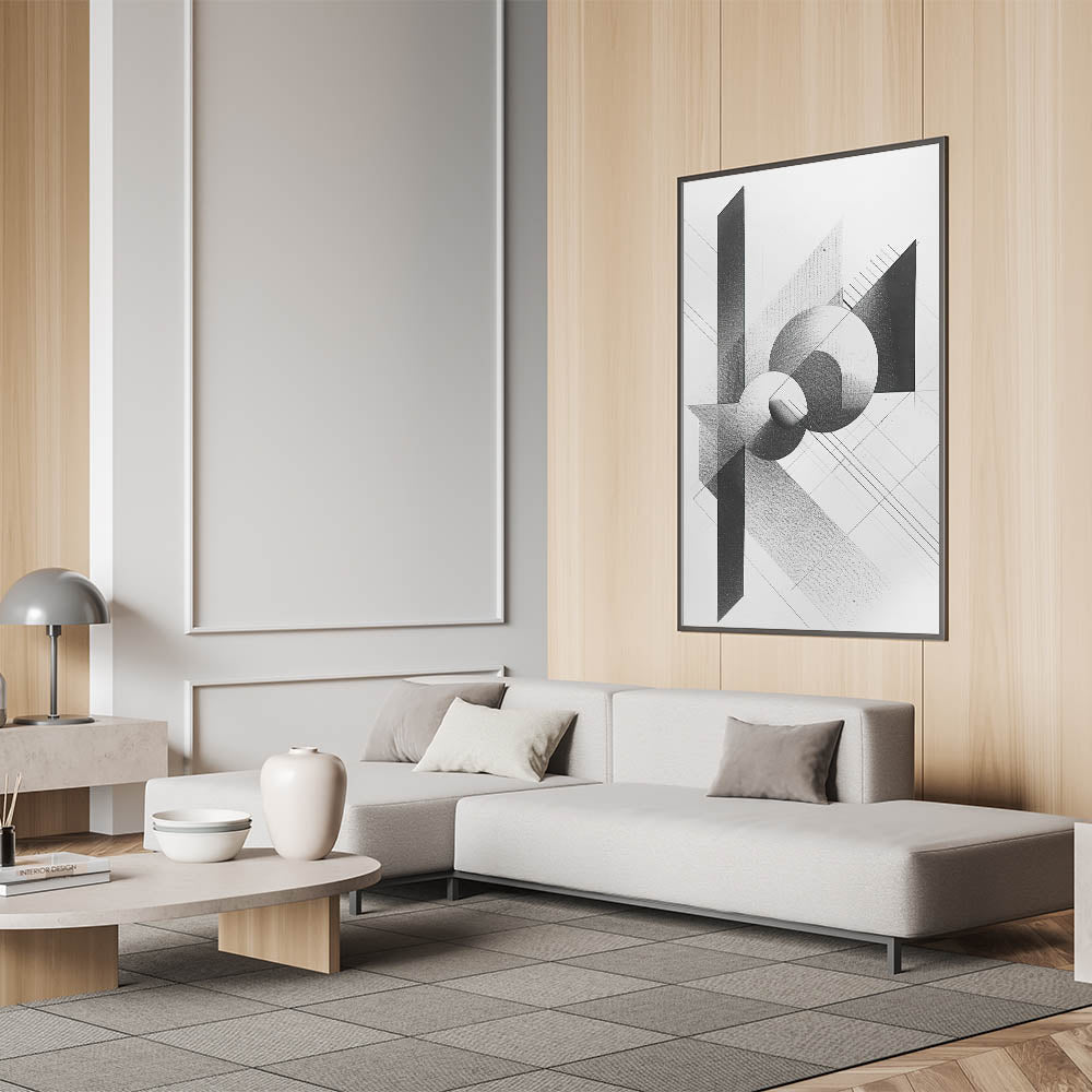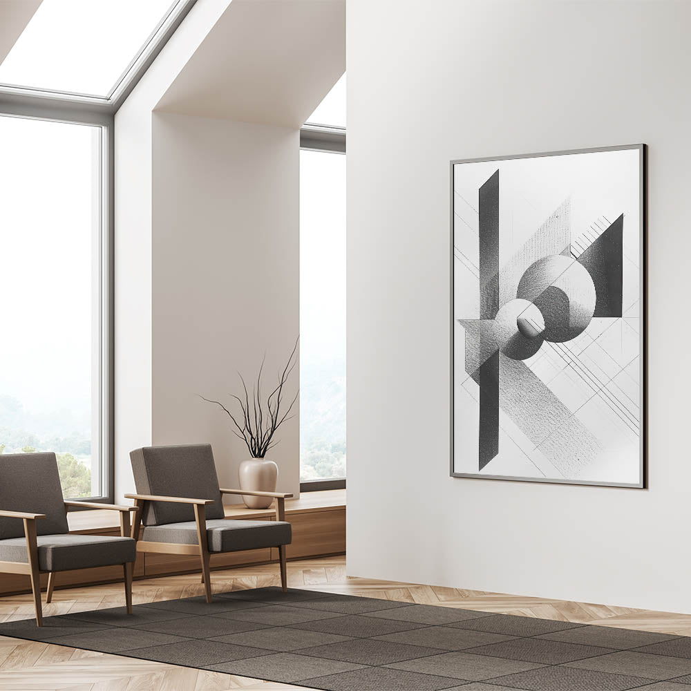 Bring a touch of modern sophistication to your space with this Monochrome Geometric Abstract Art. Featuring sharp lines, intersecting shapes, and a gradient of black, white, and gray tones, this artwork showcases precision and minimalist elegance. Its clean, architectural style makes it perfect for contemporary and industrial interiors, adding a sense of depth and refinement to any room.