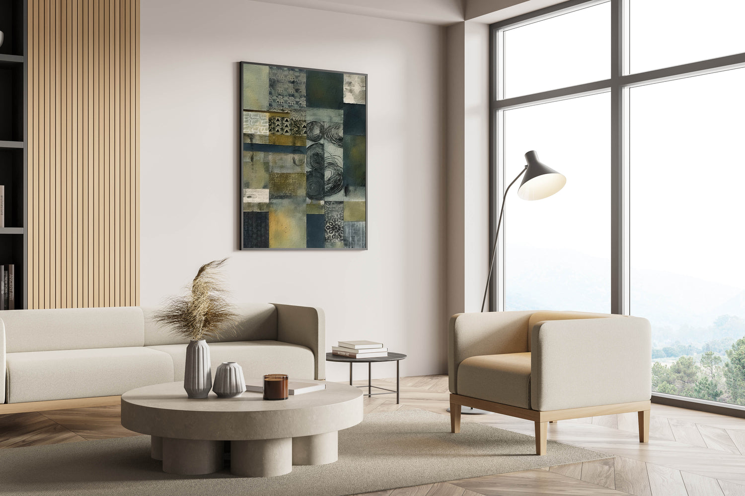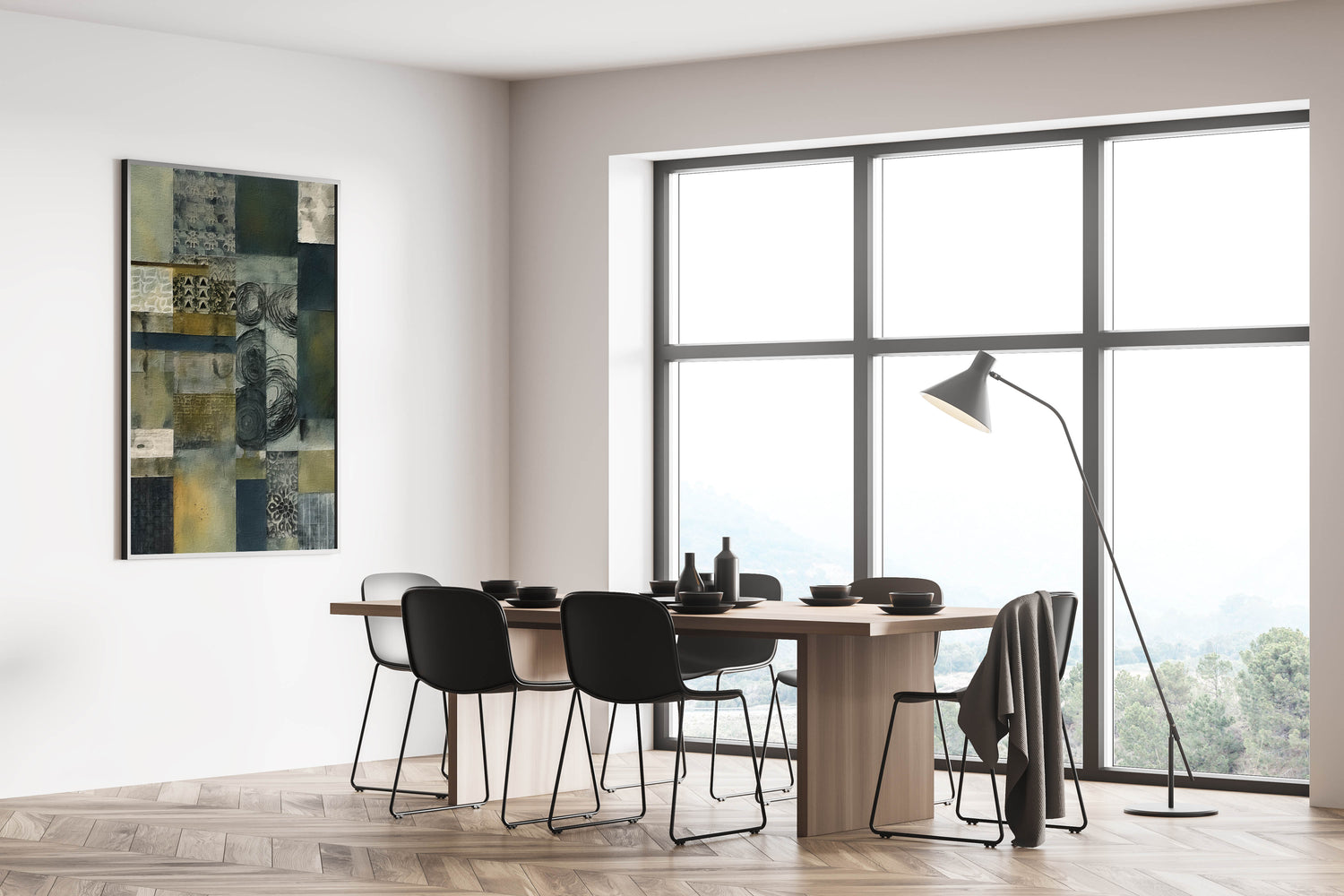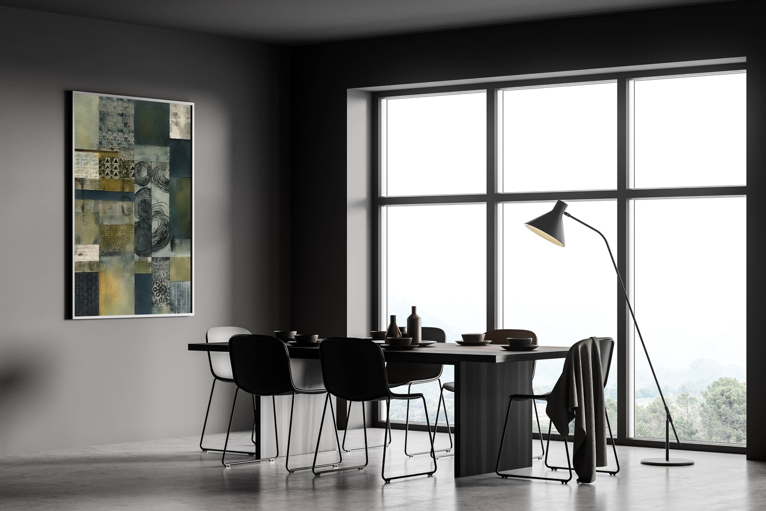 Bring a sense of depth and texture to your decor with this Patchwork Geometric Abstract Art. The design features a rich blend of deep green, muted blue, and gray, creating a captivating patchwork of patterns and shapes. The layered textures include geometric lines and organic swirls, offering a dynamic and visually engaging composition. This piece is perfect for those who appreciate a blend of rustic and modern aesthetics.