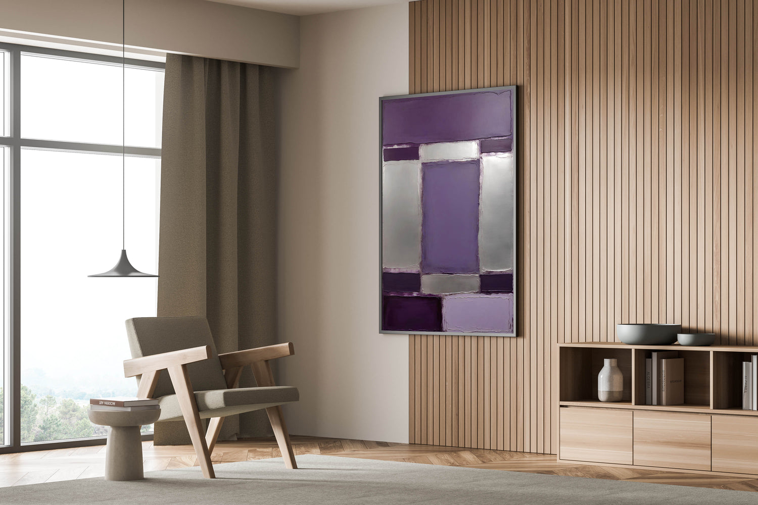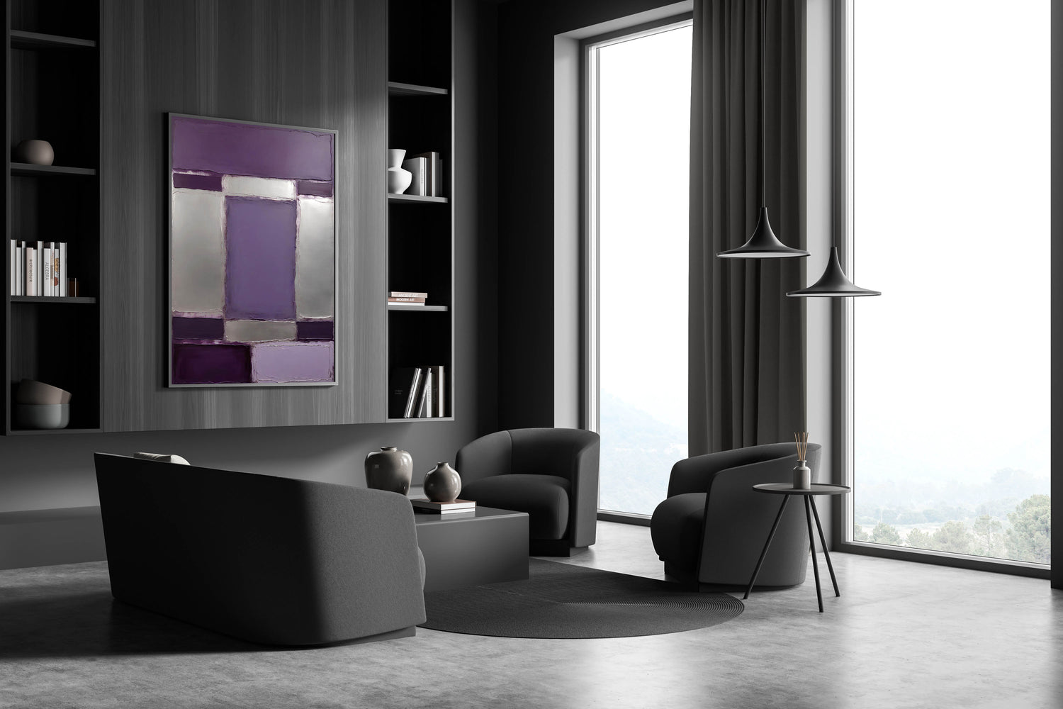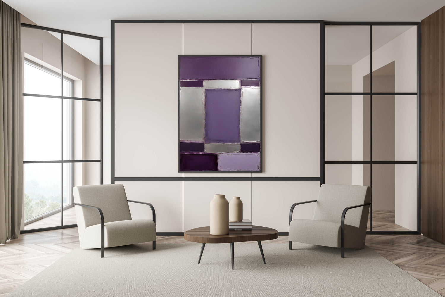 Introduce a touch of contemporary elegance to your space with this stunning geometric abstract art piece, featuring bold strokes and lines in rich plum and sleek silver-gray tones. This minimalist design showcases rectangular blocks that create a visually captivating balance, perfect for enhancing the ambiance of any modern or minimalist setting.