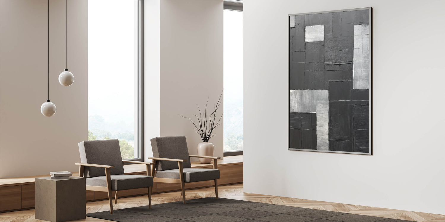 Add a sleek, modern touch to your space with this textured black and silver geometric art. Featuring a structured arrangement of rectangles in deep black and varying shades of silver, this minimalist piece offers an intriguing mix of texture and contrast. Perfect for contemporary interiors, this artwork creates visual interest while maintaining a clean and balanced aesthetic, ideal for those who appreciate minimalist decor.