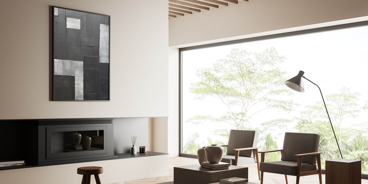 This abstract artwork is a sophisticated addition to any room, from living spaces to professional settings. Its monochromatic palette and textured finish add depth and style, making it a timeless piece that enhances any decor.