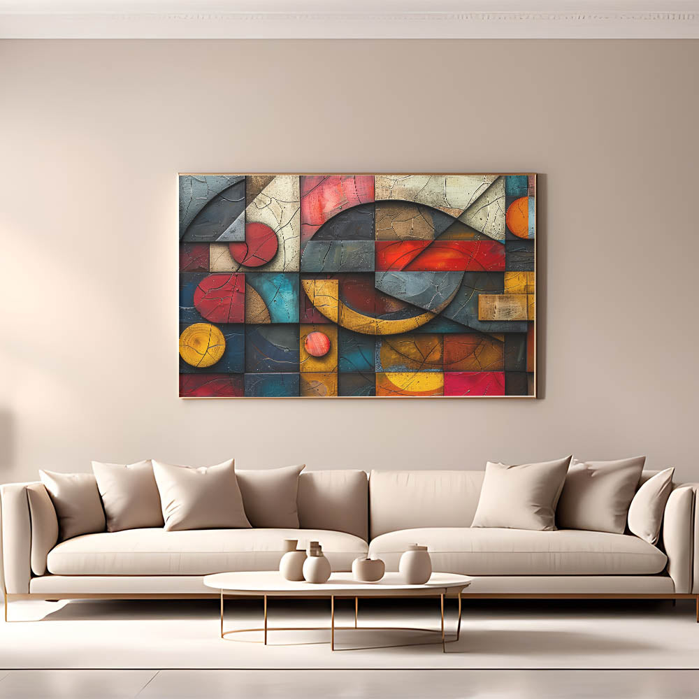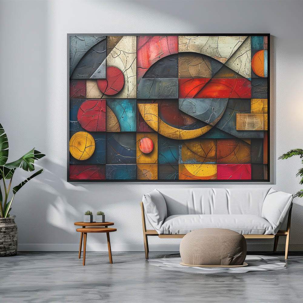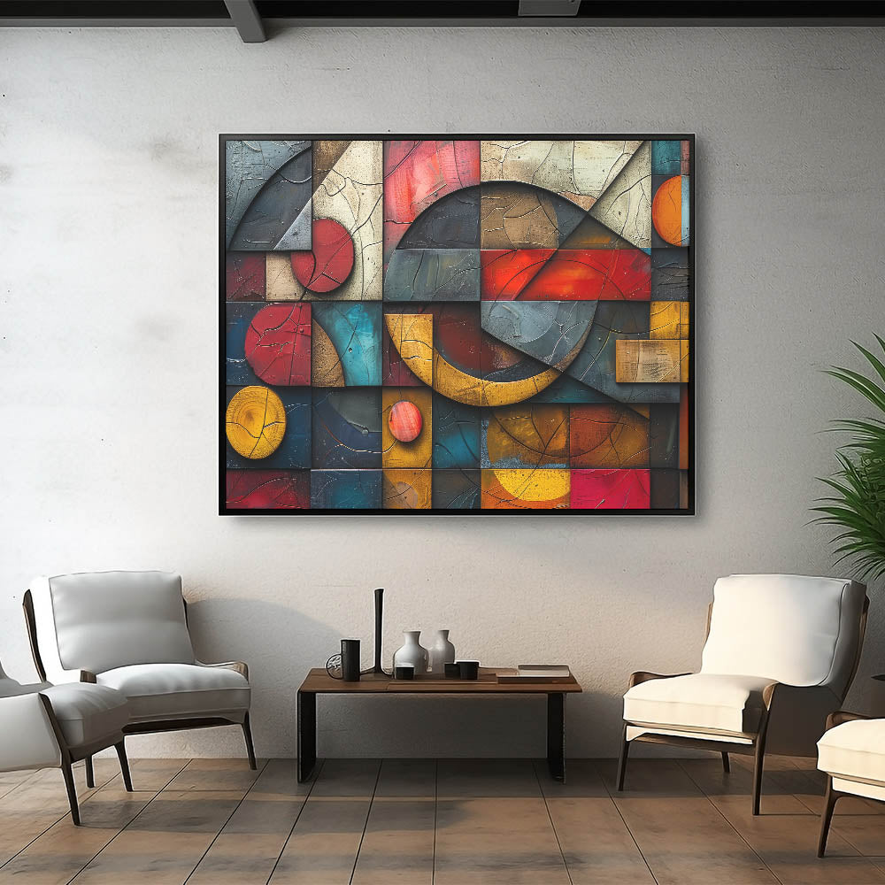 Elevate your space with this captivating textured geometric abstract expressionist wall art. This piece combines bold geometric shapes with a rich, textured surface, creating a visually engaging composition that draws the eye. The artwork features a vibrant color palette with deep blues, rich reds, warm yellows, and subtle grays, adding depth and warmth to any room.