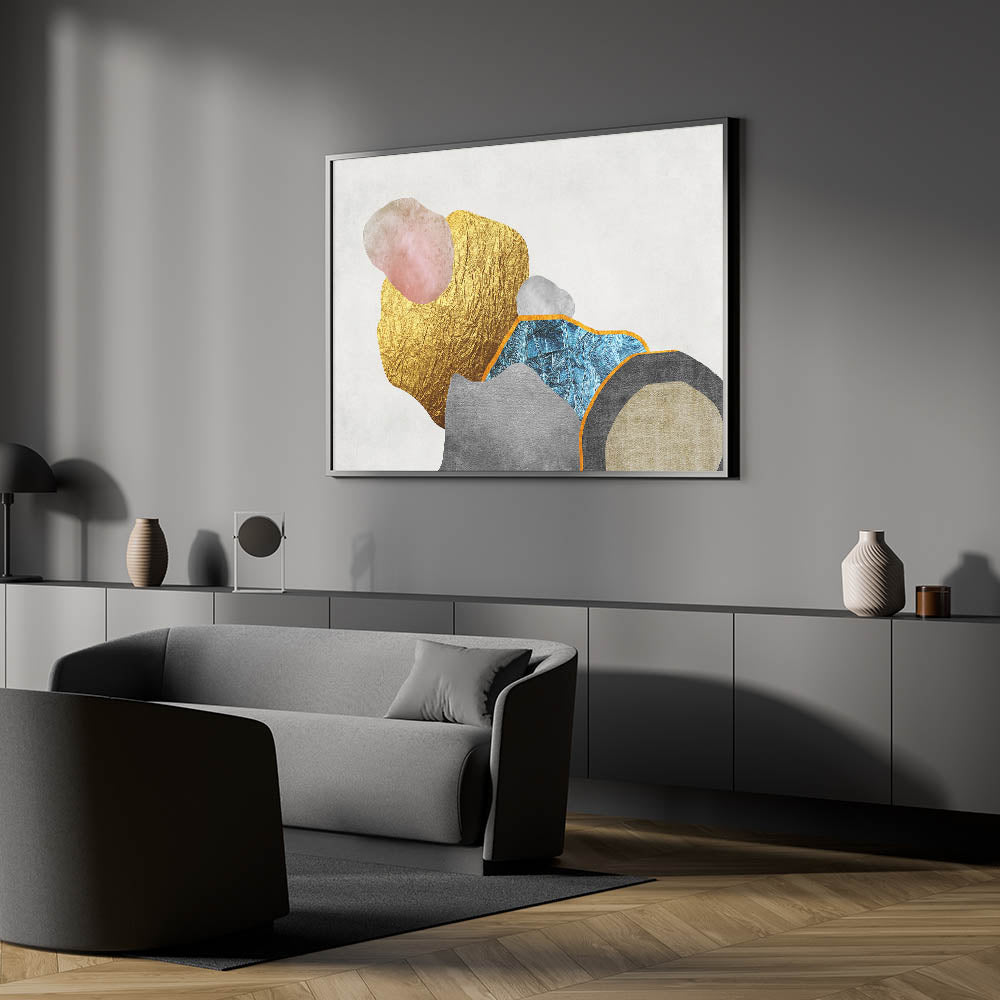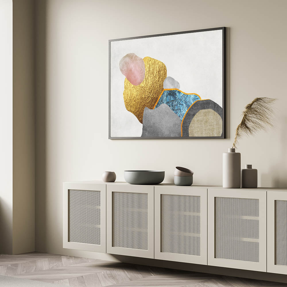 Add a burst of color and texture to your space with this Vibrant Geometric Abstract Art piece. Featuring a dynamic mix of gold, pink, blue, gray, and beige textures, this artwork combines geometric shapes with luxurious accents. The metallic gold element adds a touch of opulence, while the soft pink and blue tones introduce a playful and refreshing vibe, making it an ideal choice for modern and eclectic interiors.