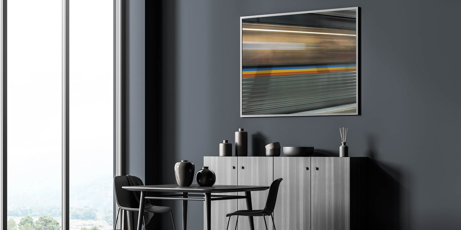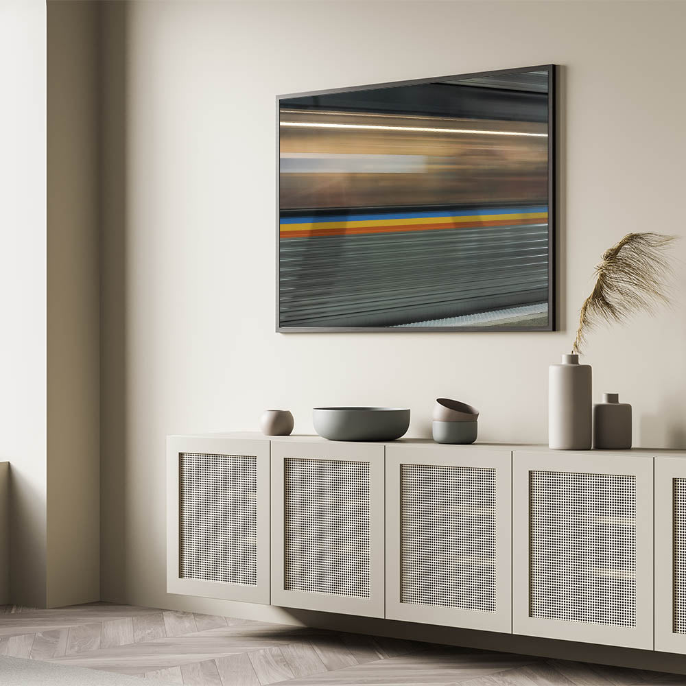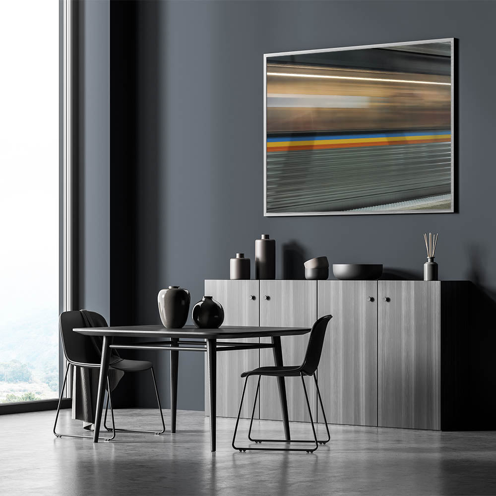 Bring the energy of the city into your home with this dynamic train motion blur art, perfect for modern and urban-themed interiors.