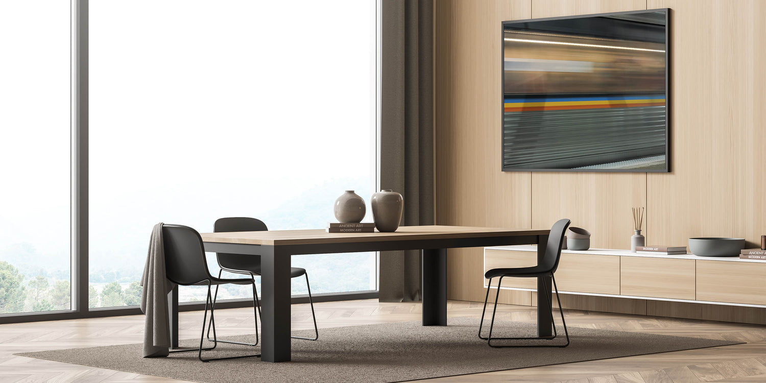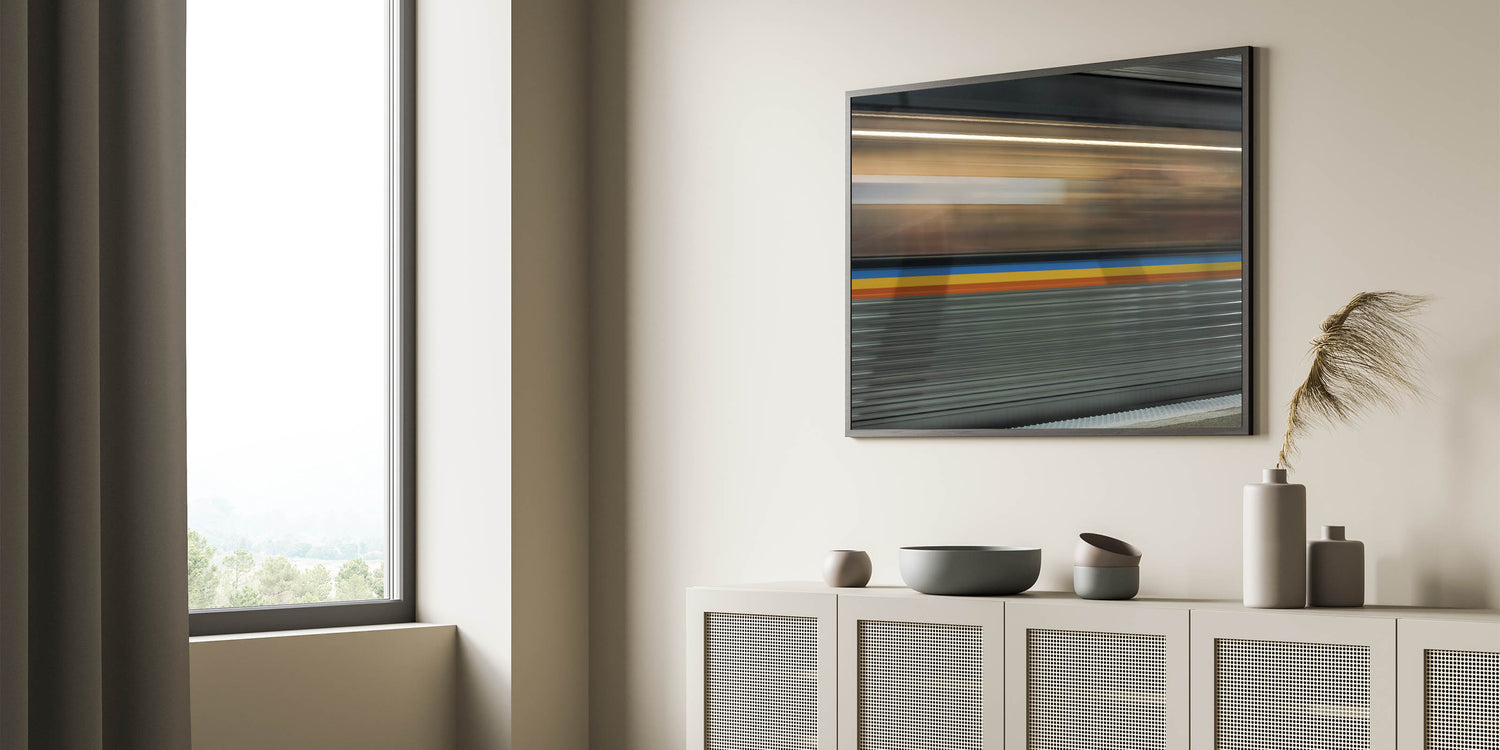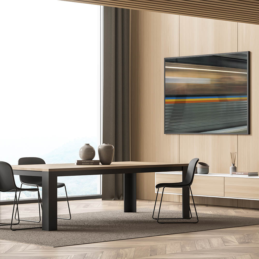 Bring the energy of the city into your home with this dynamic train motion blur art, perfect for modern and urban-themed interiors.