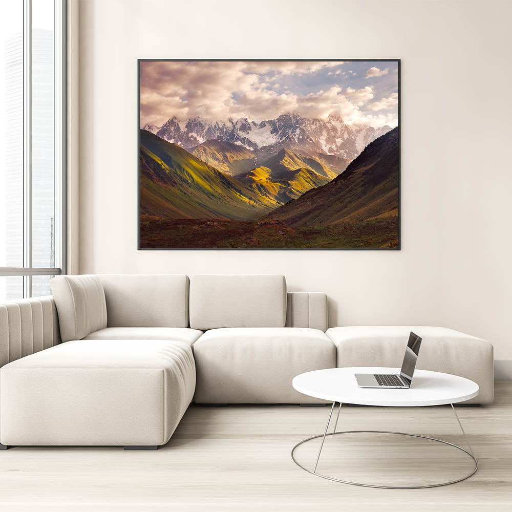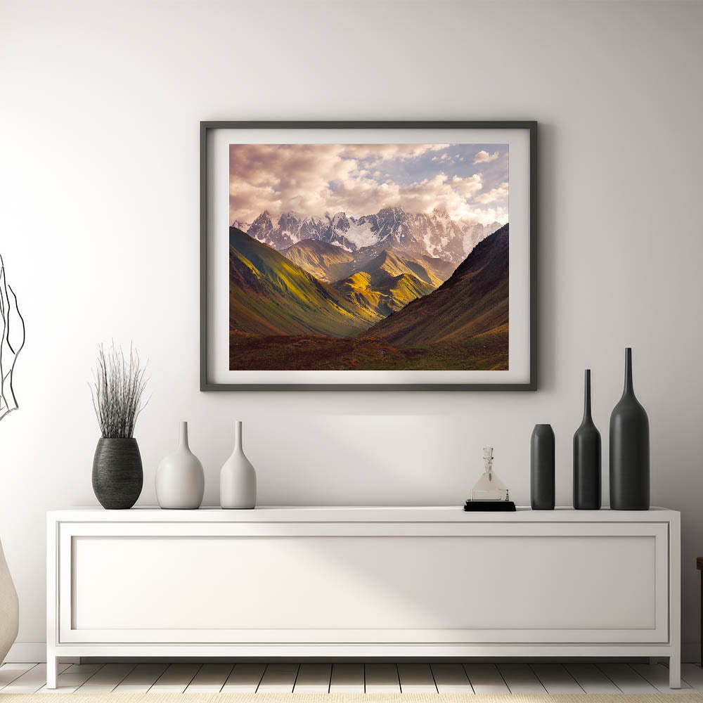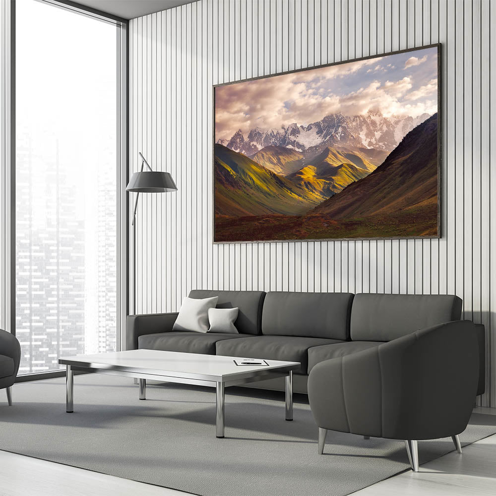Admire the awe-inspiring beauty of Georgia's mountain landscapes with this stunning Georgia Landscape Art. Featuring a majestic view of snow-capped peaks bathed in soft sunlight, this artwork captures the breathtaking splendor of Georgia's natural beauty. The dramatic play of light and shadow across the rolling hills and rugged mountains makes this piece a perfect choice for nature lovers and those looking to bring a sense of tranquility into their home.
