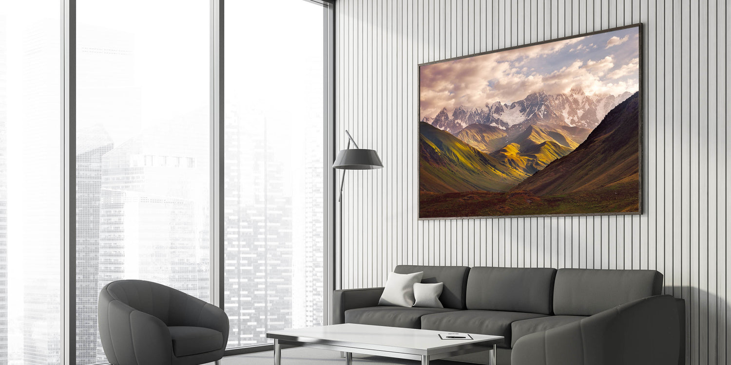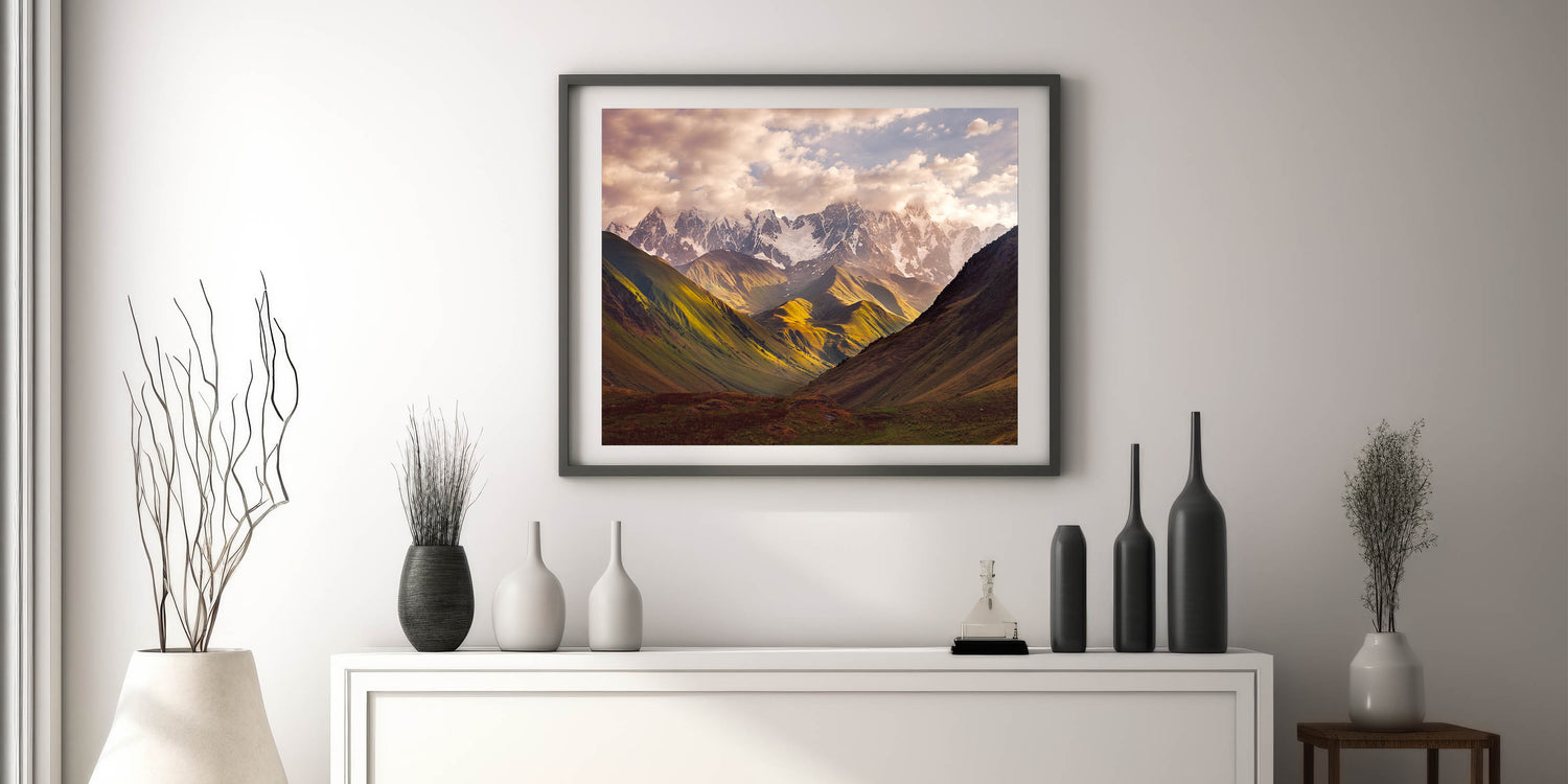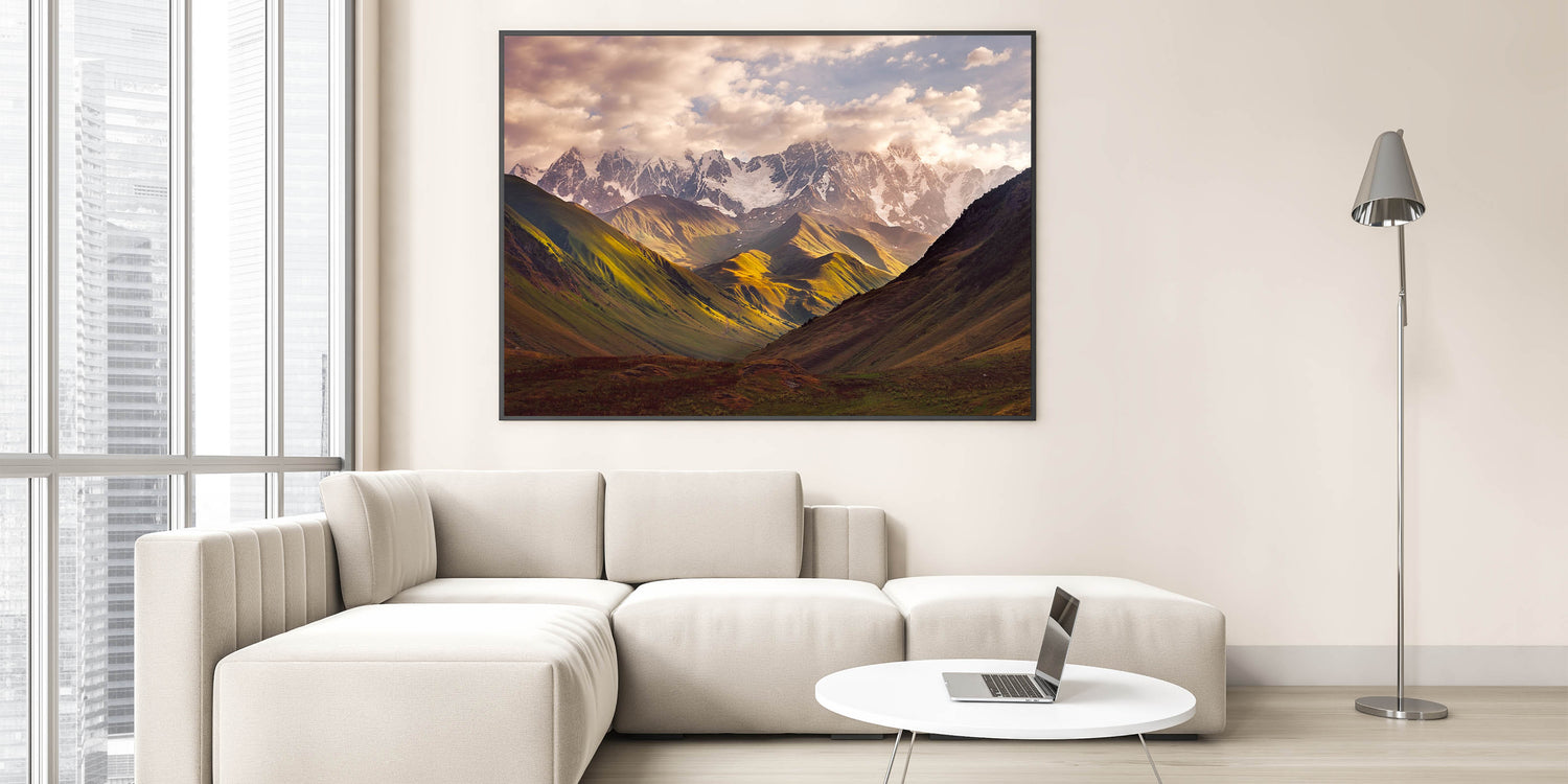 Admire the awe-inspiring beauty of Georgia's mountain landscapes with this stunning Georgia Landscape Art. Featuring a majestic view of snow-capped peaks bathed in soft sunlight, this artwork captures the breathtaking splendor of Georgia's natural beauty. The dramatic play of light and shadow across the rolling hills and rugged mountains makes this piece a perfect choice for nature lovers and those looking to bring a sense of tranquility into their home.
