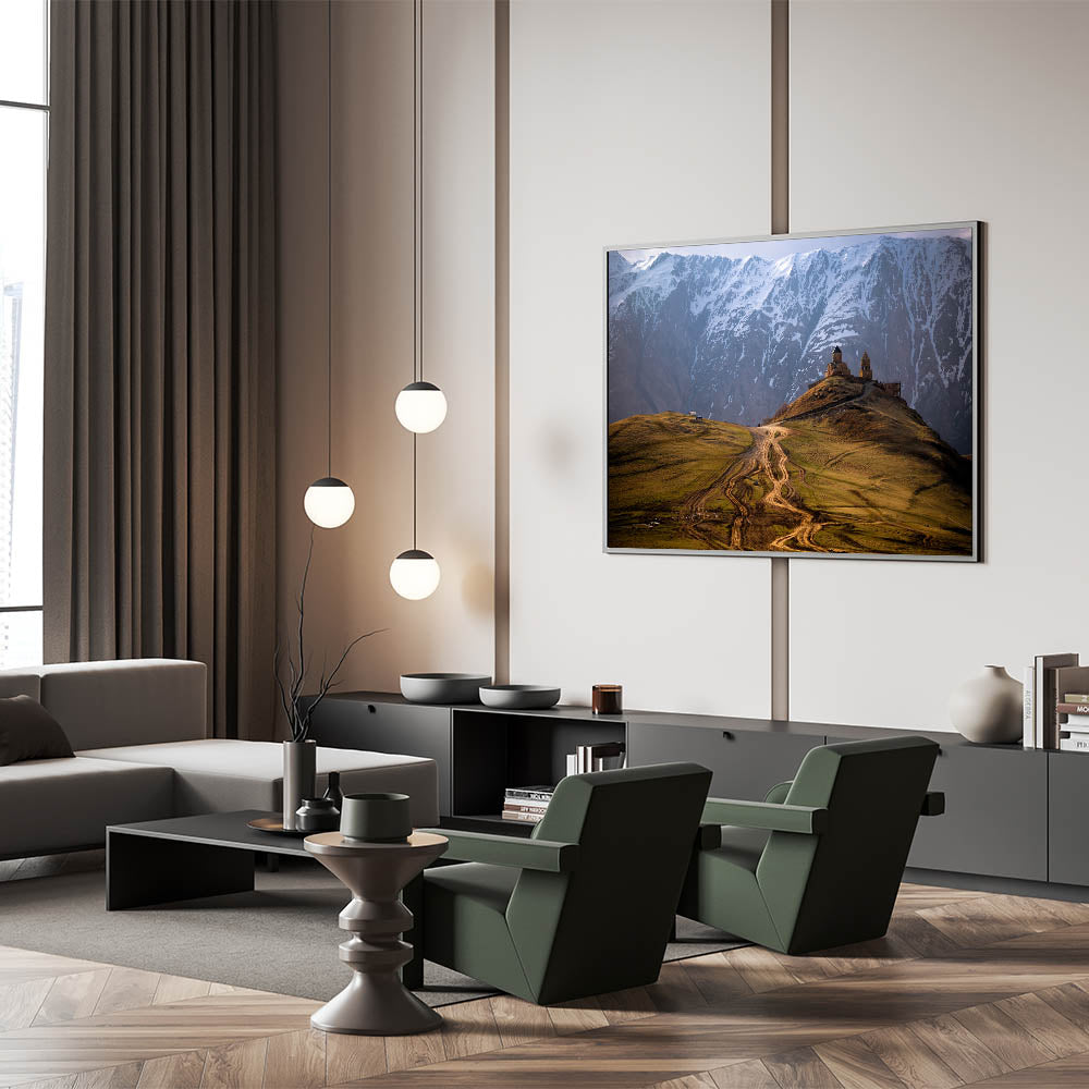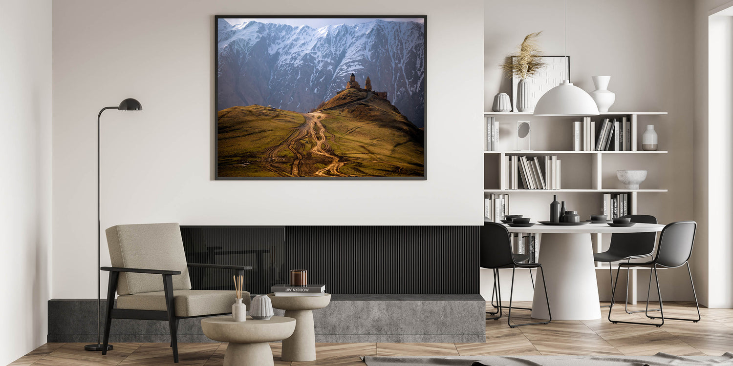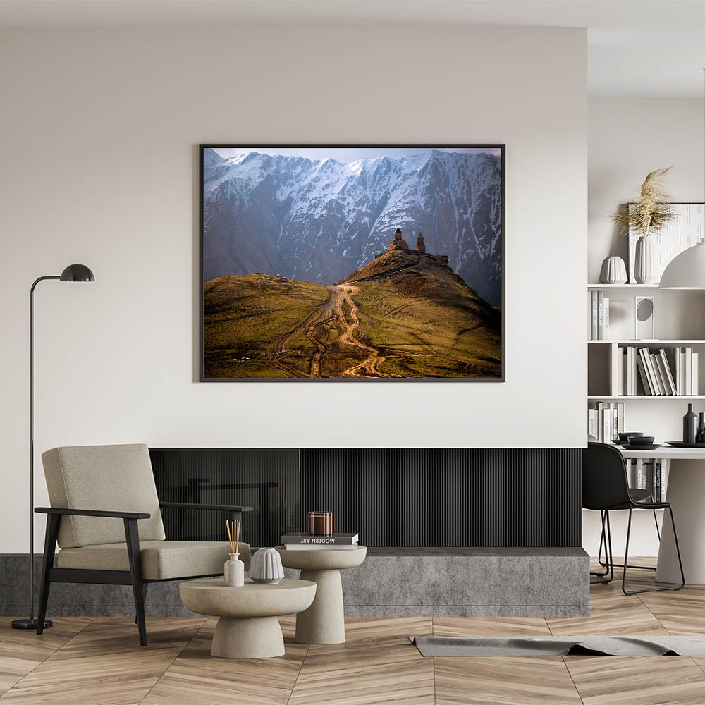 This stunning Georgia Photography Art captures the breathtaking beauty of a remote mountain church nestled against the backdrop of snow-capped peaks. The winding dirt path leading to the church adds to the sense of isolation and grandeur, making this a perfect piece for those who appreciate both nature and history. The dramatic contrast between the rugged landscape and the ancient architecture highlights Georgia's rich cultural and natural heritage.