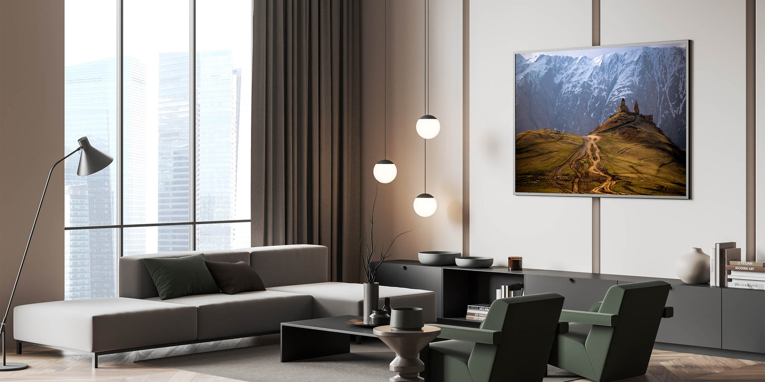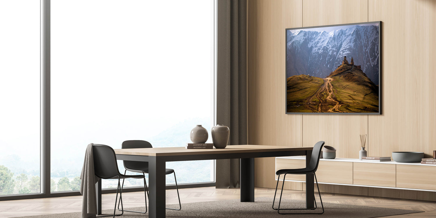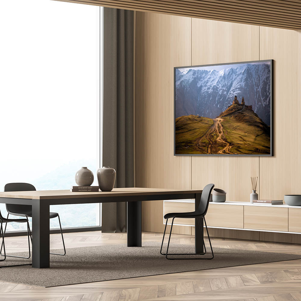 This stunning Georgia Photography Art captures the breathtaking beauty of a remote mountain church nestled against the backdrop of snow-capped peaks. The winding dirt path leading to the church adds to the sense of isolation and grandeur, making this a perfect piece for those who appreciate both nature and history. The dramatic contrast between the rugged landscape and the ancient architecture highlights Georgia's rich cultural and natural heritage.