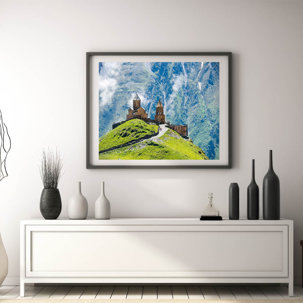 Experience the breathtaking beauty of Georgia’s landscapes with this stunning Georgia Scenery Print. This artwork captures a historic mountain church surrounded by towering peaks and lush greenery. The dramatic backdrop of mountains and the serene foreground create a perfect blend of nature and history, making this piece an ideal addition to your home or office decor.