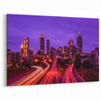This captivating wall art features the dynamic beauty of Atlanta’s skyline at night, illuminated by vibrant lights and set against a striking purple sky. The city’s iconic skyscrapers are brought to life with glowing yellow windows, while the motion blur of passing cars adds an energetic touch. This unique color palette and dramatic composition make this piece a perfect addition to any modern decor.