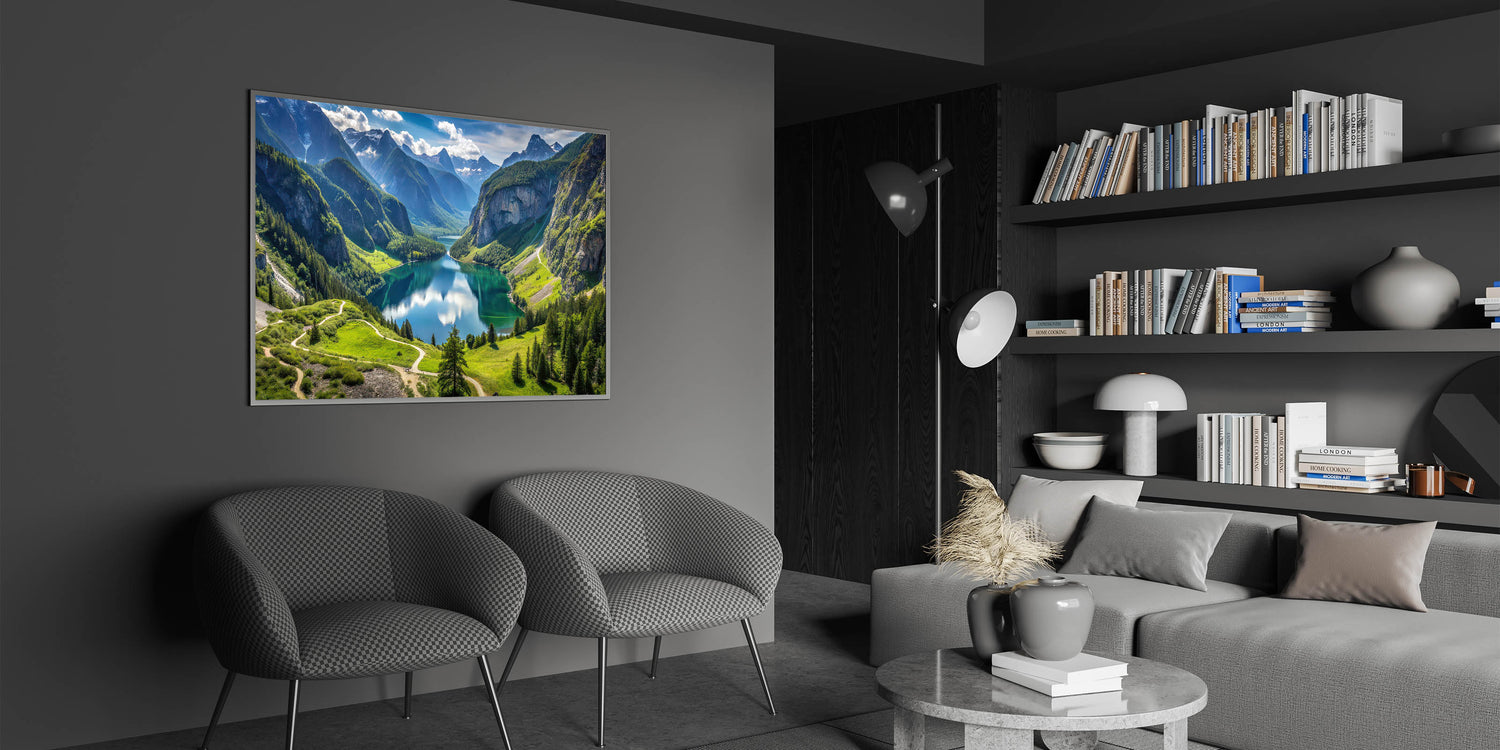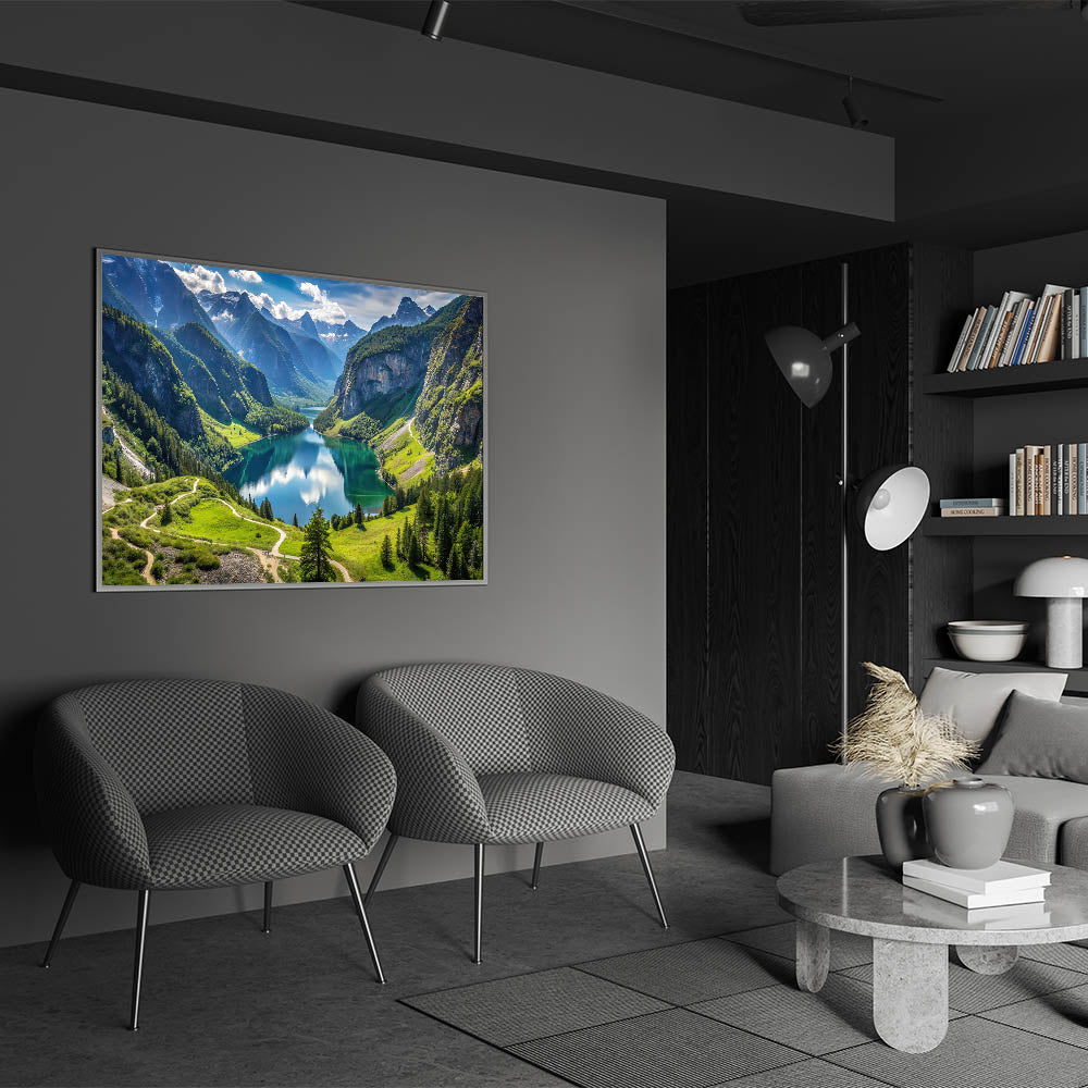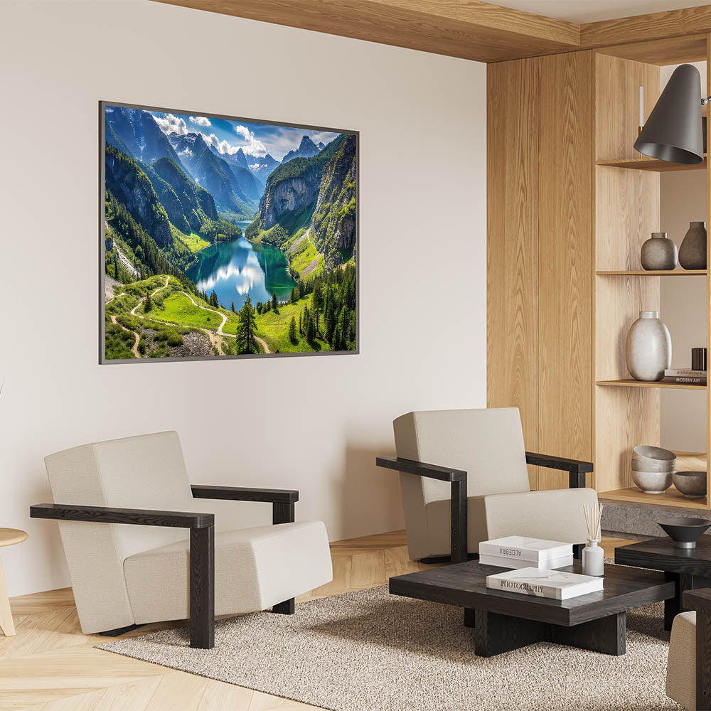 This awe-inspiring artwork showcases the natural beauty of the Bavarian Alps with a stunning view of a crystal-clear lake nestled between towering mountains. The winding paths through the lush green valley lead your eyes to the tranquil waters below, creating a harmonious balance between the majesty of the mountains and the serenity of the lake. Perfect for lovers of outdoor adventures and scenic landscapes, this piece brings the captivating beauty of Bavaria into your space.