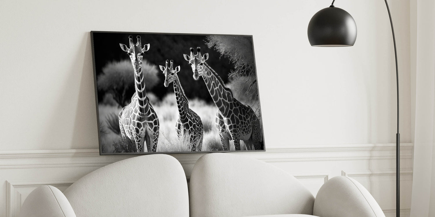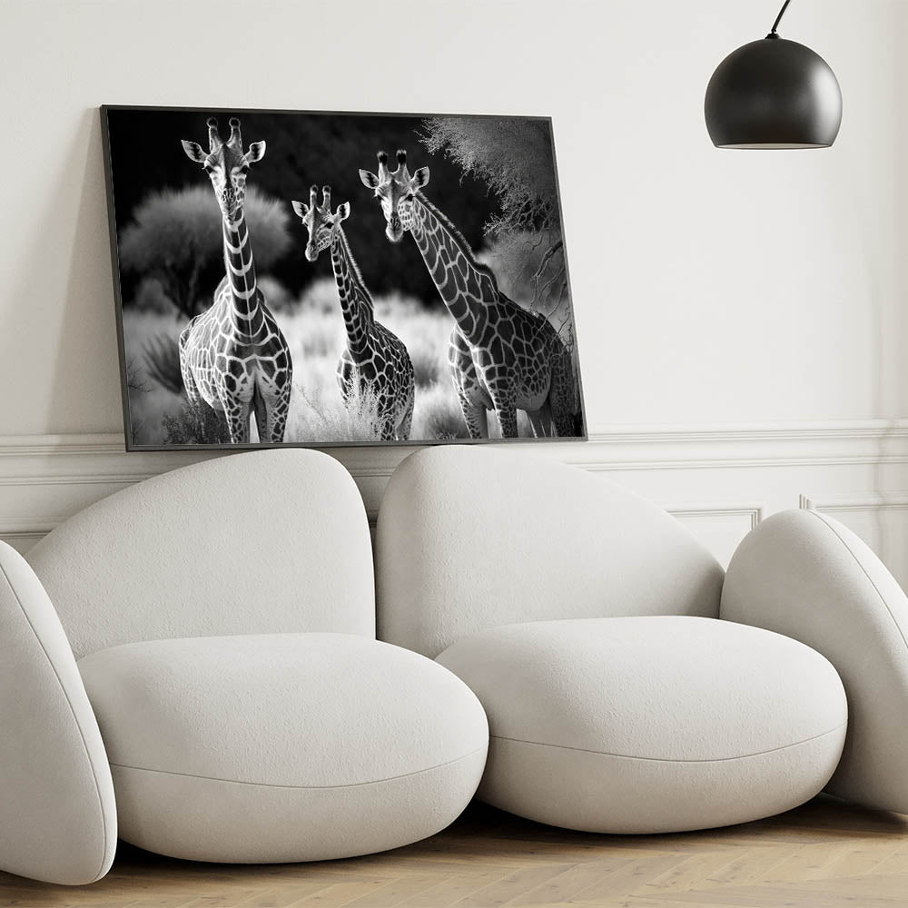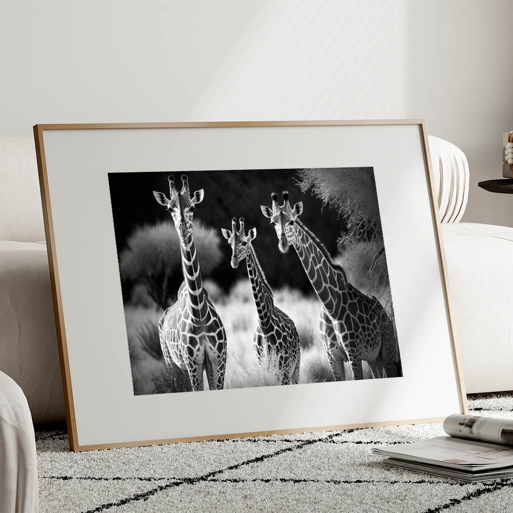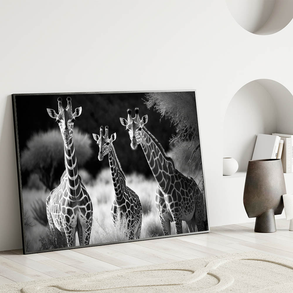 Bring the majesty of the African savannah into your home with this stunning giraffe wall art. Capturing the elegant poise of three giraffes, this piece is perfect for those who appreciate the beauty of wildlife. Whether displayed in your living room, office, or bedroom, this artwork serves as a serene reminder of the natural world.