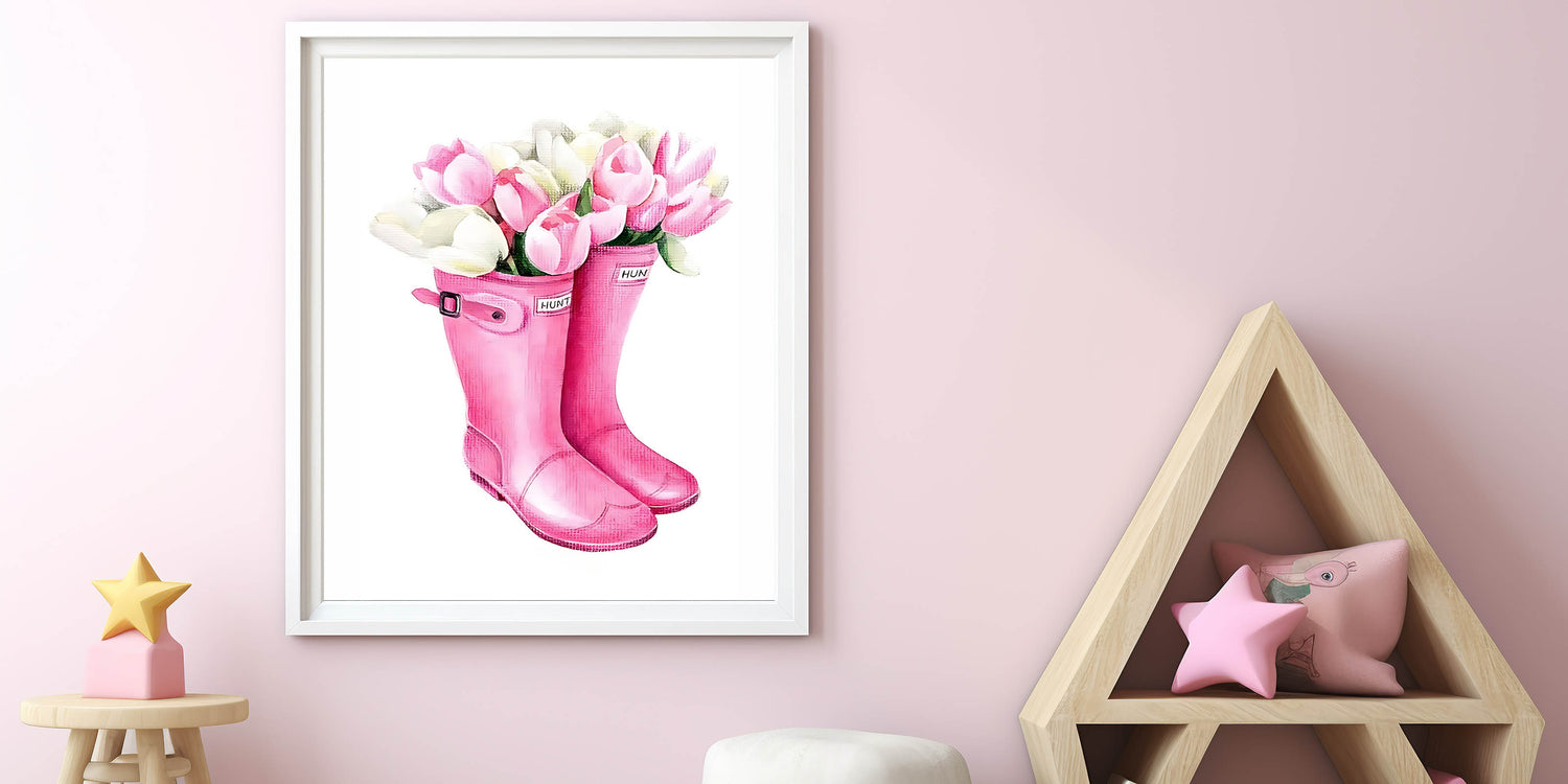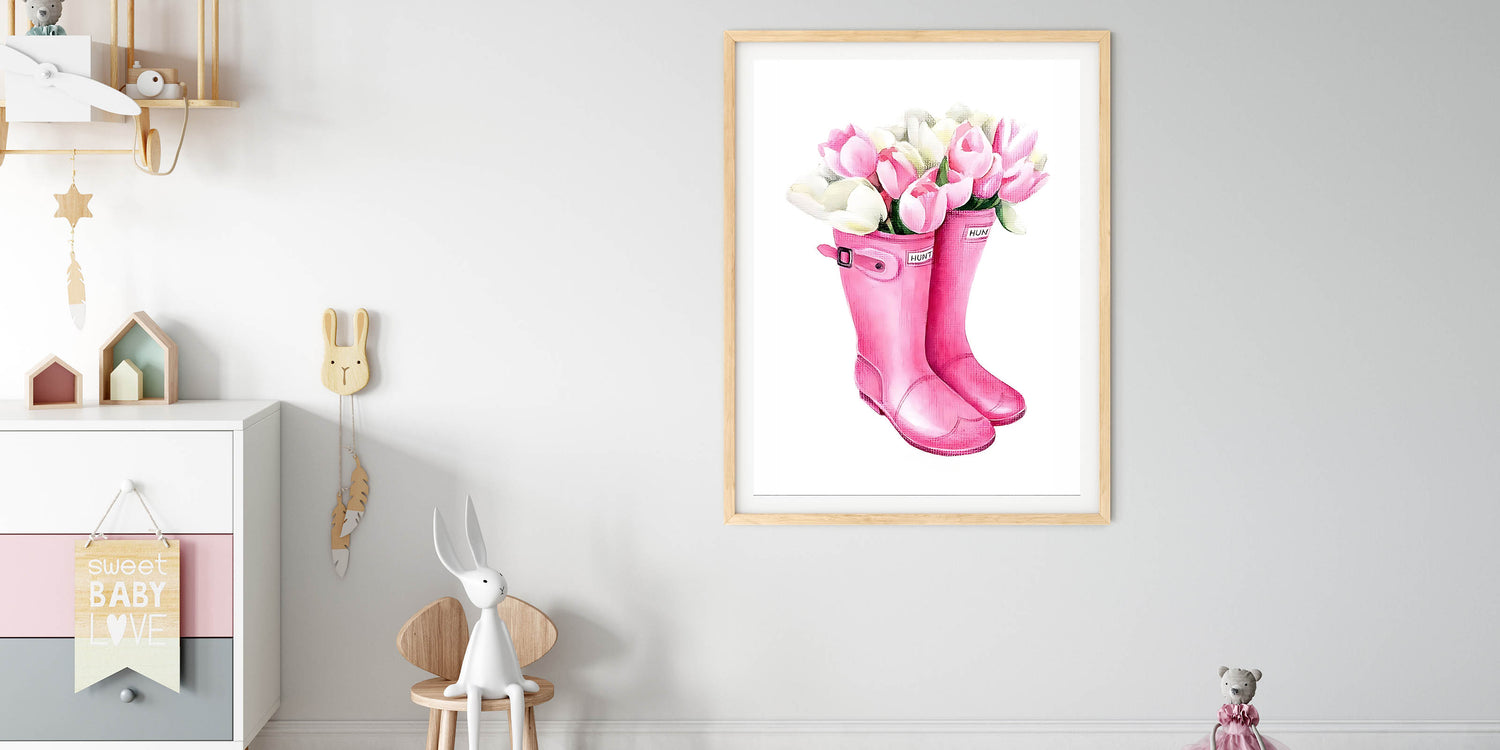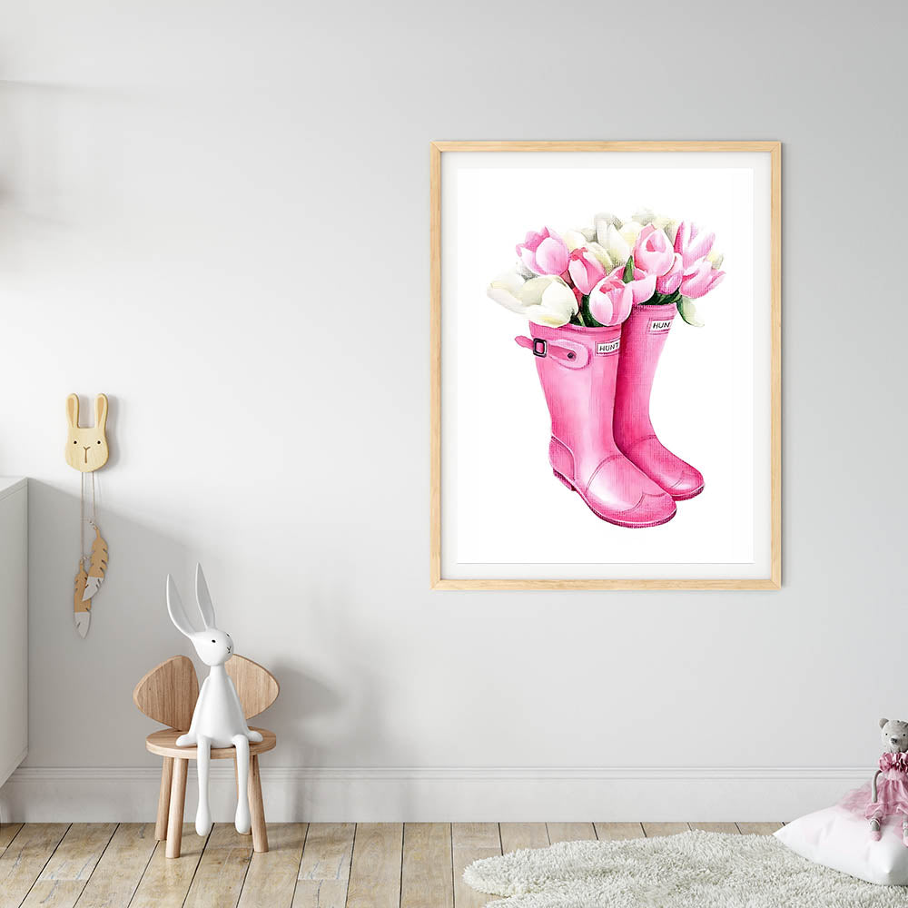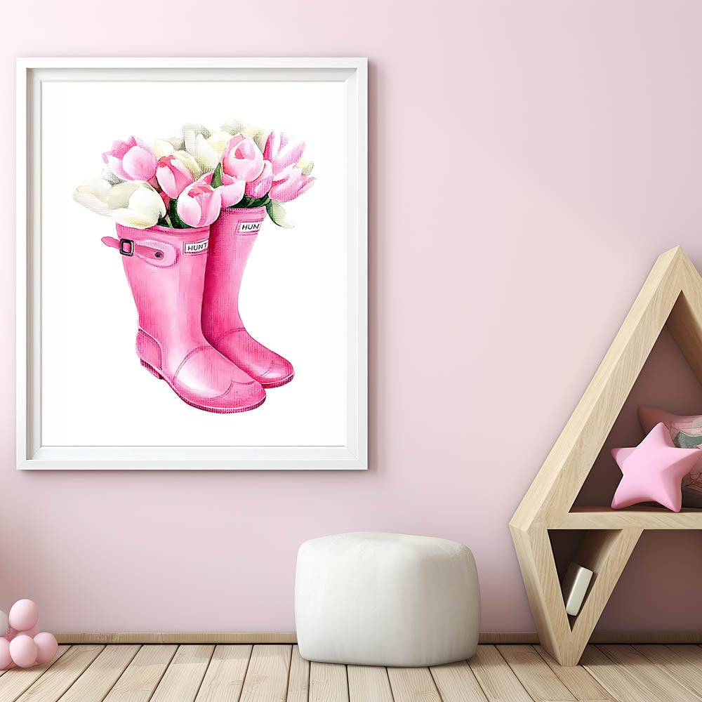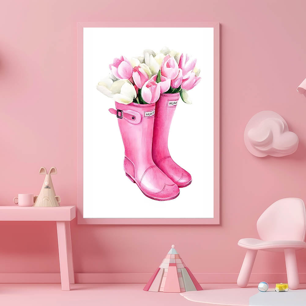 Add a touch of elegance and whimsy to your child's space with this charming pink boots with flowers wall art. Featuring a pair of vibrant pink rain boots overflowing with delicate tulips in shades of soft pink and white, this beautiful watercolor-style artwork is perfect for girls' bedrooms, nurseries, and playrooms. The combination of floral beauty and playful rain boots makes this a delightful addition to children’s wall decor, creating a fresh and cheerful atmosphere.