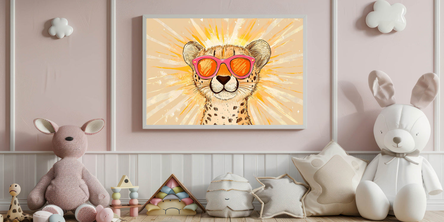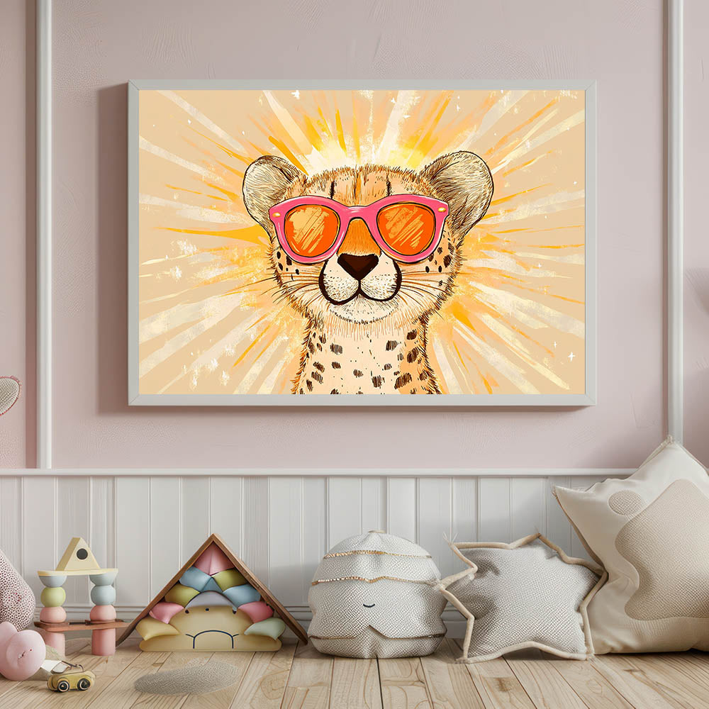 Add a fun and stylish touch to your child’s space with this Girls Room Wall Art featuring a playful cheetah wearing trendy pink sunglasses. This vibrant and cheerful design is perfect for a nursery, playroom, or kids’ bedroom, bringing a bold and energetic vibe to the decor. The combination of warm beige, orange, and pink hues makes it a lively addition to any children’s wall decor collection.