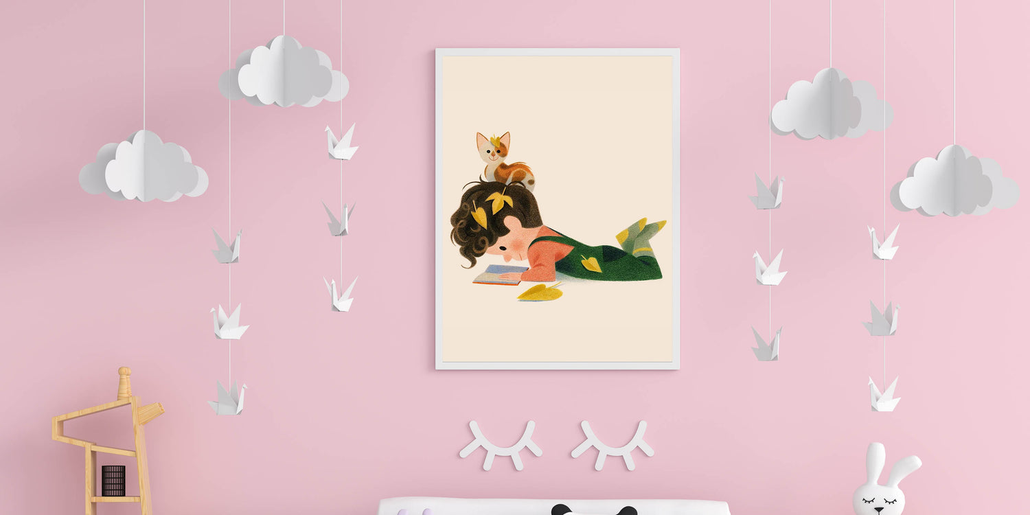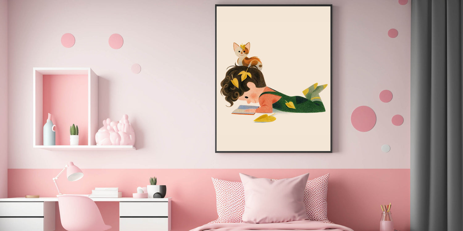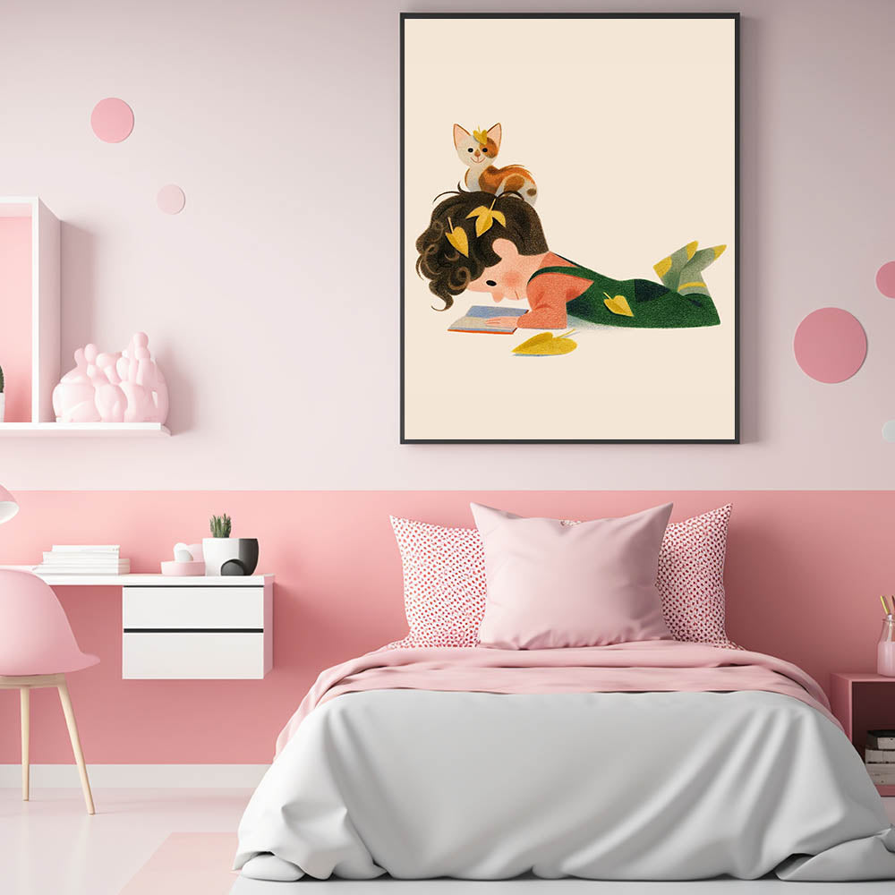 Create a warm and inspiring atmosphere with this Girls Room Wall Art, featuring a young child deeply engaged in reading, accompanied by an adorable kitten. The soft beige background and earthy green and golden tones evoke a sense of calm and imagination, making this artwork a perfect addition to any nursery, kids’ bedroom, or playroom. This delightful illustration encourages a love for reading and storytelling, making it an ideal choice for any children’s wall decor collection.