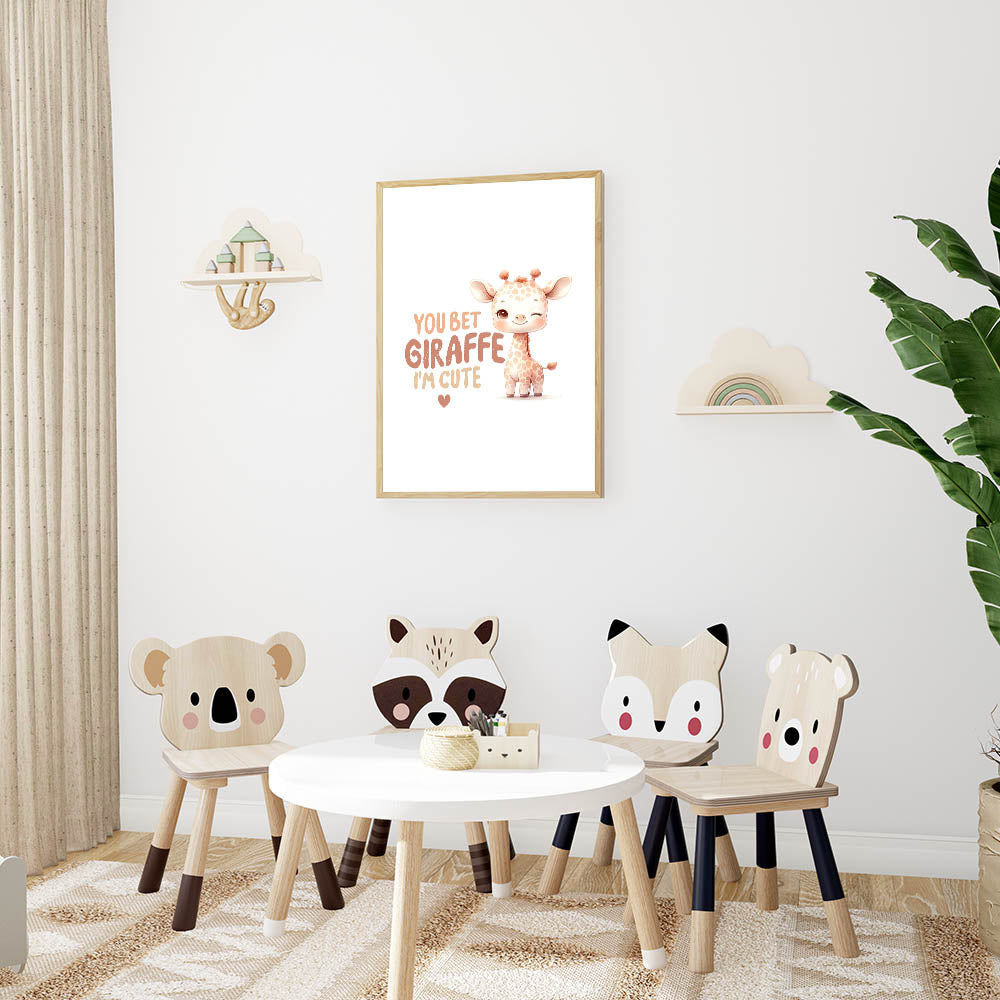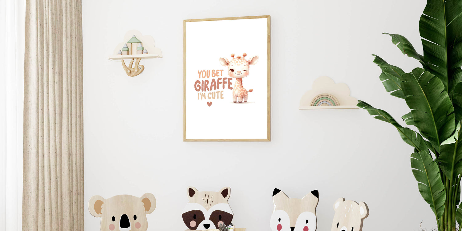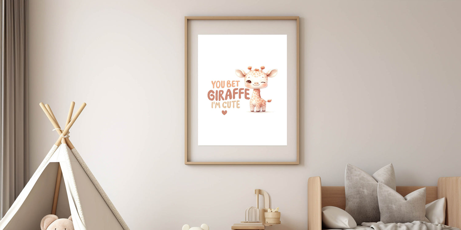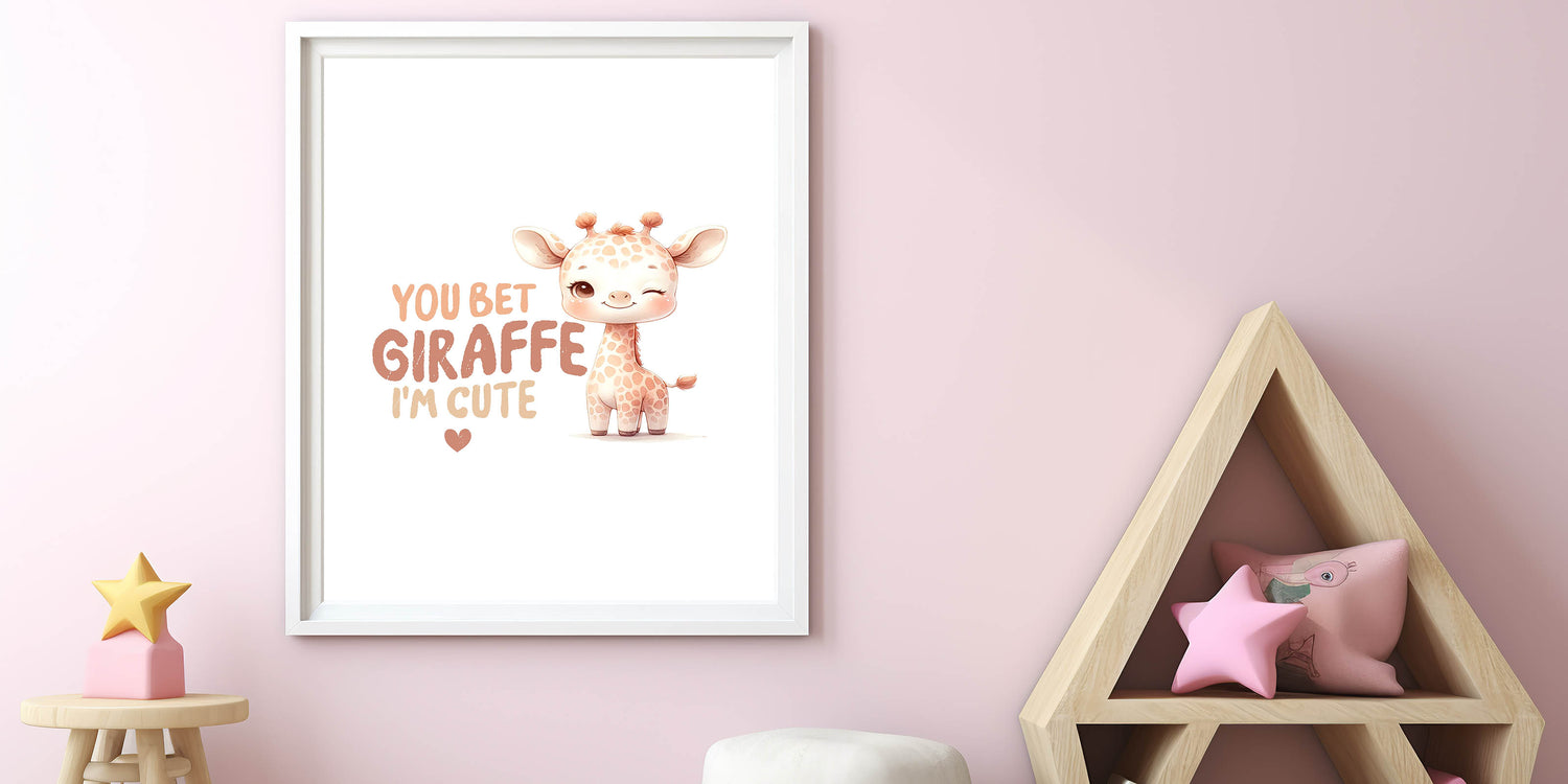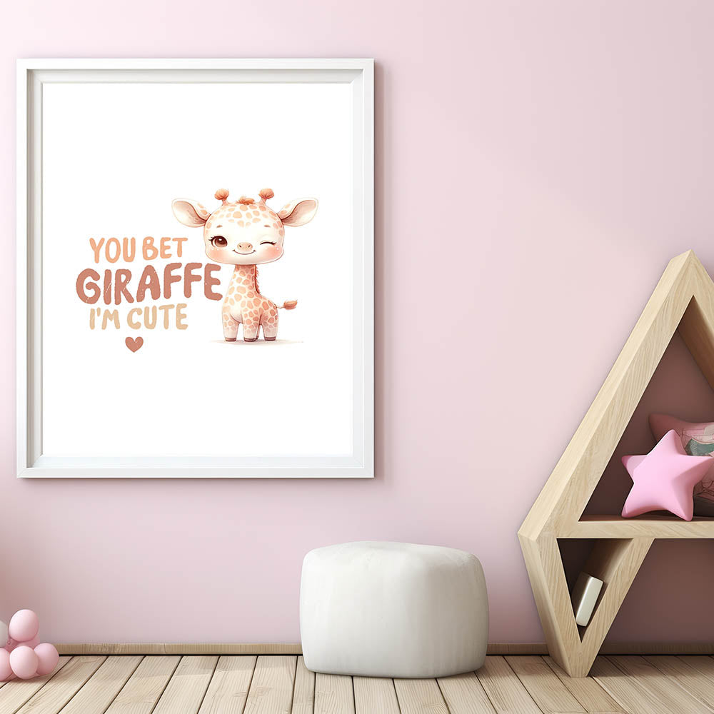 Add a playful and heartwarming touch to your child's space with this "You Bet Giraffe I'm Cute" wall art. Featuring a charming baby giraffe illustration with a winking expression, this delightful design is perfect for nurseries, girls' bedrooms, and playrooms. The warm beige and brown tones blend beautifully with any decor, making it a cozy and inviting addition.