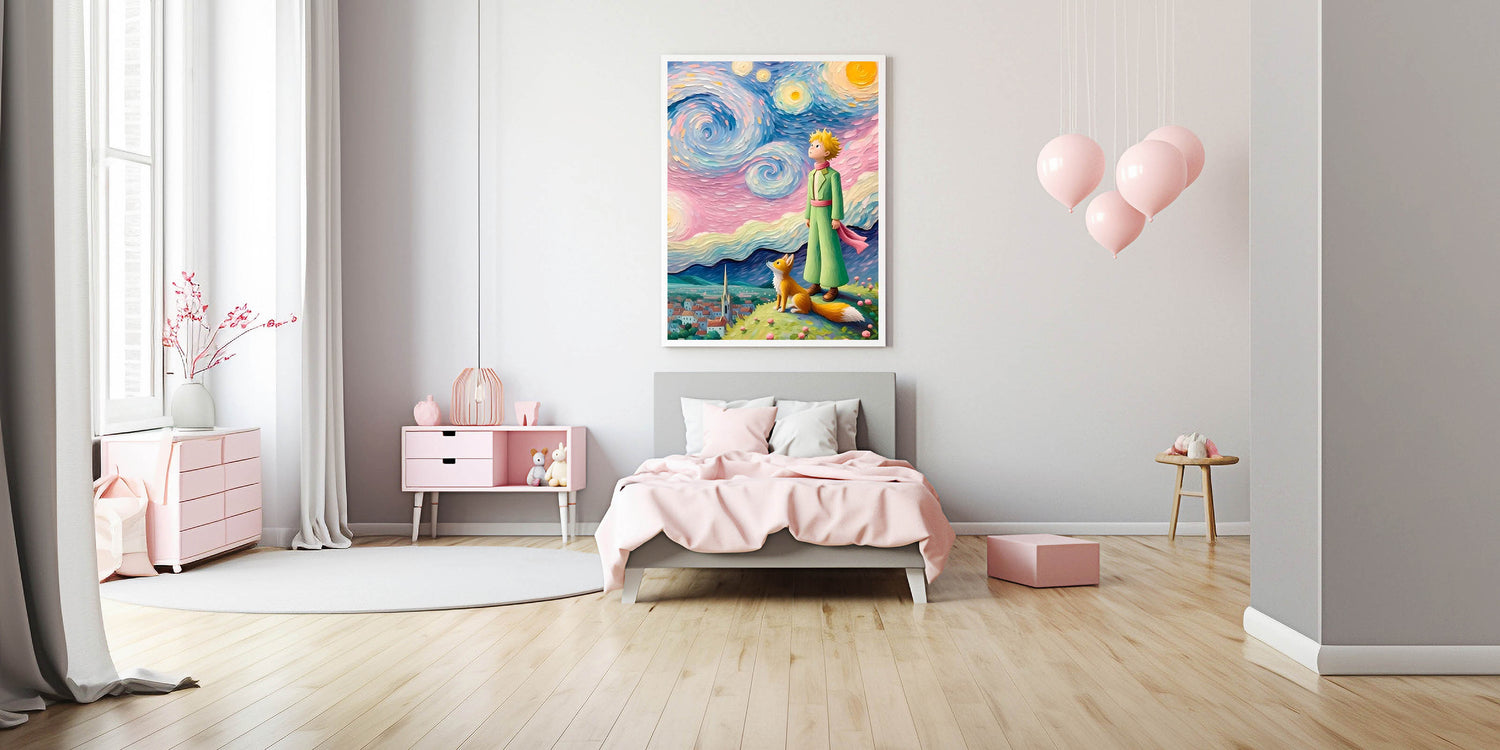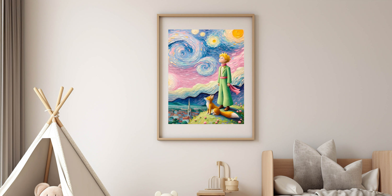 Create a magical and inspiring atmosphere in your child’s space with this dreamy starry night wall art. Featuring a young boy and his loyal fox gazing at a swirling, colorful sky, this enchanting artwork evokes a sense of wonder, curiosity, and adventure. The rich blues, golds, and pinks blend beautifully, making it a perfect addition to nurseries, playrooms, or girls' bedrooms. The textured, storybook-like style adds to its timeless charm, making it a stunning piece of children’s wall decor.