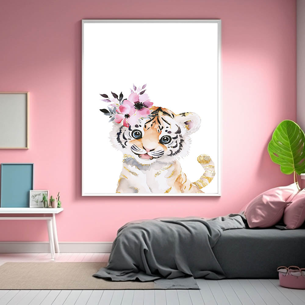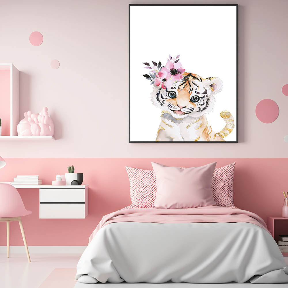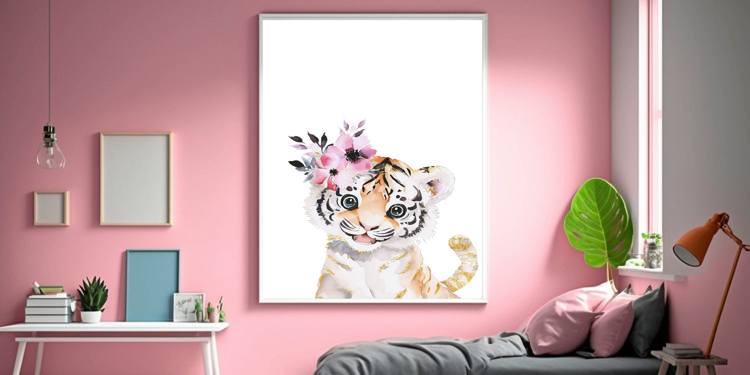 Bring a blend of wild beauty and elegance to your child's space with this adorable baby tiger wall art. Featuring a soft watercolor illustration of a playful tiger cub adorned with delicate pink florals and luxurious gold-accented stripes, this artwork adds a whimsical and stylish touch to nurseries, girls' bedrooms, and playrooms. The clean white background enhances the intricate details, making it a standout decor piece.