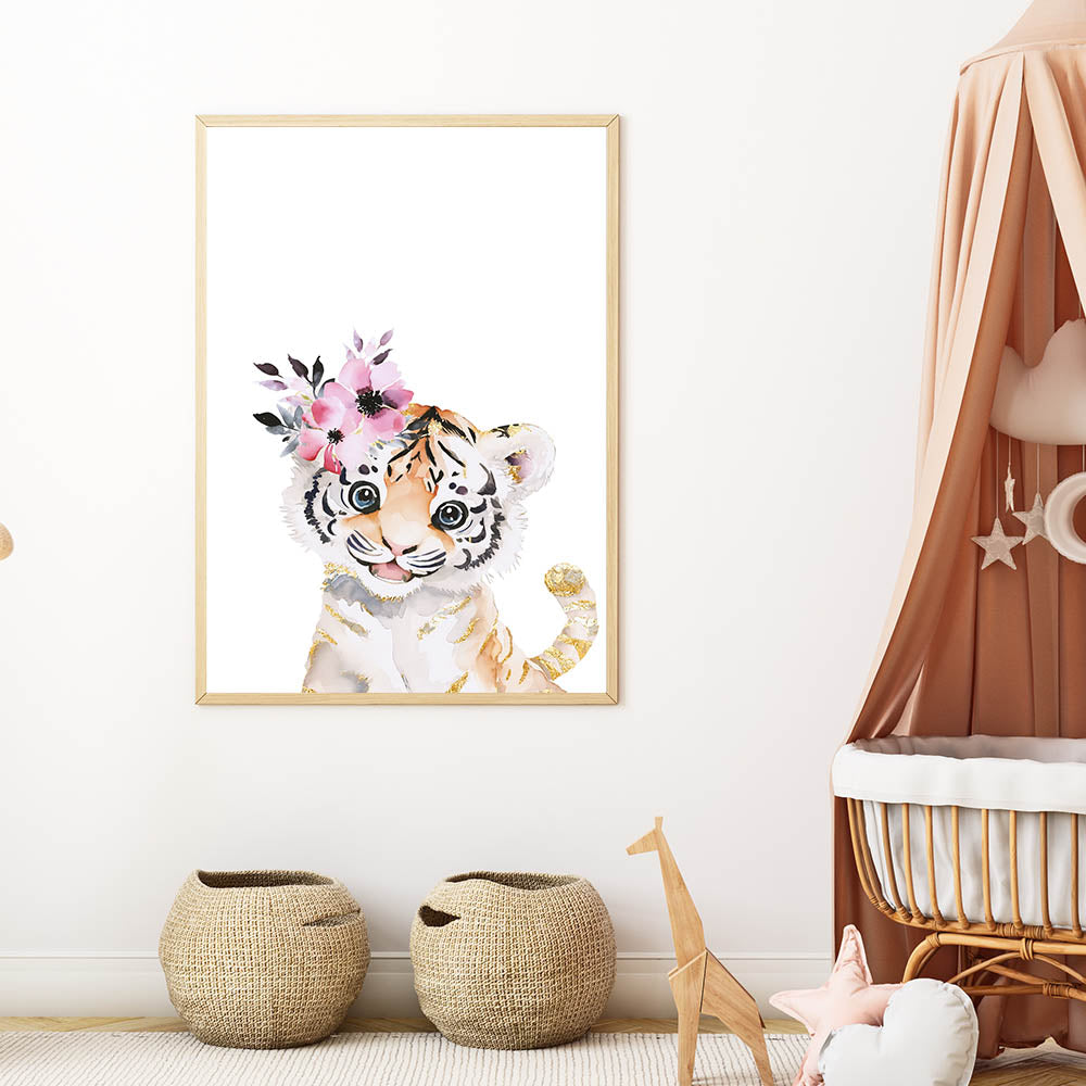 Add a touch of charm, elegance, and adventure to your child's space with this floral baby tiger art print. Order now to create a stylish and cozy nursery or bedroom!