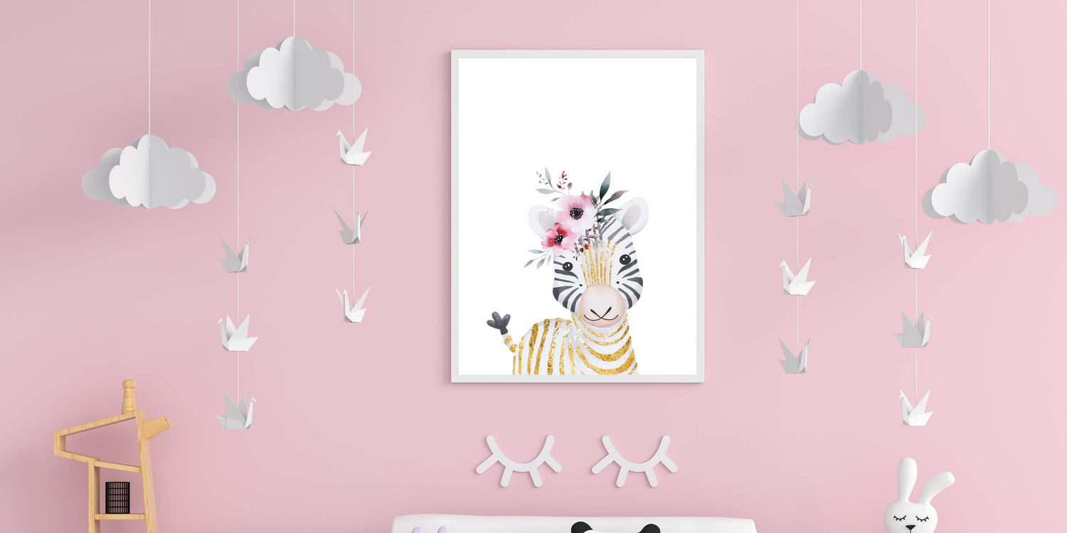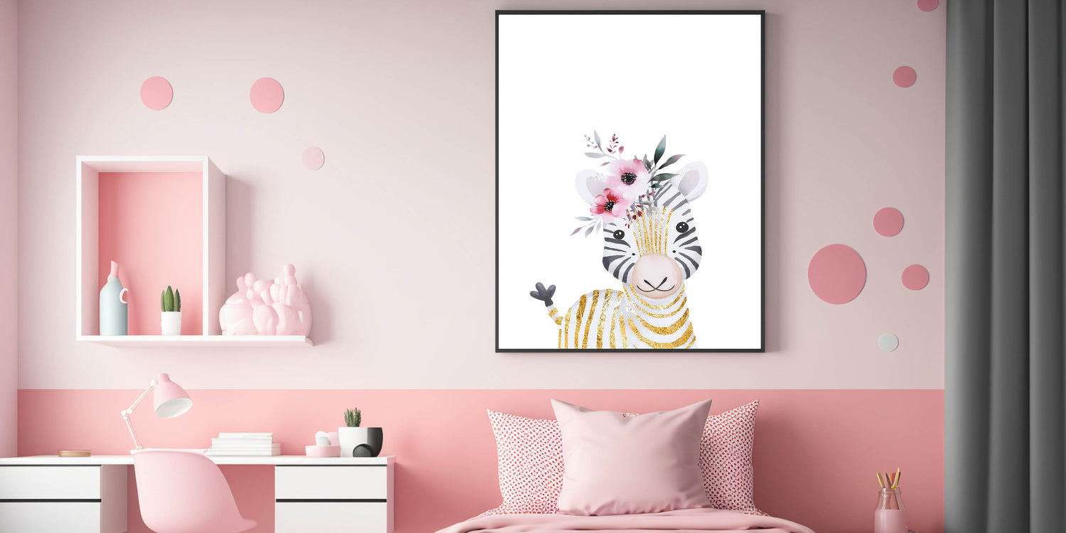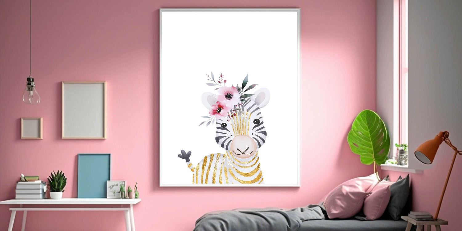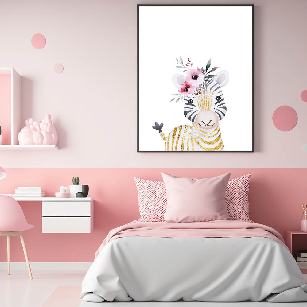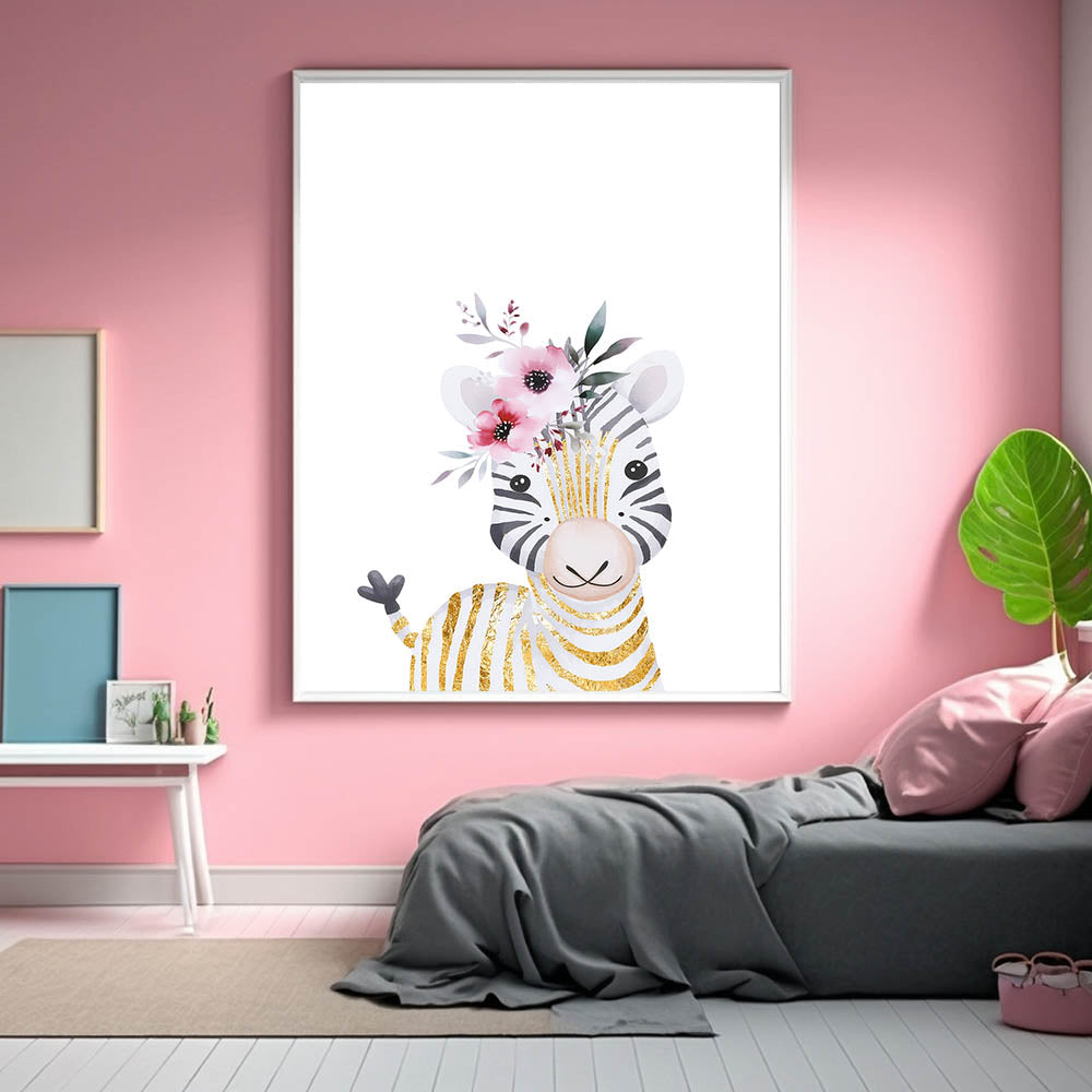 Bring a touch of elegance and charm to your child's space with this adorable baby zebra wall art. Featuring a soft watercolor illustration of a smiling zebra with gold-accented stripes and delicate pink florals, this artwork blends playfulness with sophistication. The clean white background highlights the intricate details, making it an ideal decor piece for nurseries, girls' bedrooms, and playrooms.