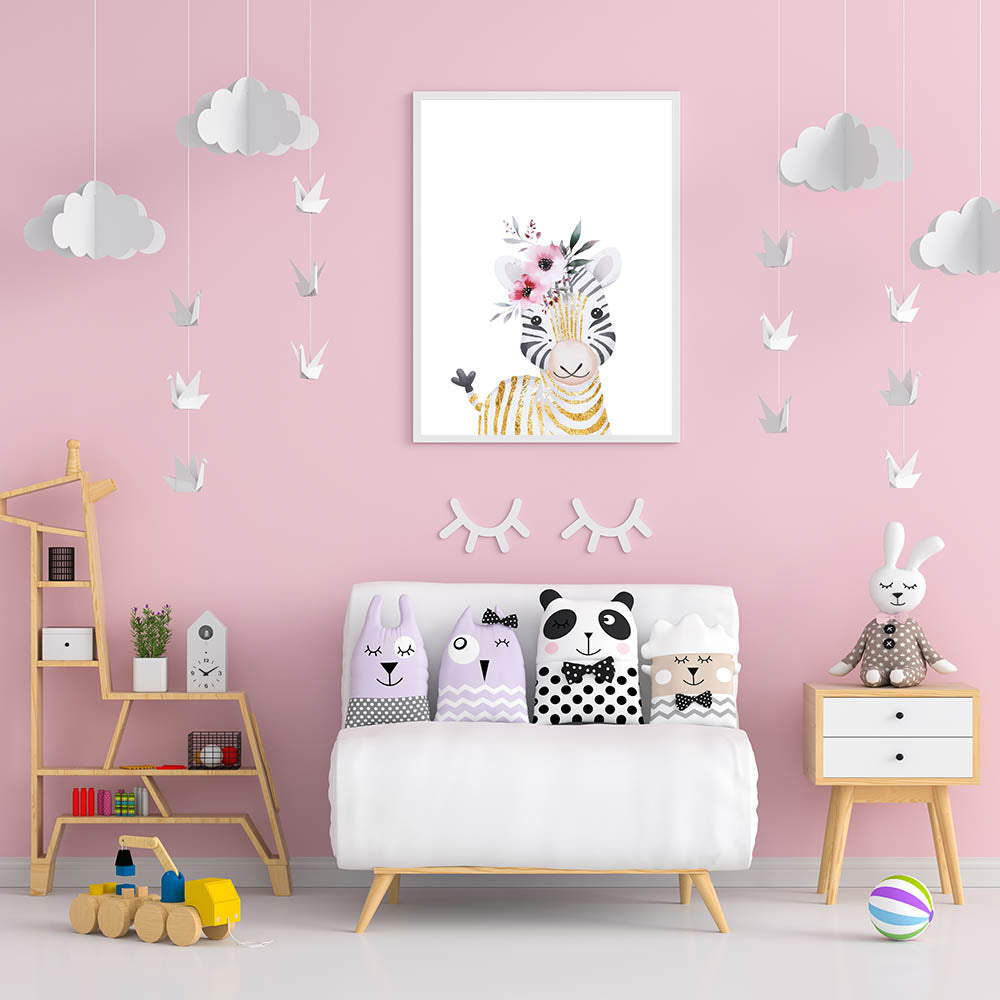 Add a whimsical and luxurious touch to your child's space with this floral baby zebra art print. Order now to create a cozy and enchanting nursery or bedroom!