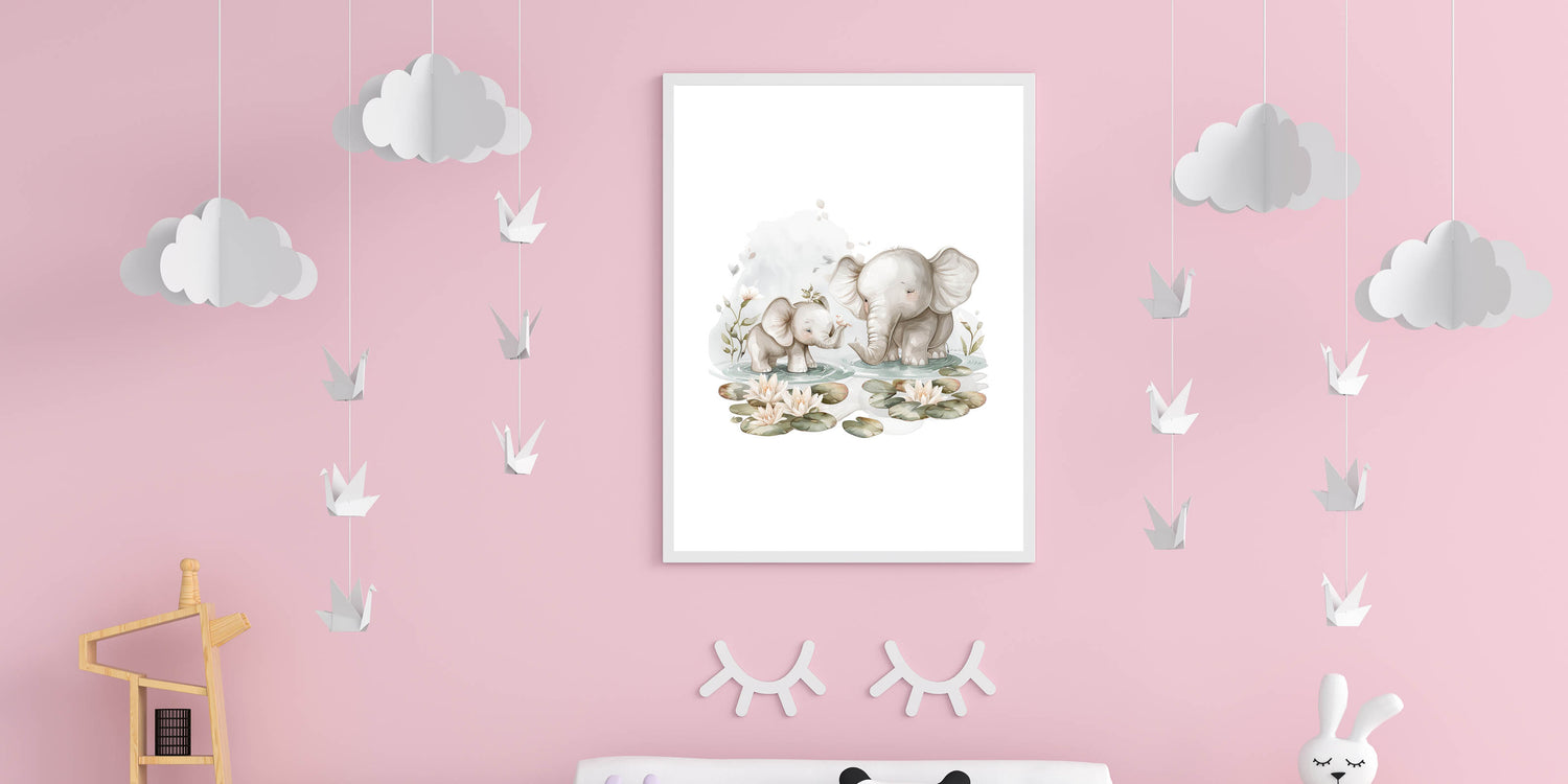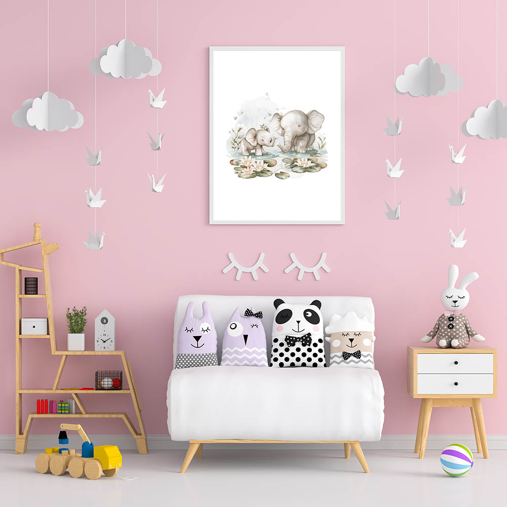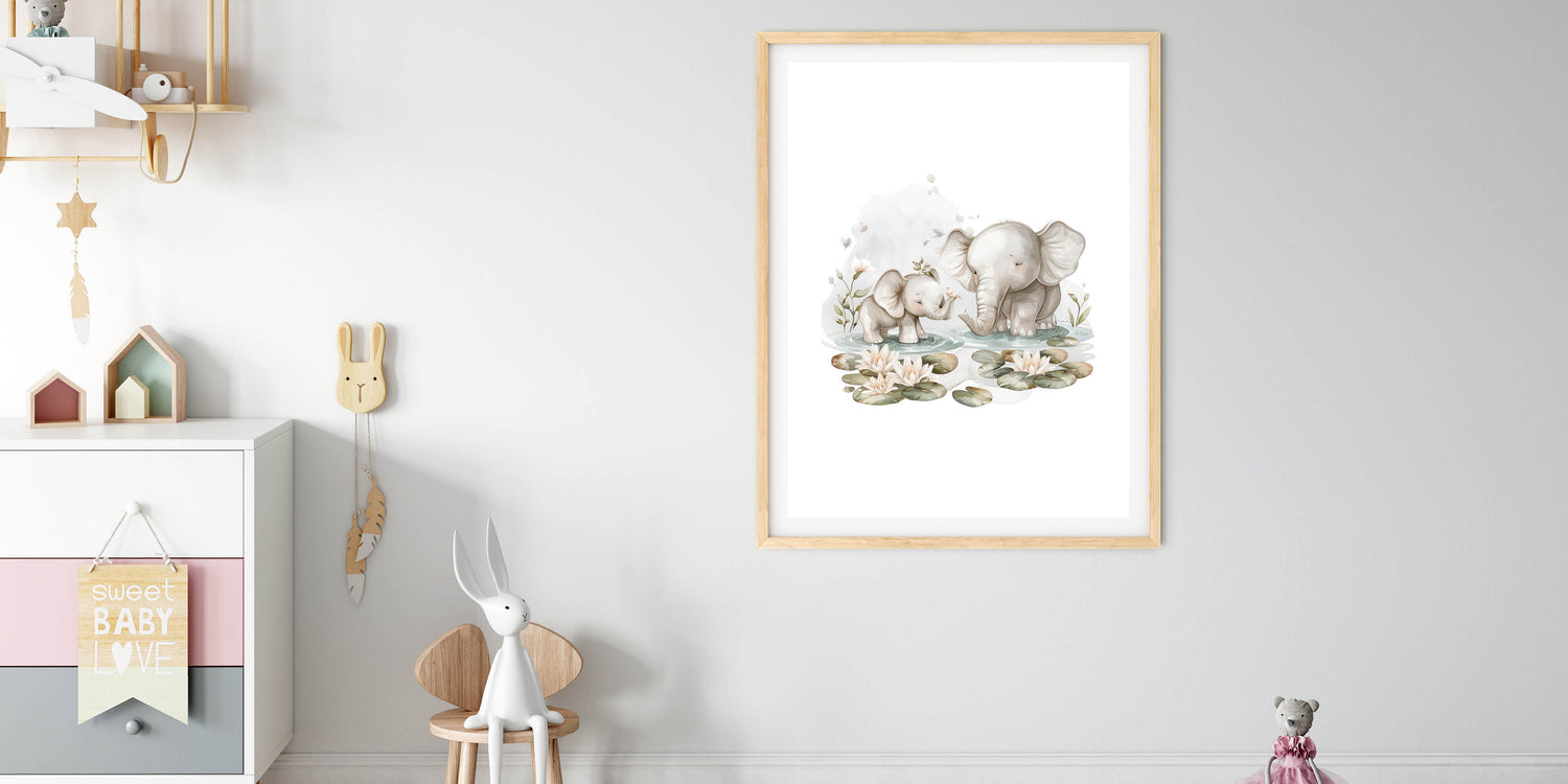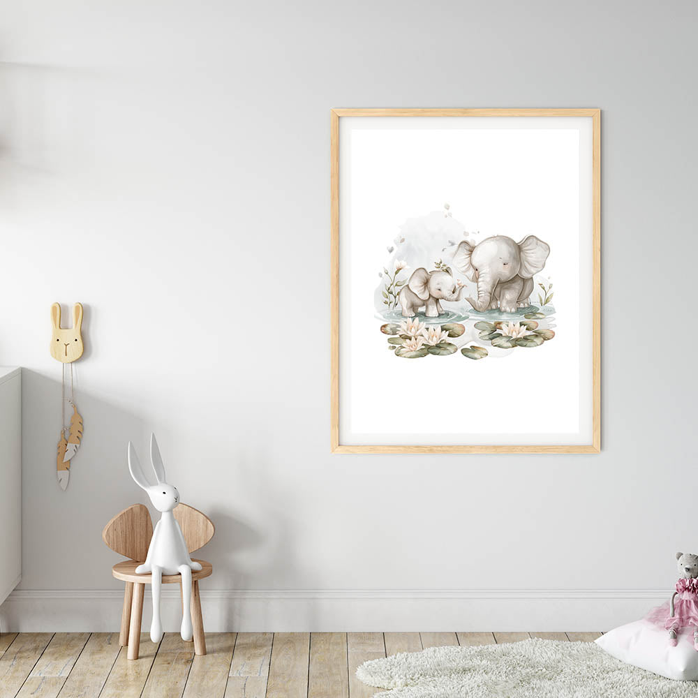 Create a loving and peaceful atmosphere in your child's space with this beautiful mother and baby elephant wall art. This heartwarming watercolor illustration captures the gentle bond between an elephant parent and calf as they enjoy a serene pond filled with lily pads and delicate white flowers. The soft gray and beige tones blend seamlessly with nature-inspired greens, making it a soothing addition to nurseries, girls' bedrooms, and playrooms.