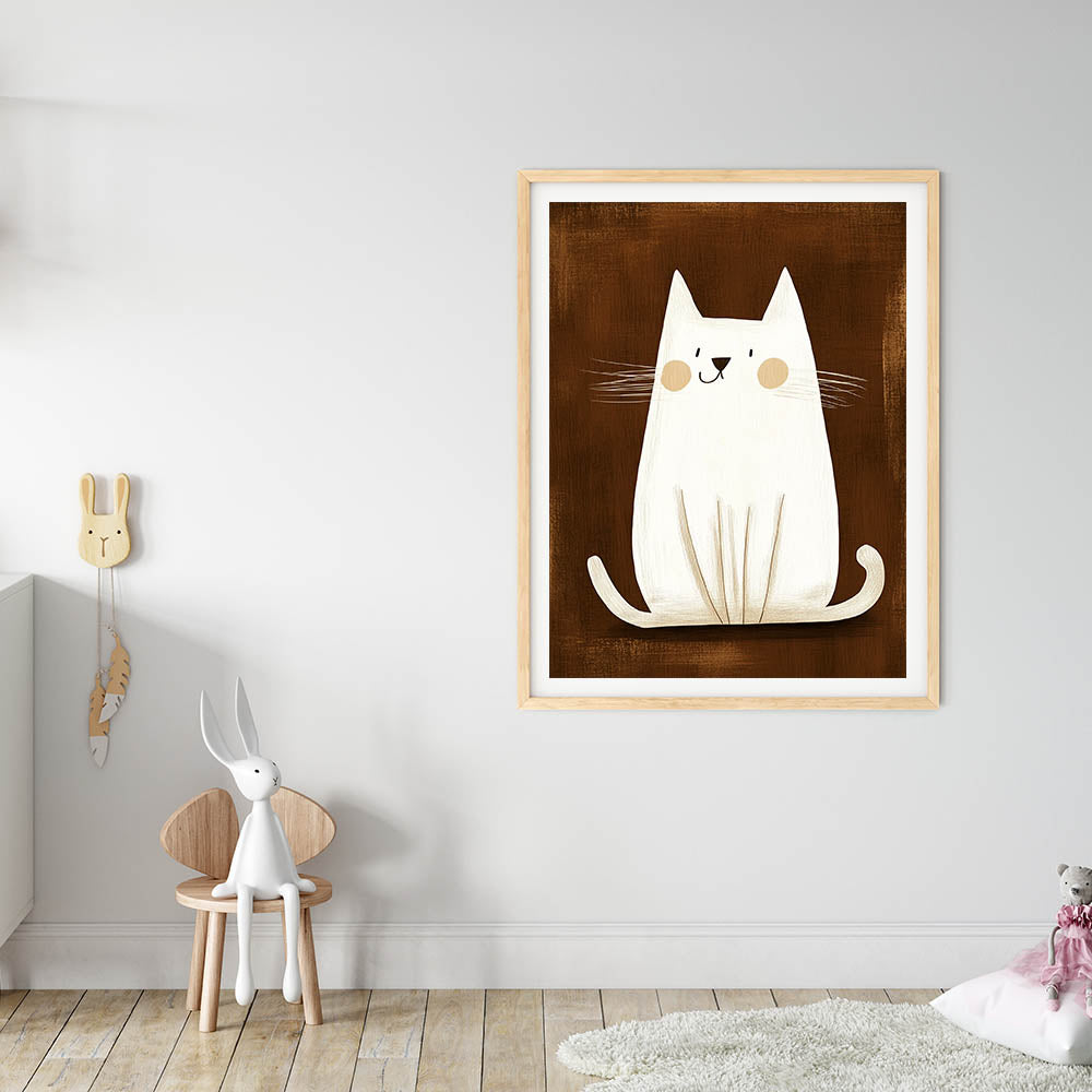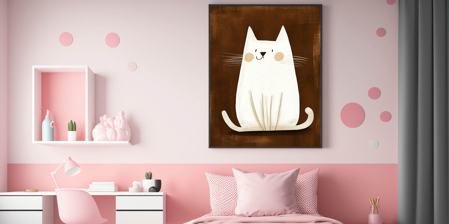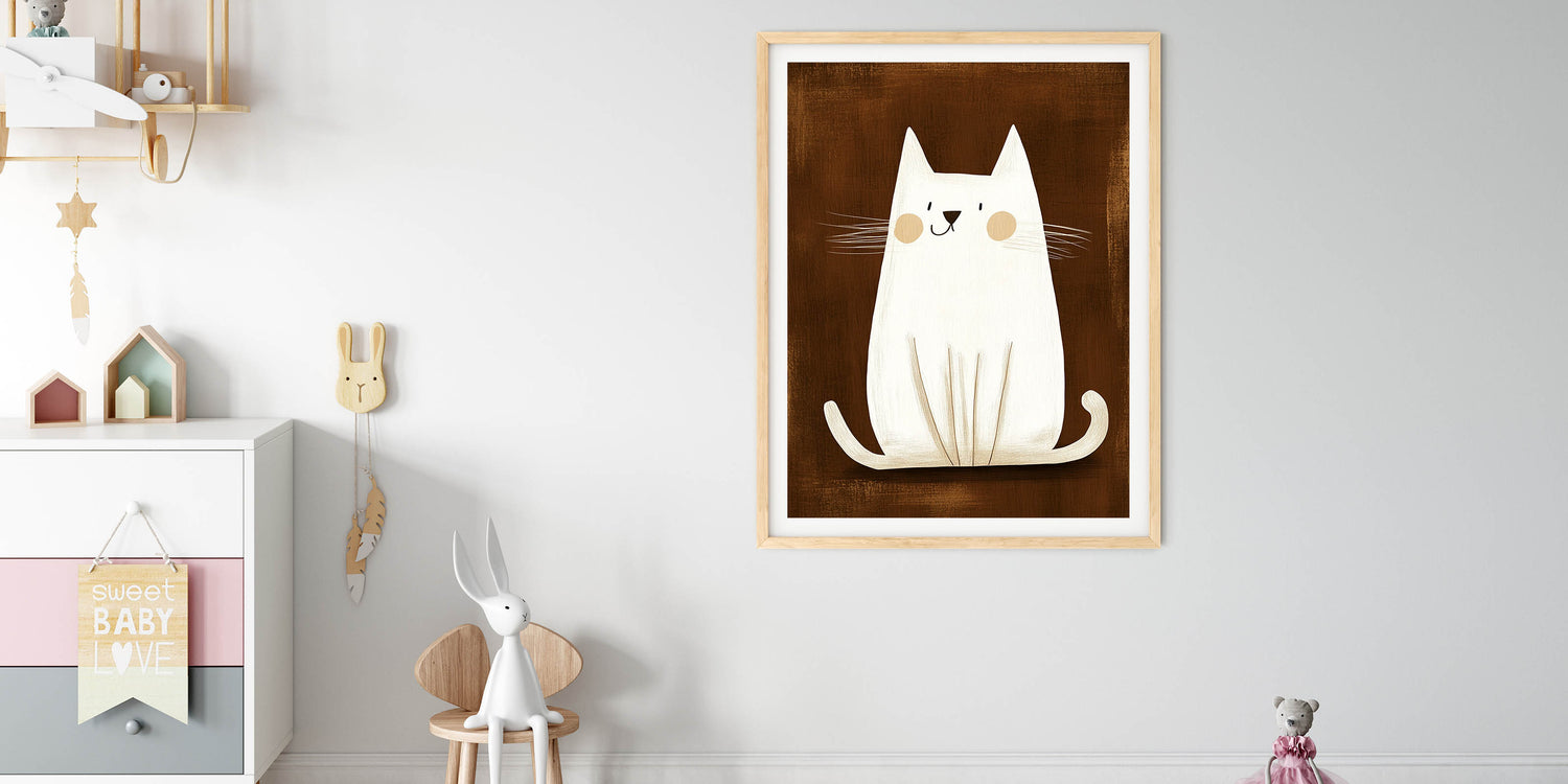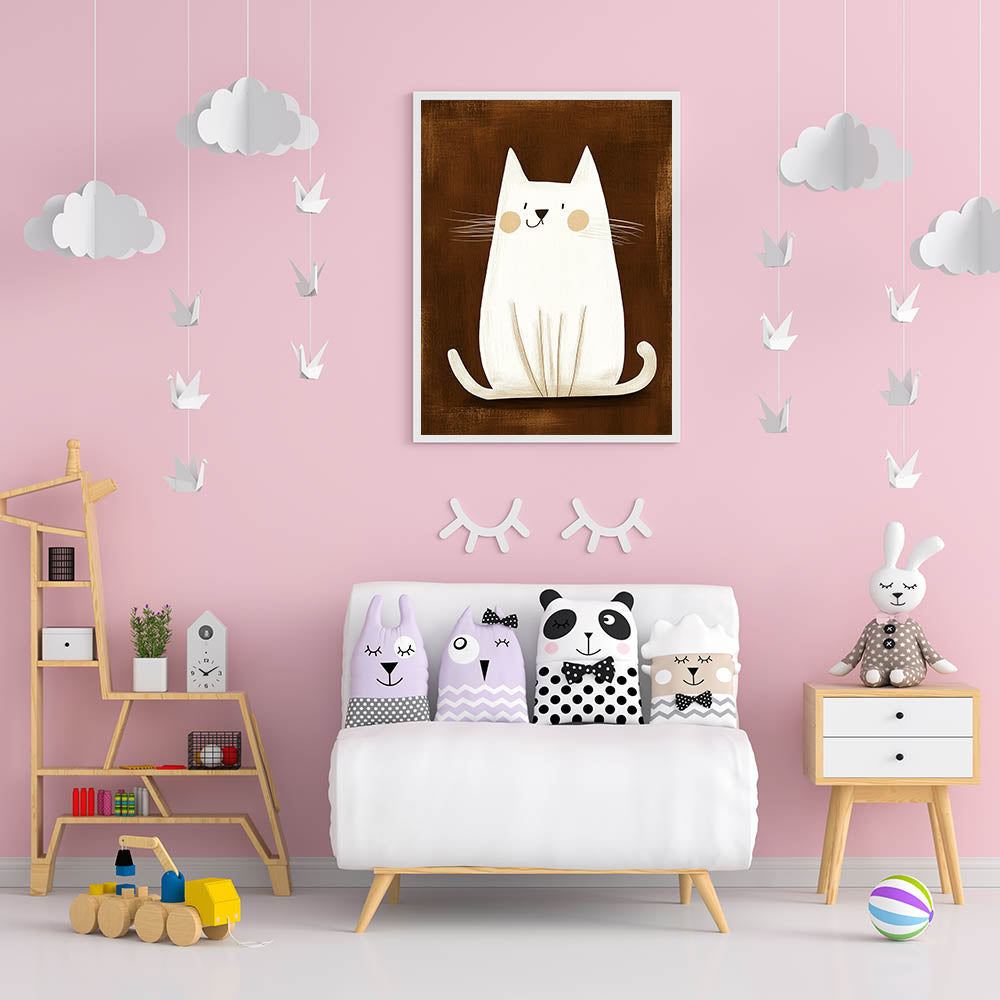 Add a whimsical touch to your child's space with this playroom wall art, featuring a cute and friendly cat illustration that brings warmth and joy to any room.
