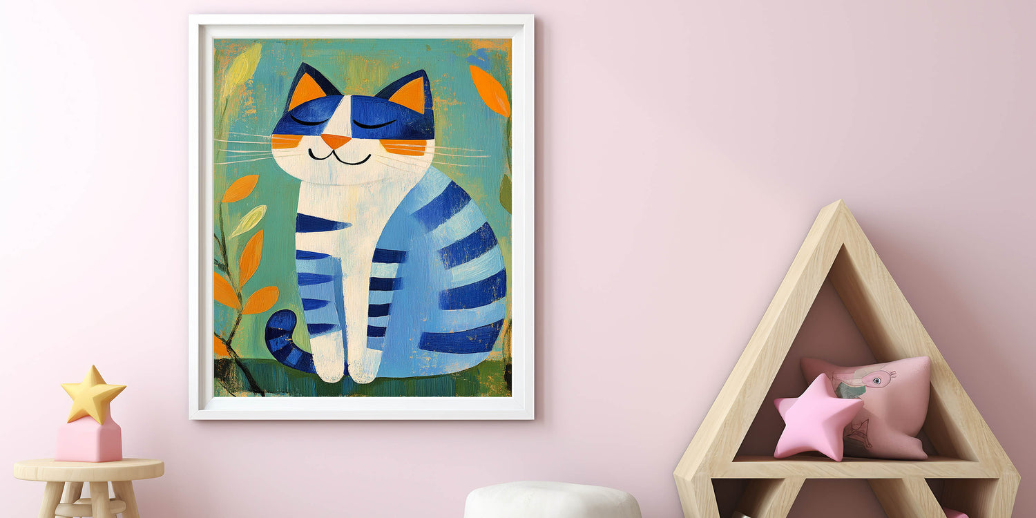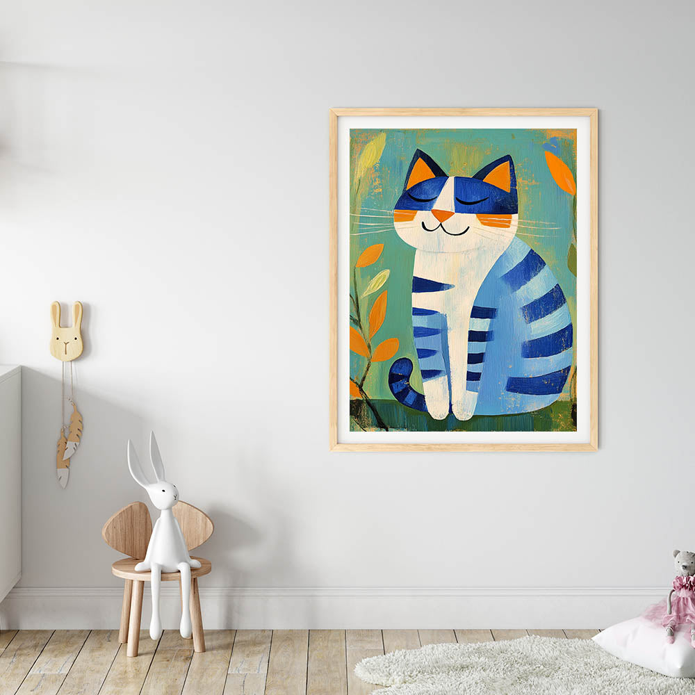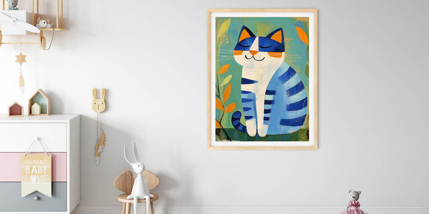 Nursery Wall Art – Playful Blue Cat Illustration for Kids' Room