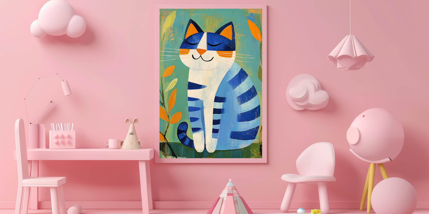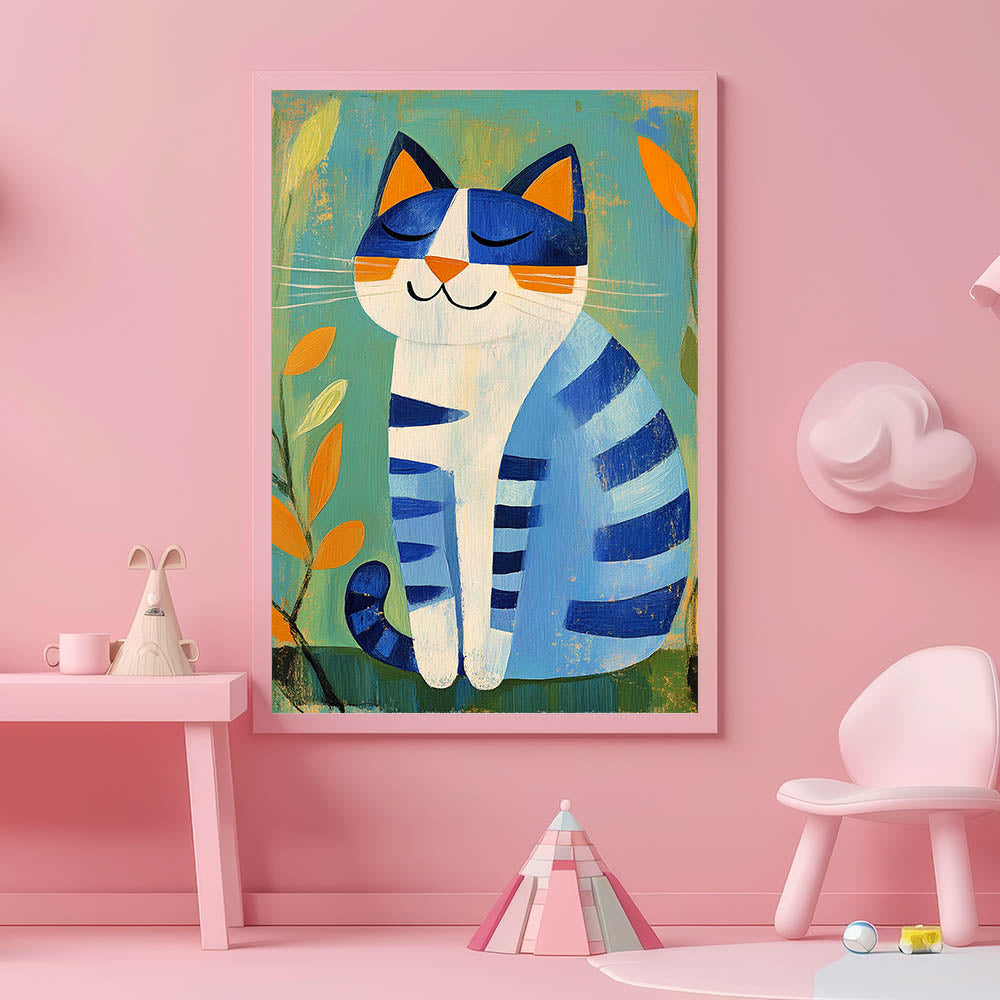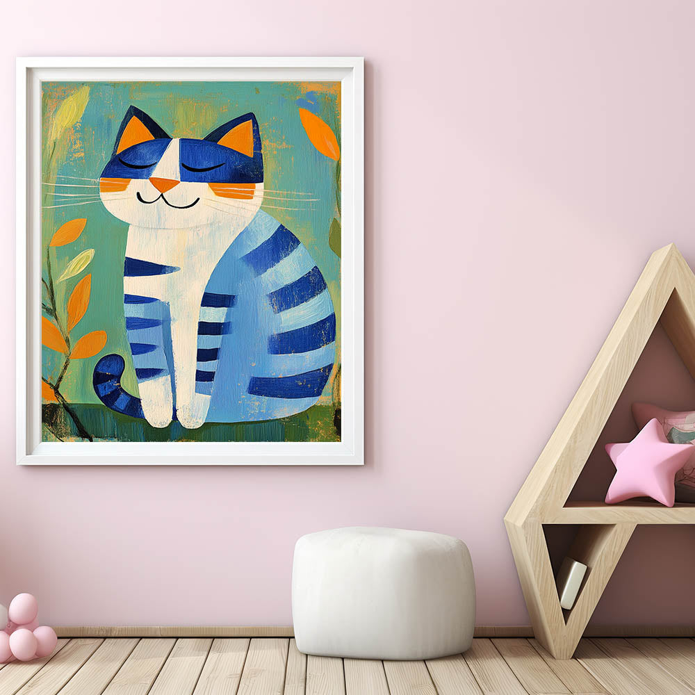 Nursery Wall Art – Playful Blue Cat Illustration for Kids' Room