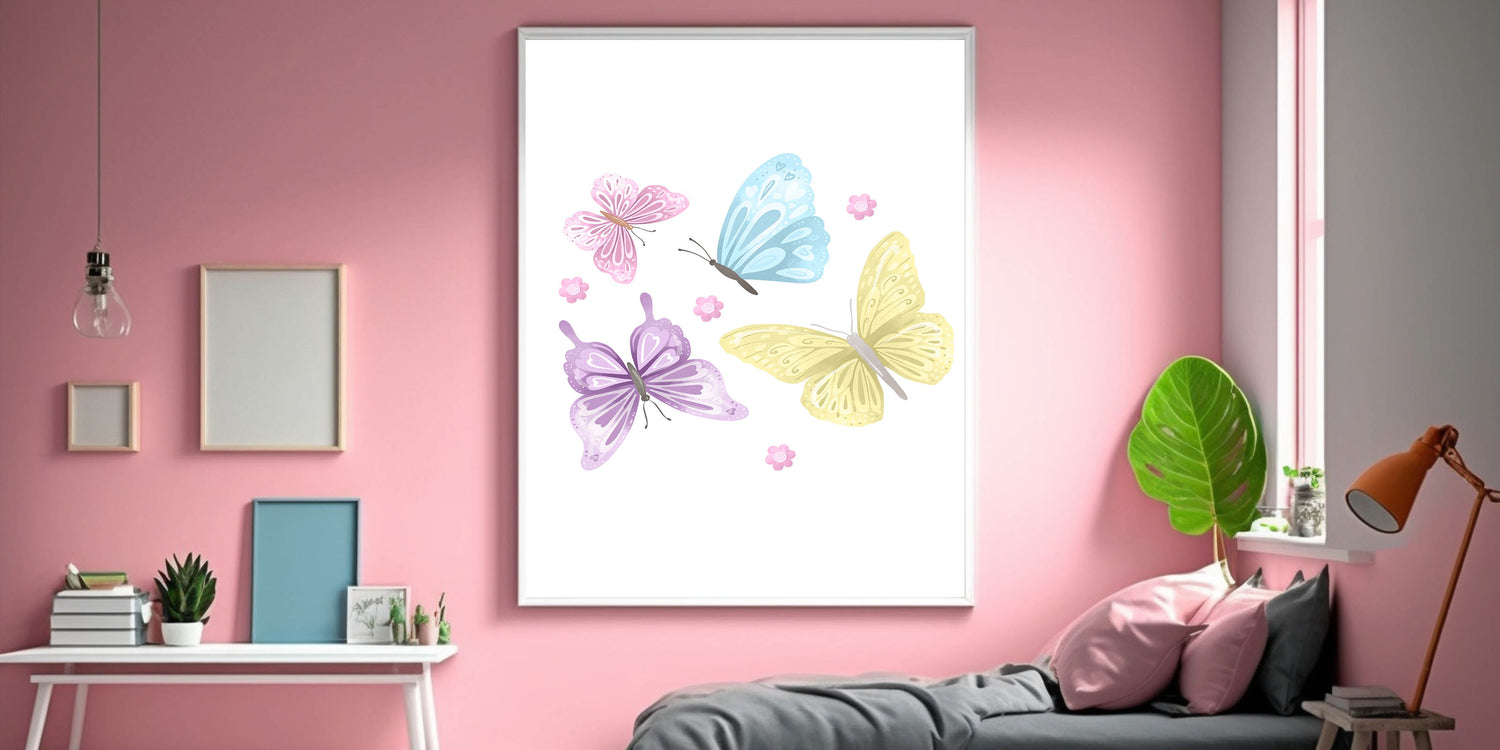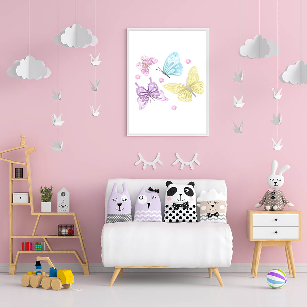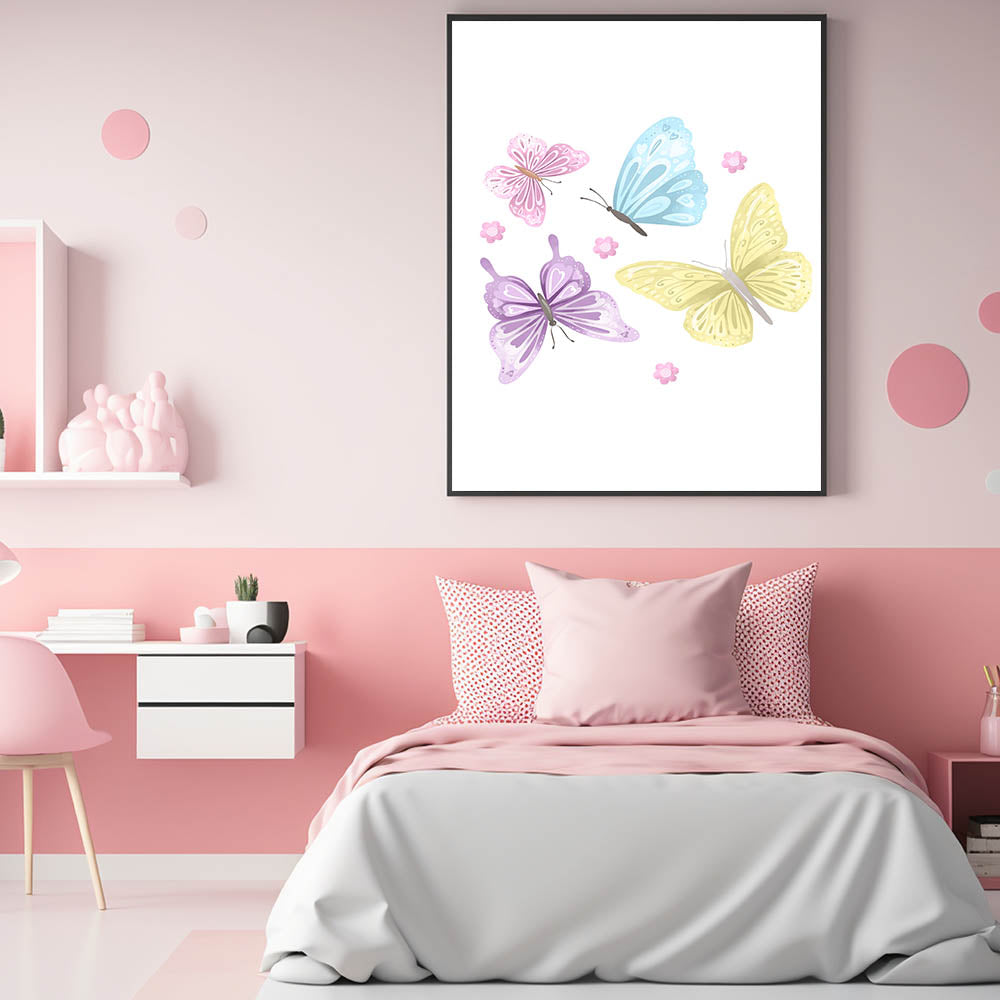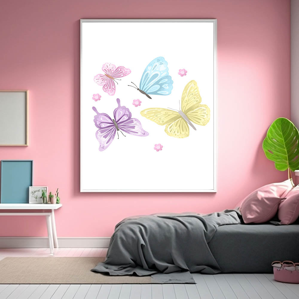 Transform your child's space into a whimsical paradise with this delicate butterfly wall art. Featuring four beautifully illustrated butterflies in pastel shades of lilac, pink, blue, and yellow, along with tiny floral details, this artwork brings a light and airy feel to nurseries, girls' bedrooms, and playrooms. The soft watercolor tones and clean white background create a dreamy and elegant atmosphere that blends effortlessly with any decor.