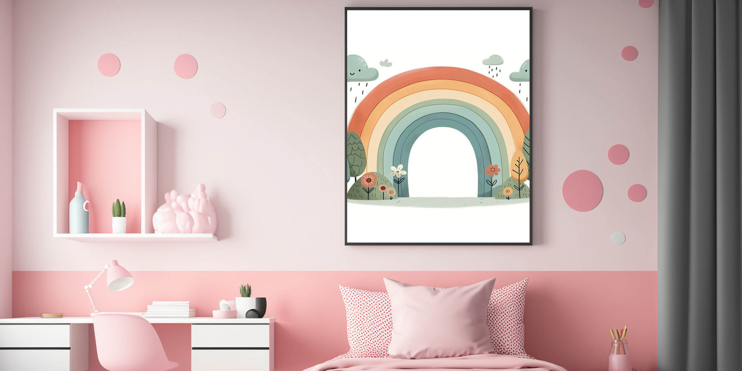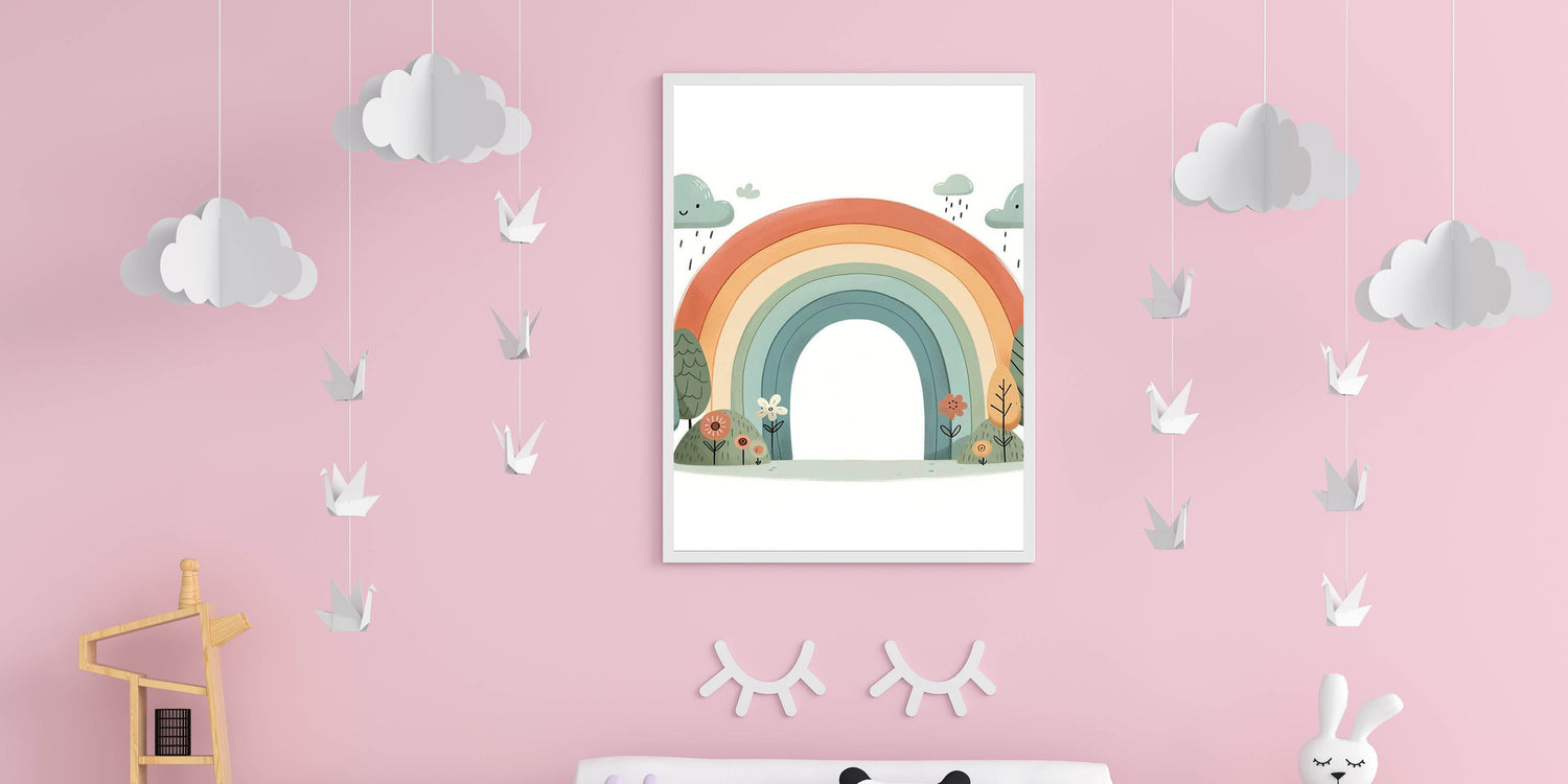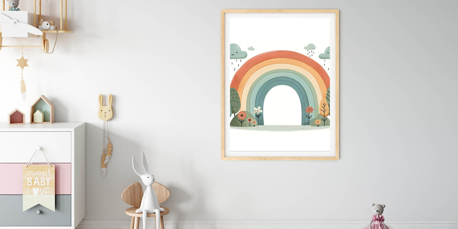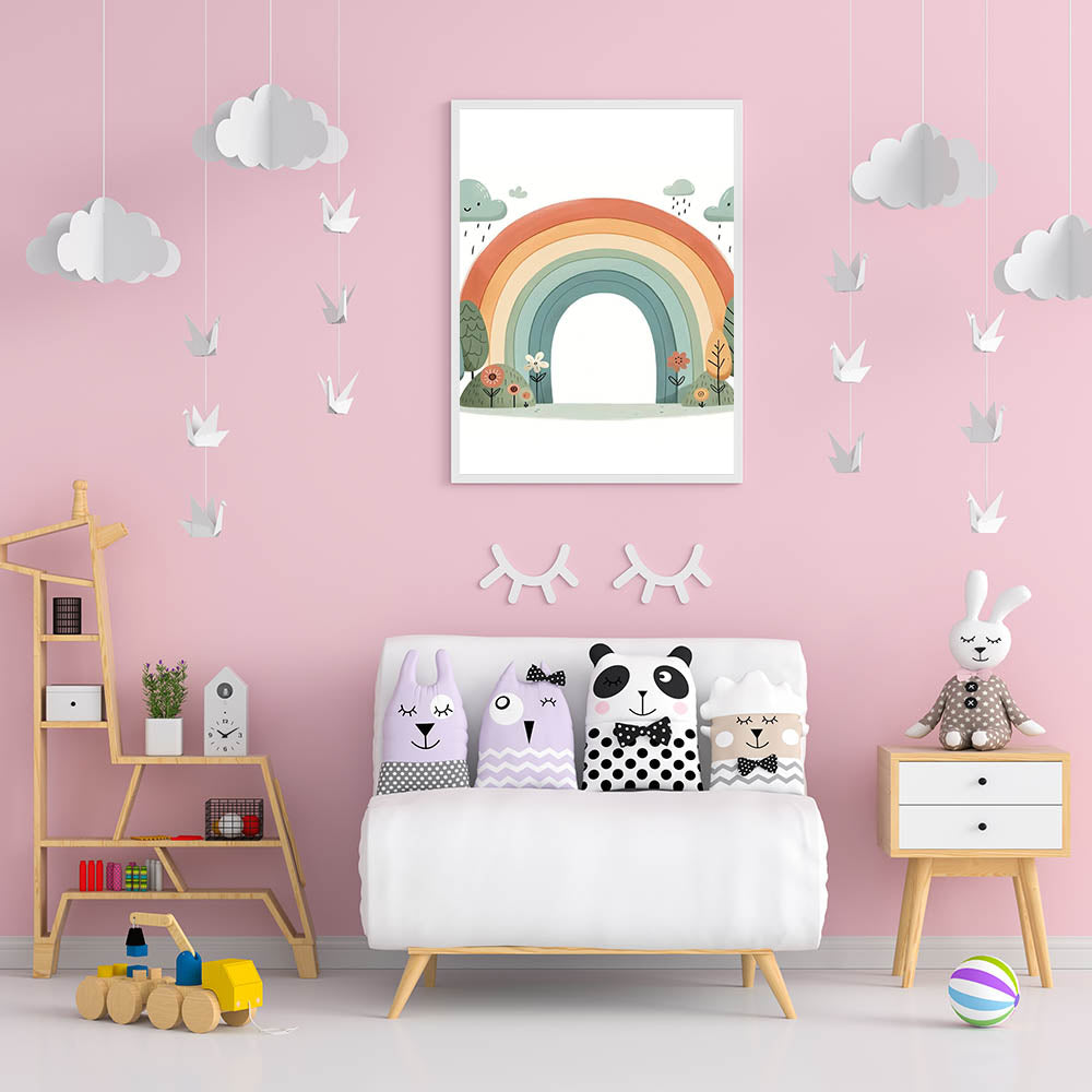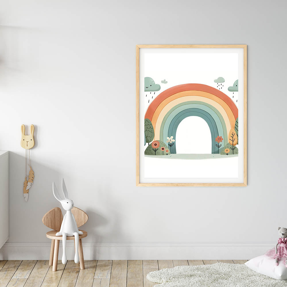 Add a soft and whimsical touch to your child’s space with this pastel rainbow illustration print, designed to bring warmth and positivity to any nursery, playroom, or kids' bedroom. Featuring a beautifully arched muted rainbow, happy little rain clouds, and lush greenery, this children's wall décor piece creates a calming and cheerful atmosphere.
