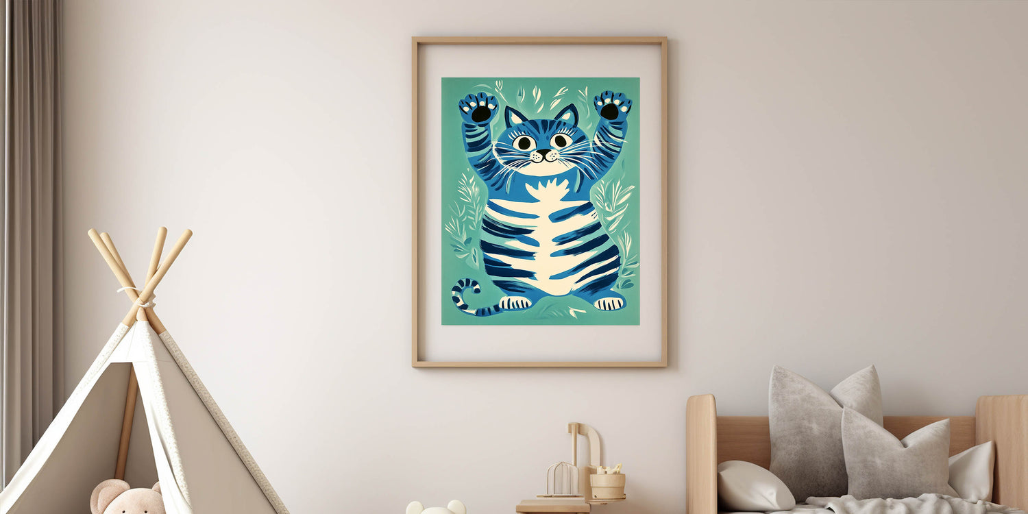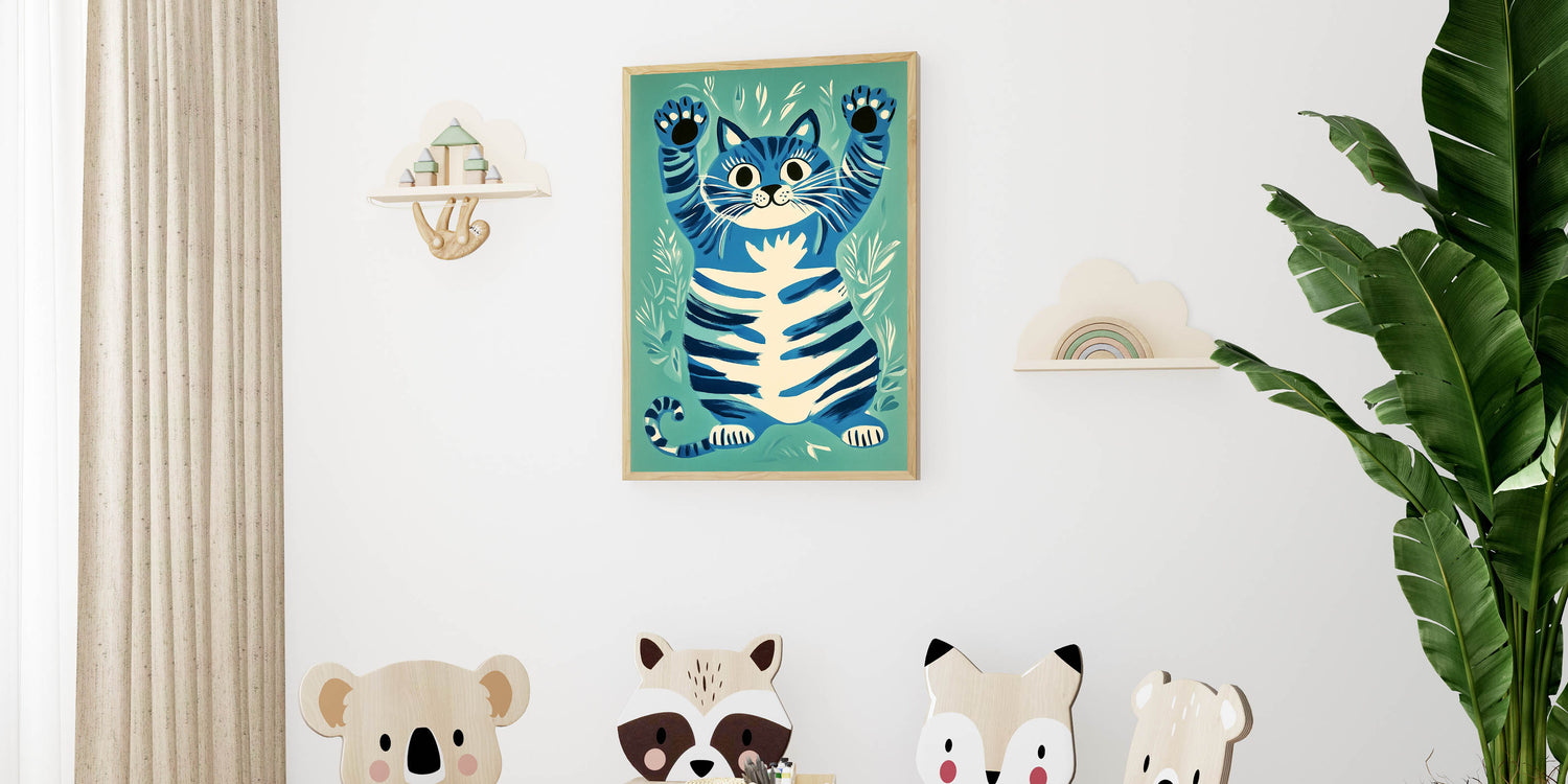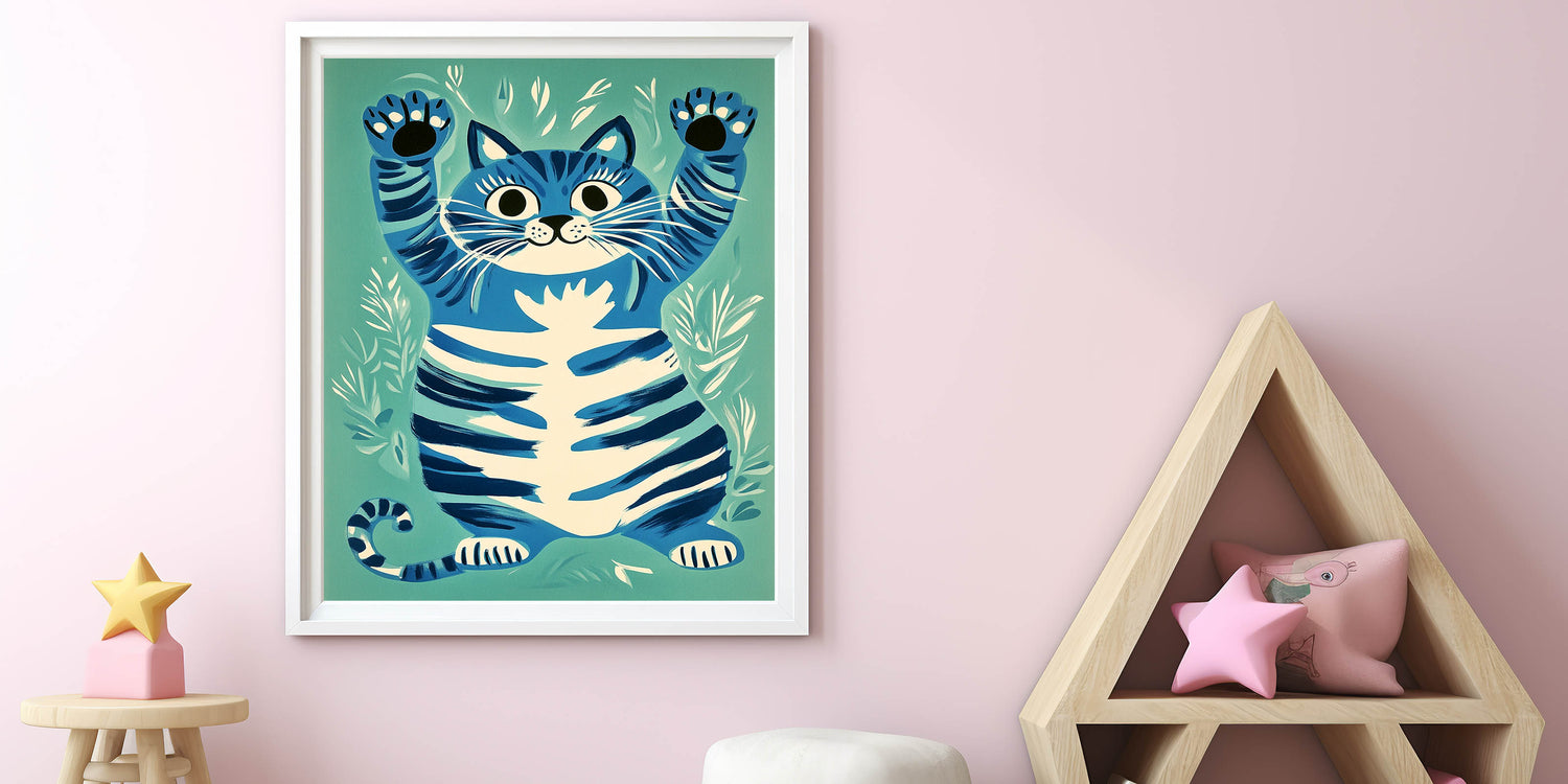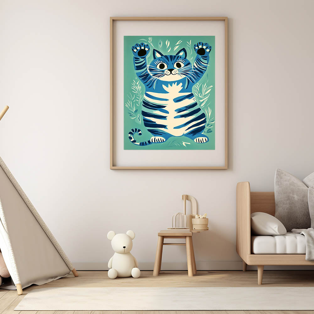Playroom Wall Art – Fun Blue Cat Illustration for Kids' Decor