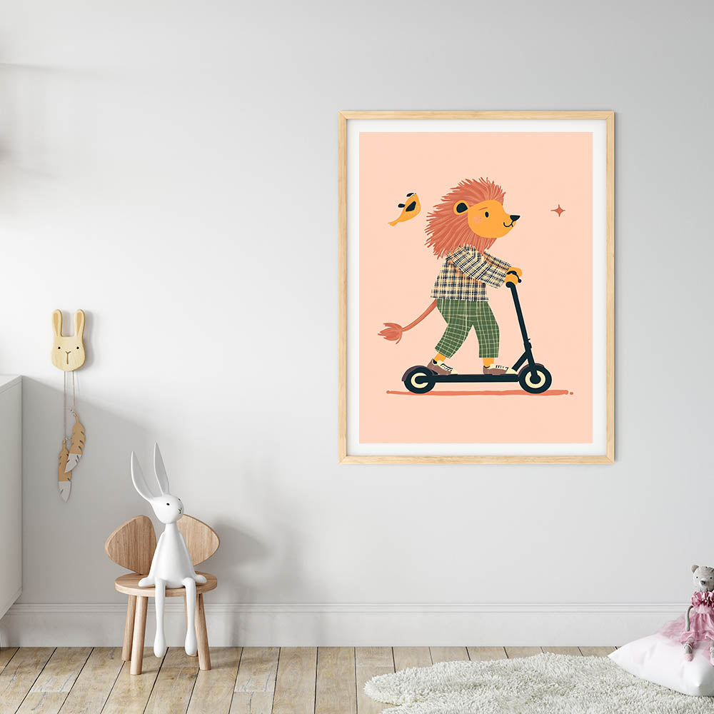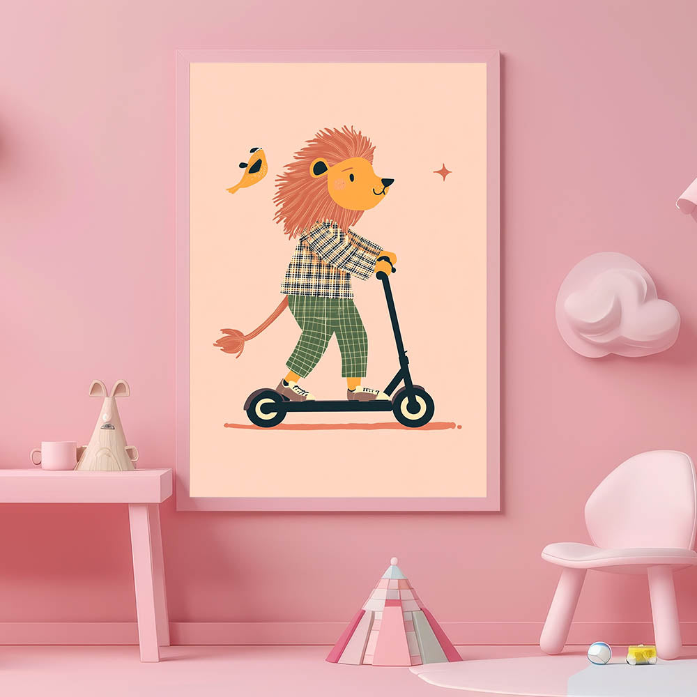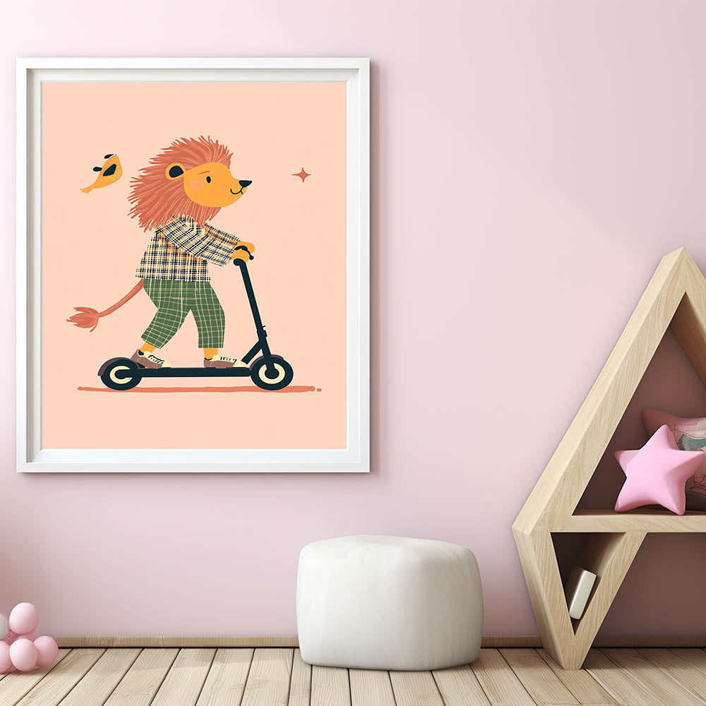 Playroom Wall Art – Trendy Lion on Scooter Illustration Print