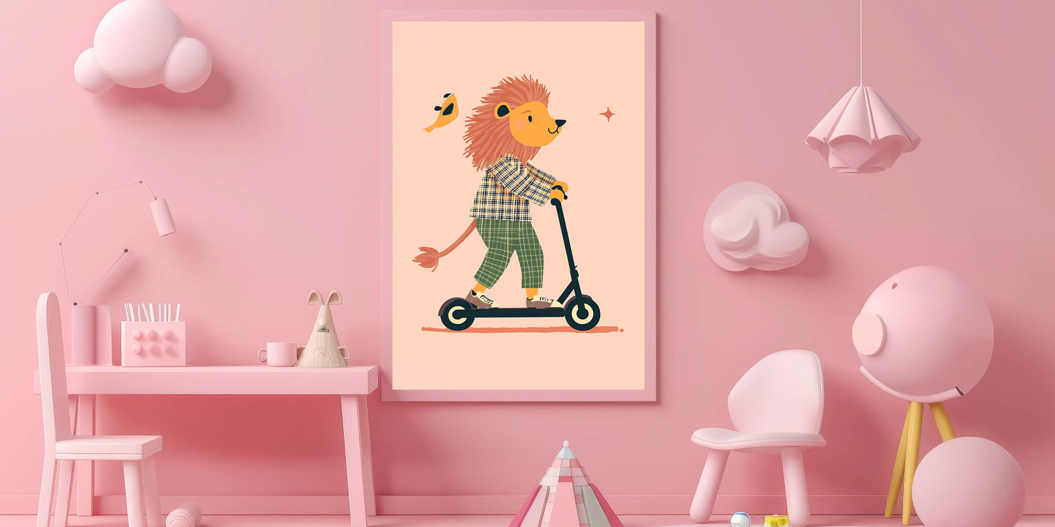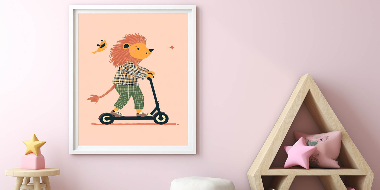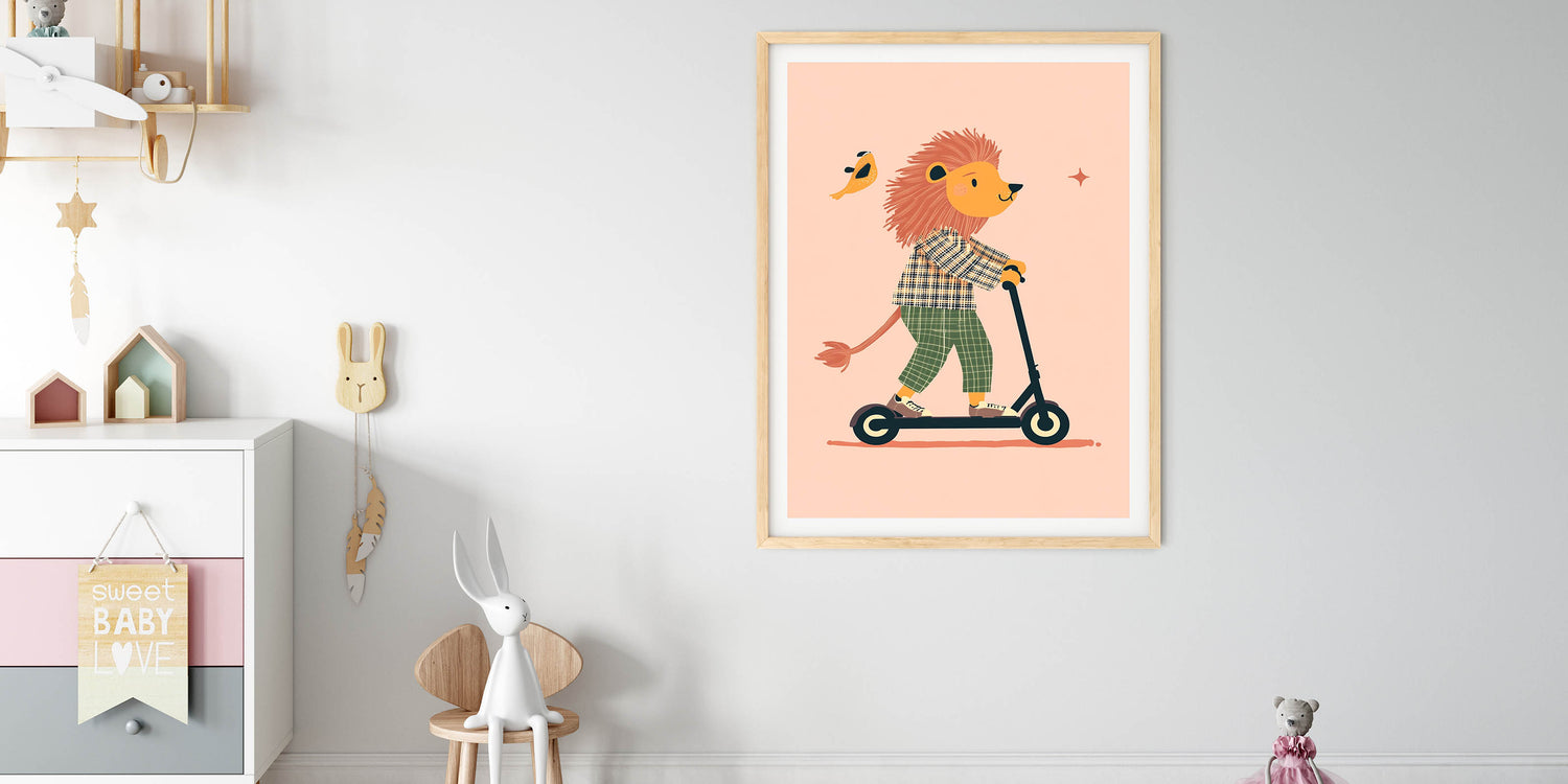 Playroom Wall Art – Trendy Lion on Scooter Illustration Print