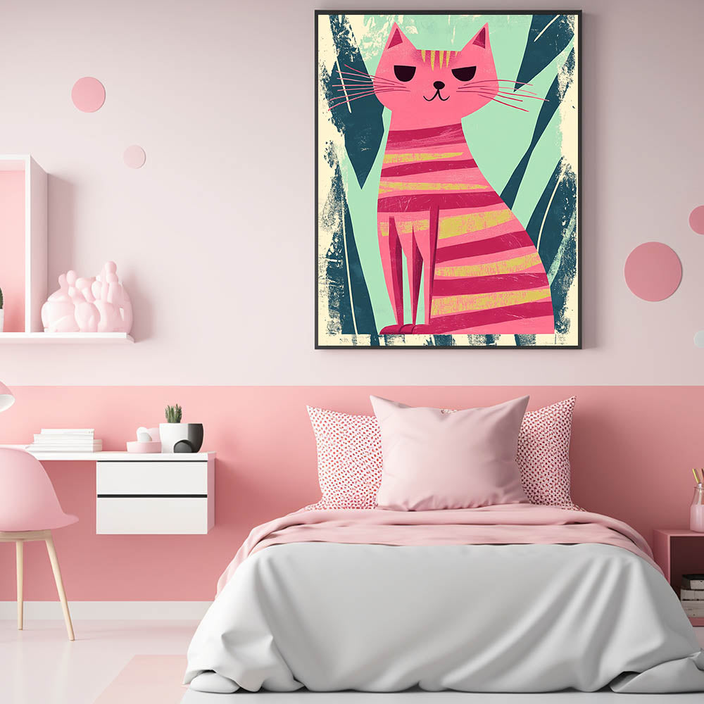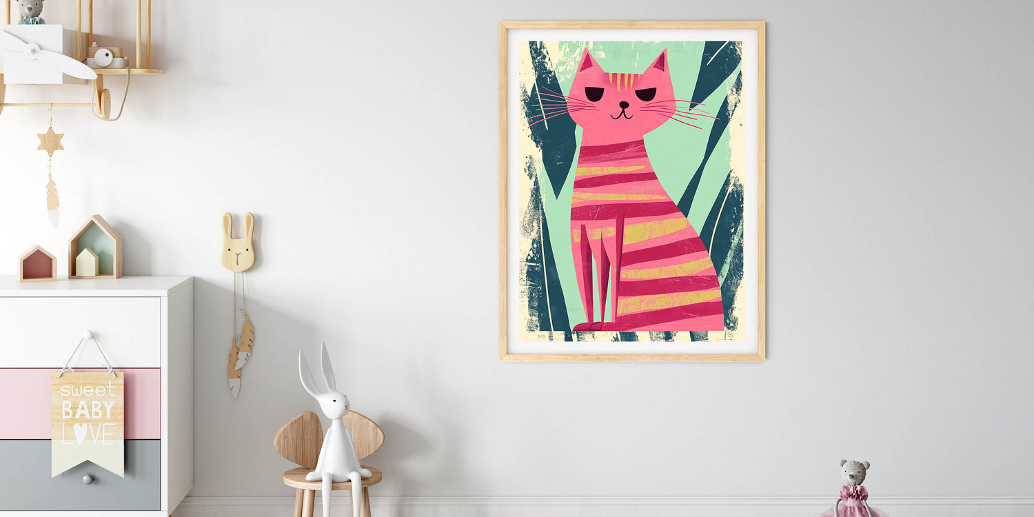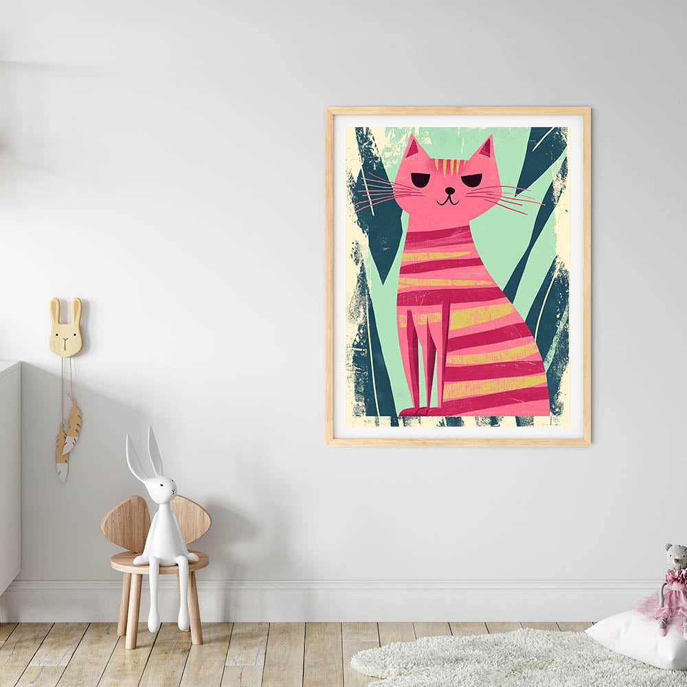 Add a touch of personality and retro charm to your child’s space with this bold striped cat illustration print, designed to bring a unique and artistic feel to any nursery, playroom, or kids' bedroom. Featuring a confident pink cat with yellow stripes against a textured teal and green jungle backdrop, this children's wall décor piece adds a fun and expressive statement to any space.