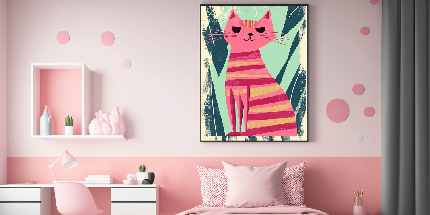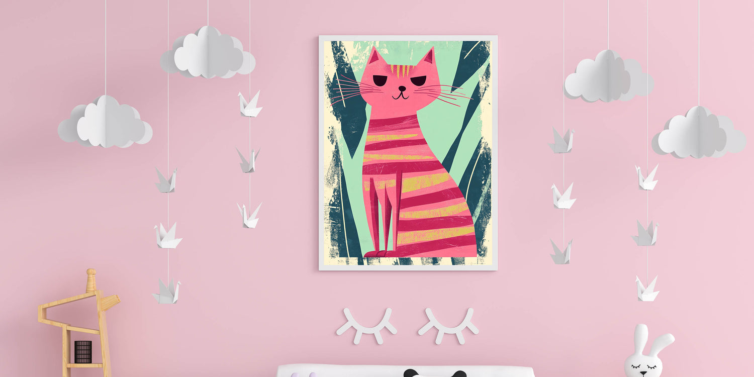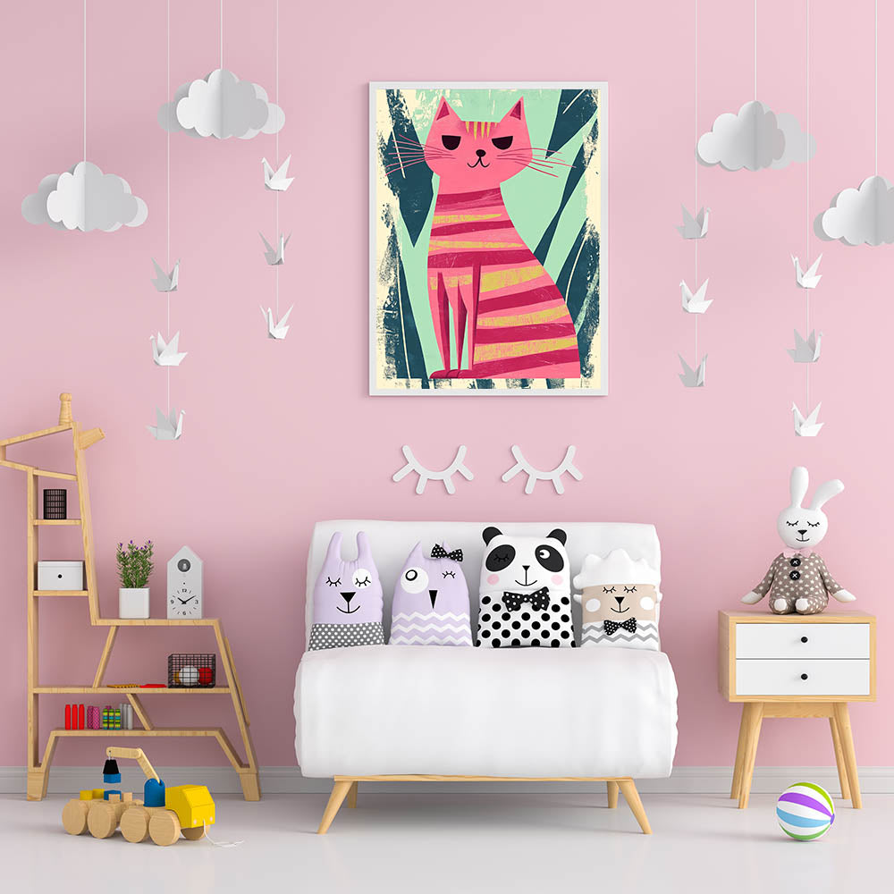 Add a touch of personality and retro charm to your child’s space with this bold striped cat illustration print, designed to bring a unique and artistic feel to any nursery, playroom, or kids' bedroom. Featuring a confident pink cat with yellow stripes against a textured teal and green jungle backdrop, this children's wall décor piece adds a fun and expressive statement to any space.