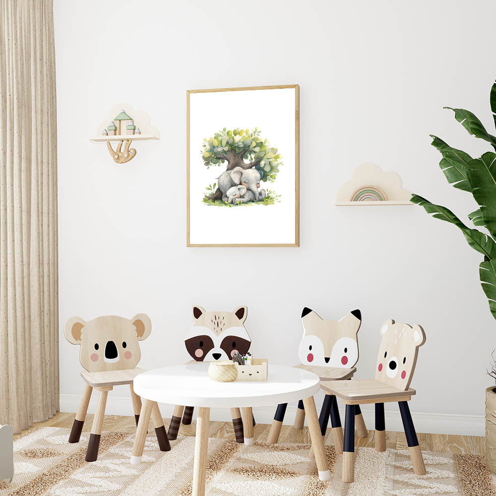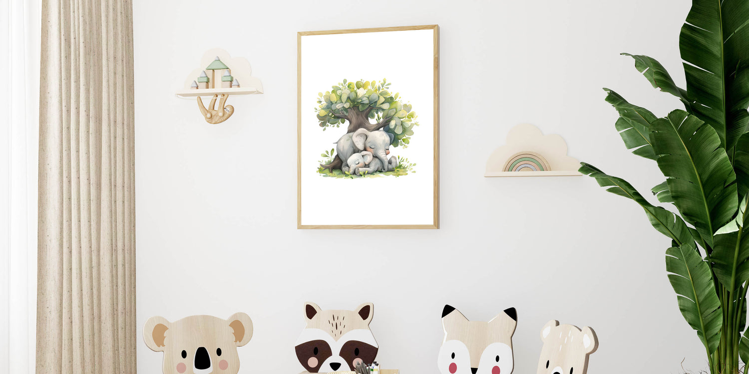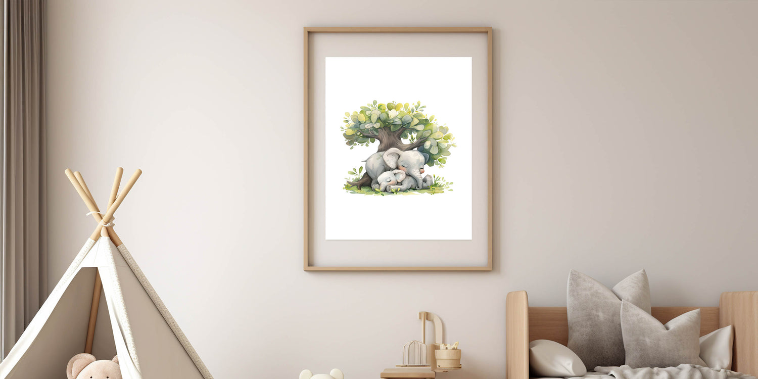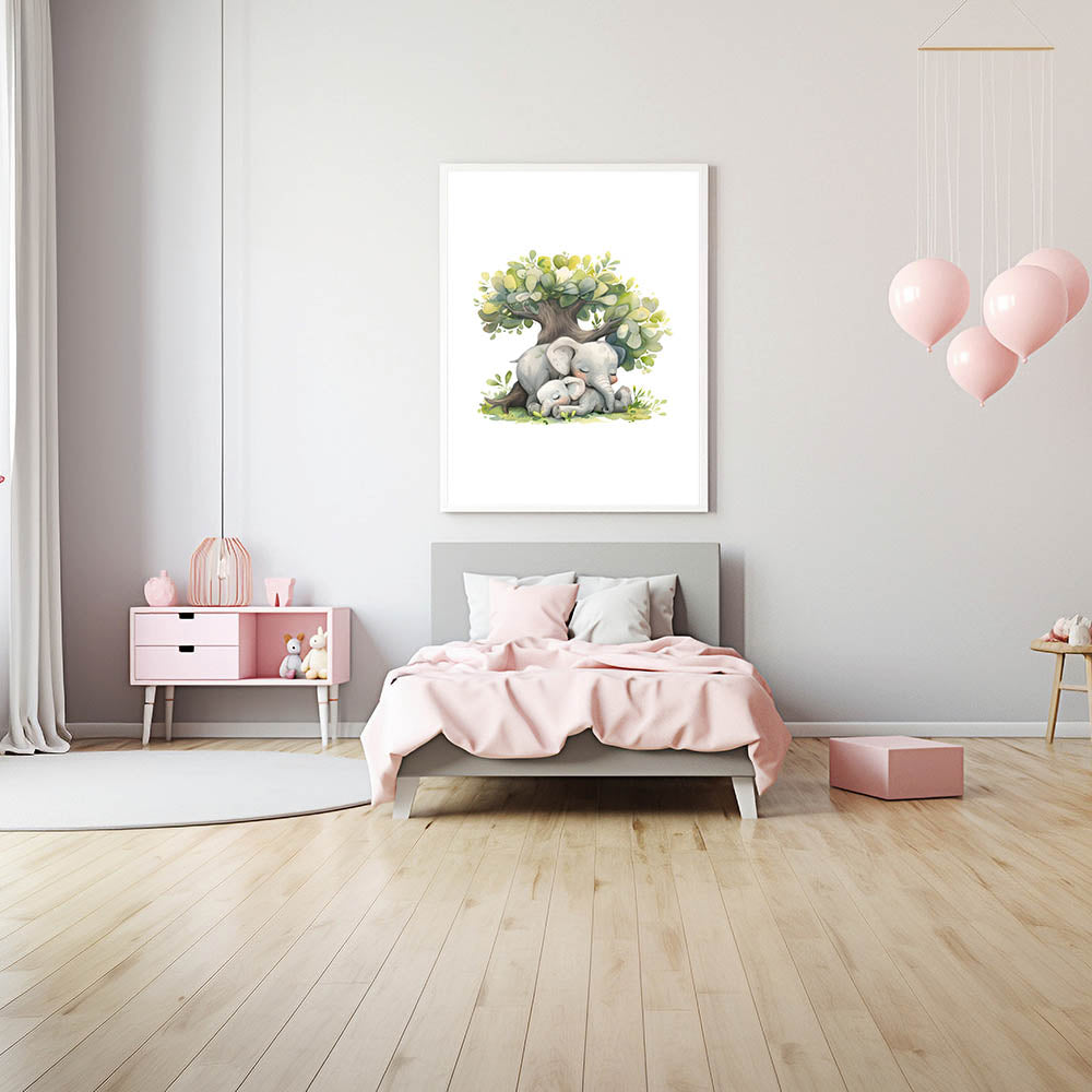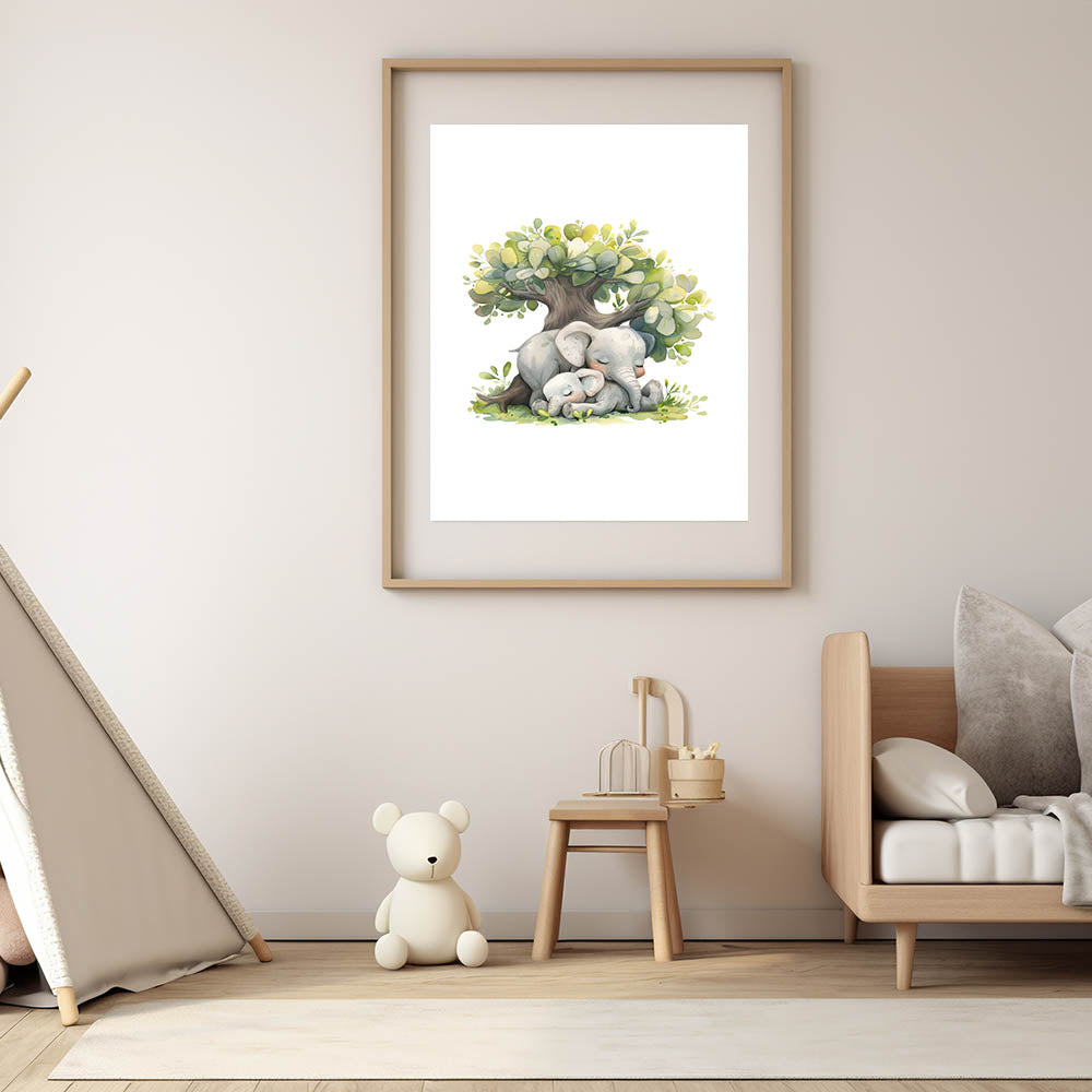 Create a serene and loving space for your little one with this "Sleeping Elephants" wall art. Featuring a heartwarming watercolor illustration of a mother and baby elephant peacefully resting under a lush green tree, this artwork embodies warmth, comfort, and the beauty of nature. The soft gray and green tones, combined with the delicate foliage, make it a soothing addition to nurseries, girls' bedrooms, and playrooms.