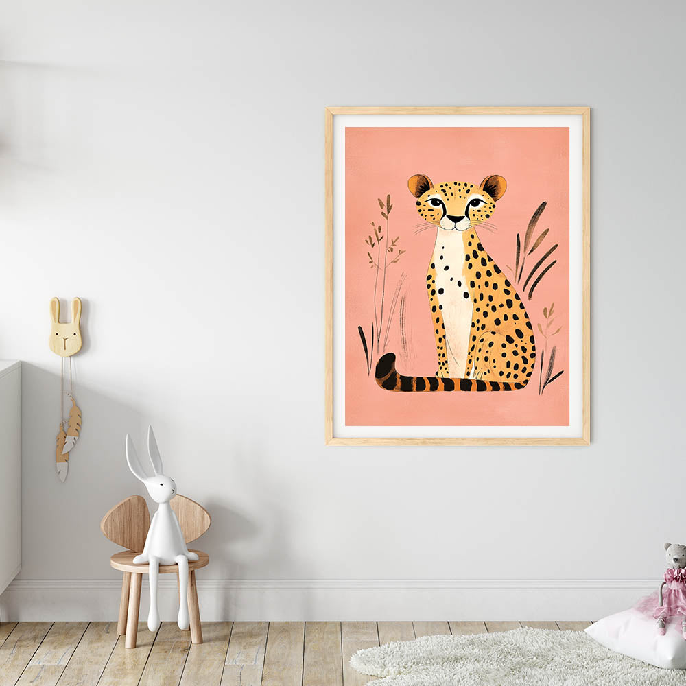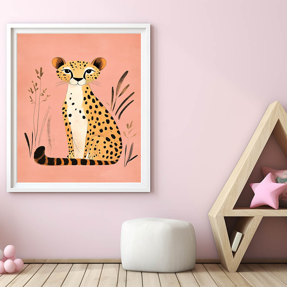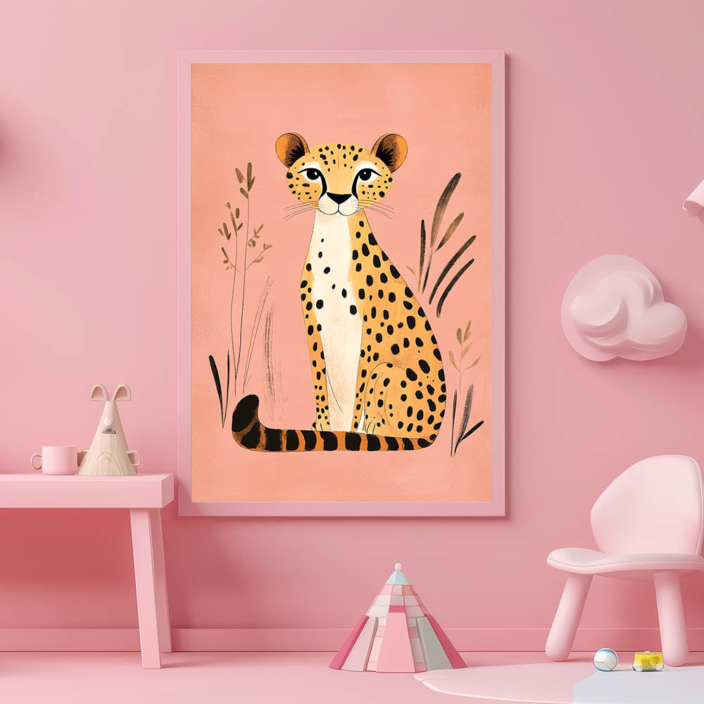 Bring a touch of wild beauty to your child's space with this elegant cheetah illustration print, designed to add a stylish and adventurous feel to any nursery, playroom, or kids' bedroom. Featuring a graceful cheetah with bold black spots, warm golden tones, and a soft pink background, this children's wall décor piece blends modern minimalism with nature’s charm.
