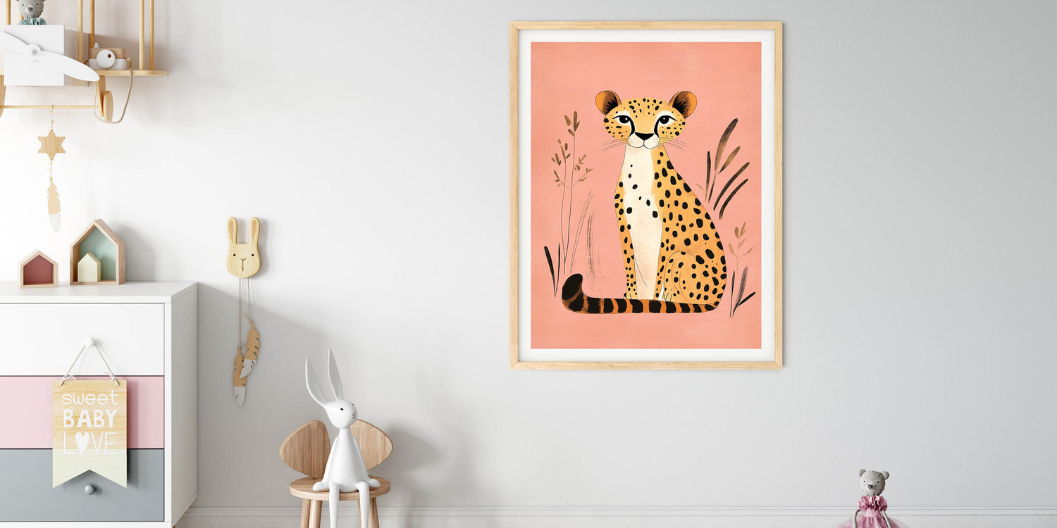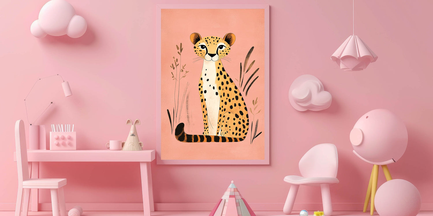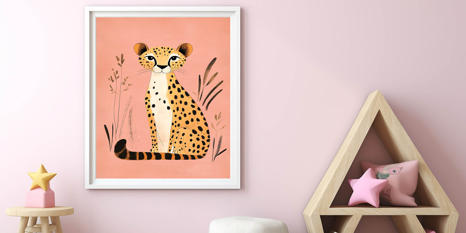 Bring a touch of wild beauty to your child's space with this elegant cheetah illustration print, designed to add a stylish and adventurous feel to any nursery, playroom, or kids' bedroom. Featuring a graceful cheetah with bold black spots, warm golden tones, and a soft pink background, this children's wall décor piece blends modern minimalism with nature’s charm.